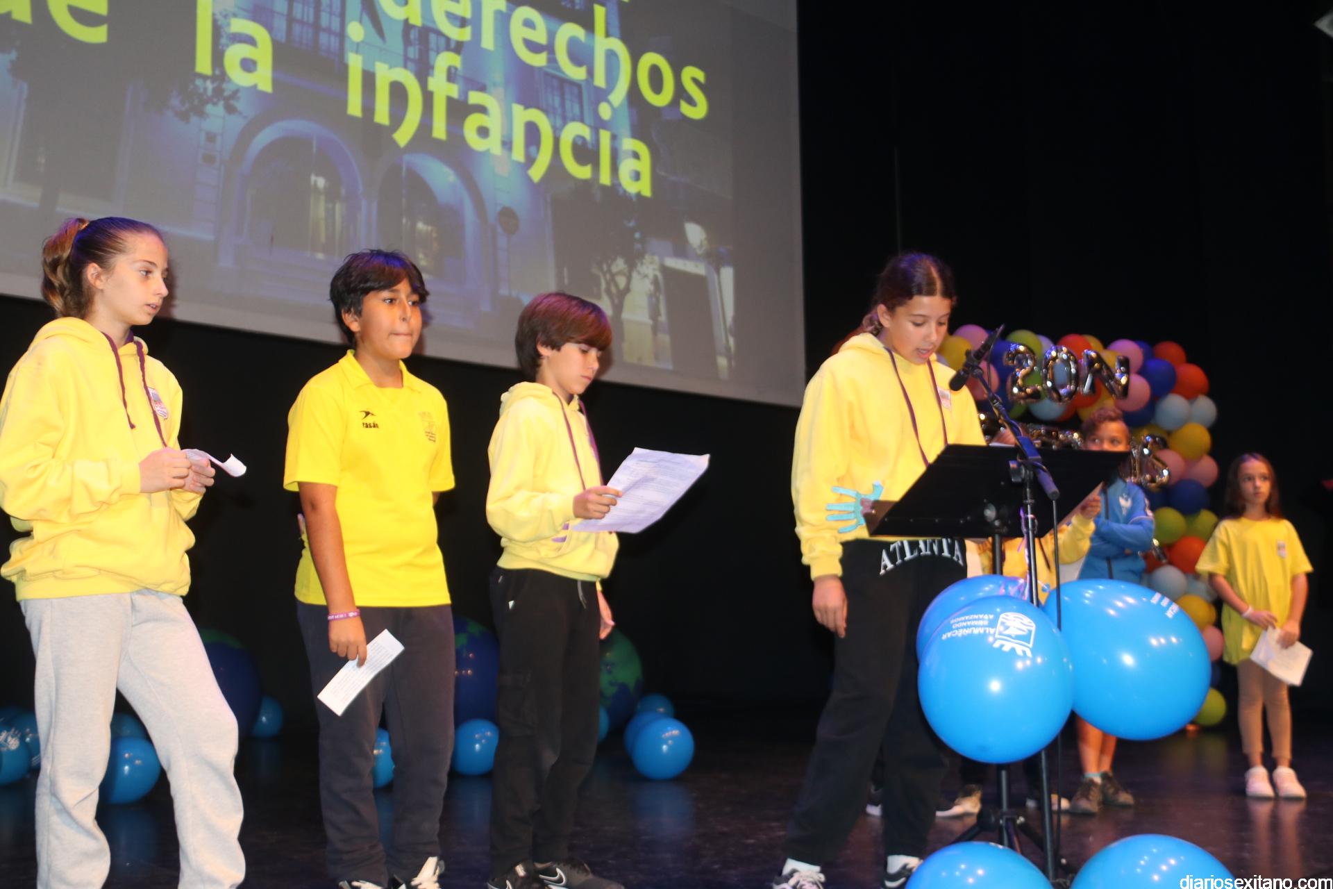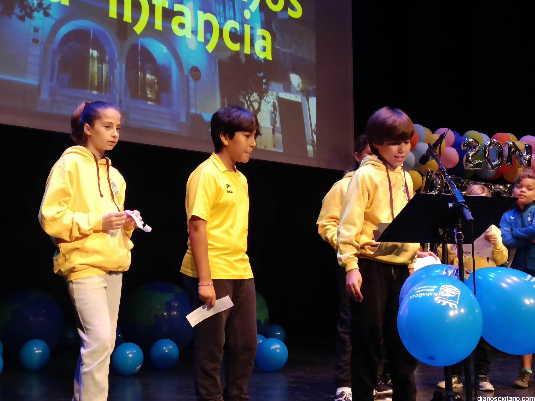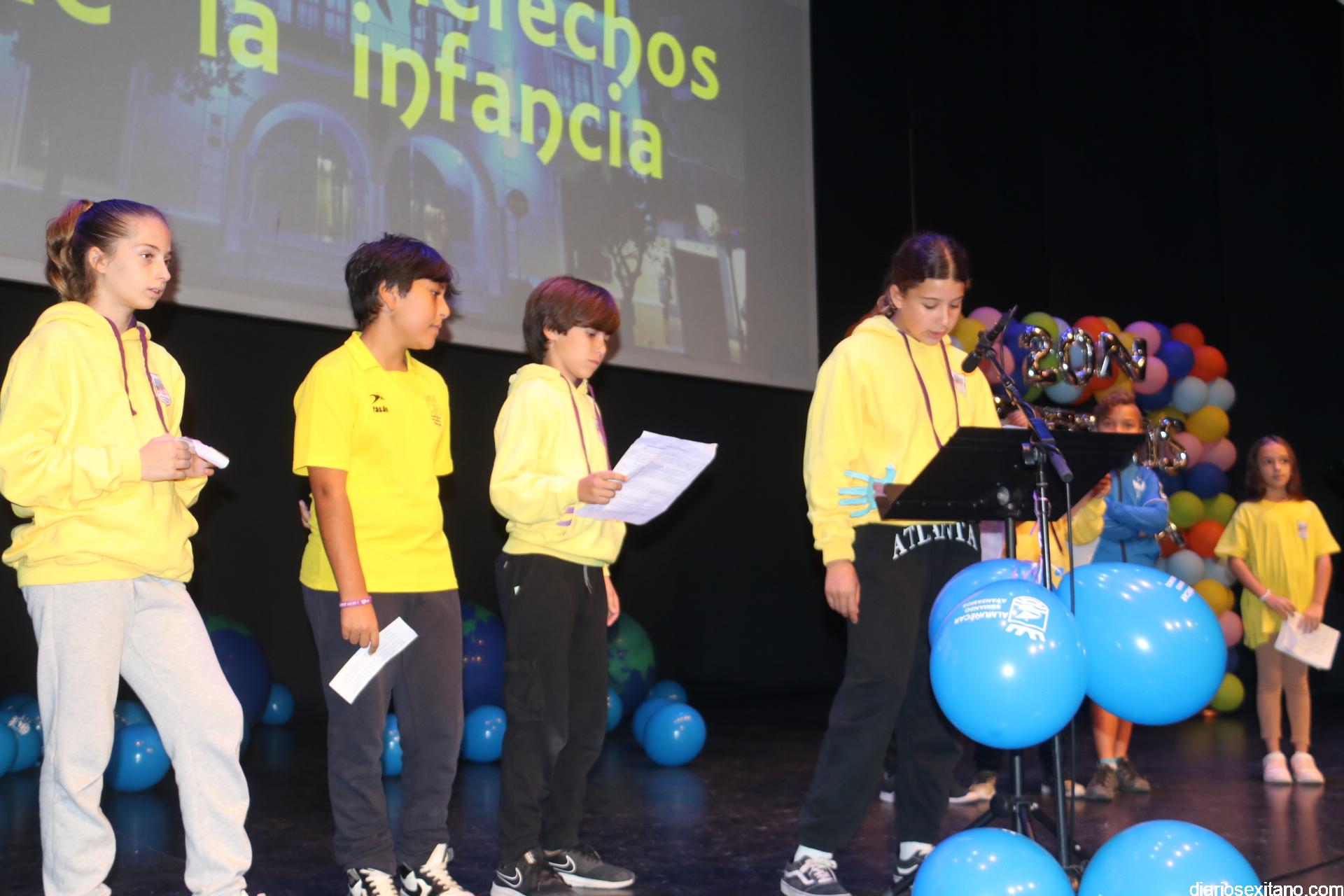 El auditorio de la Casa del Cultura ha sido testigo de la lectura de los Derechos de los niños y niñas que han realizado una amplia representación de pequeños sexitanos ante sus compañeros y representantes municipales encabezados por el alcalde, Juan José Ruiz Joya, acompañado de la edil de Servicios Sociales e Infancia, Maria del Carmen Reinoso, junto con los también concejales, Beatriz González y Javier García.