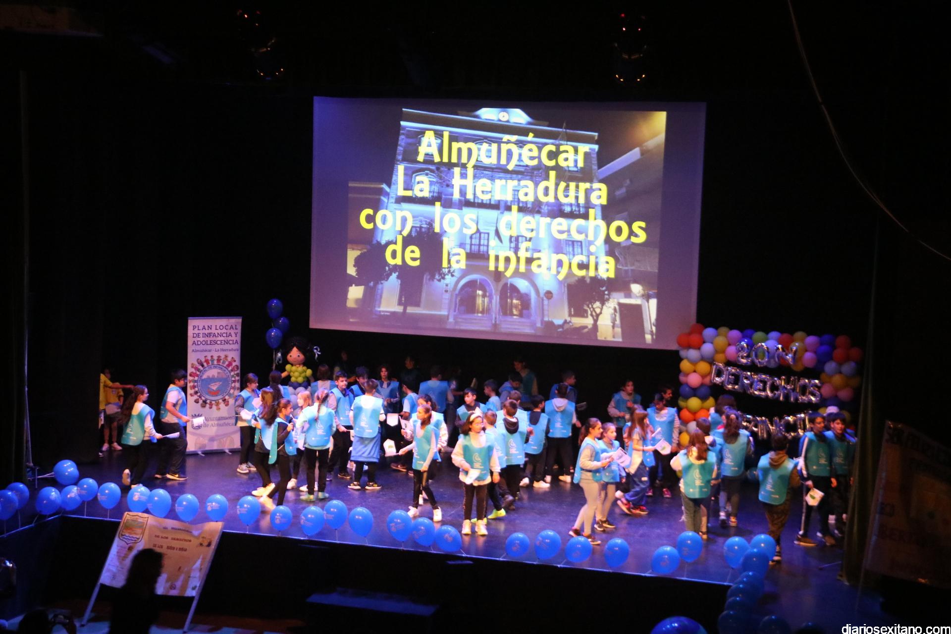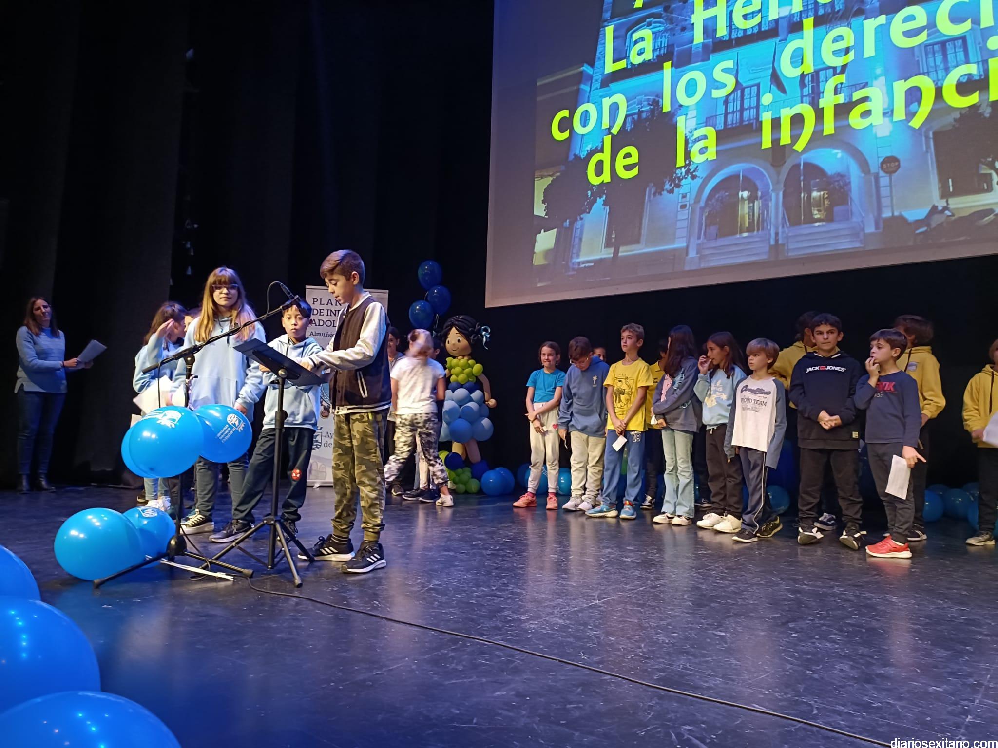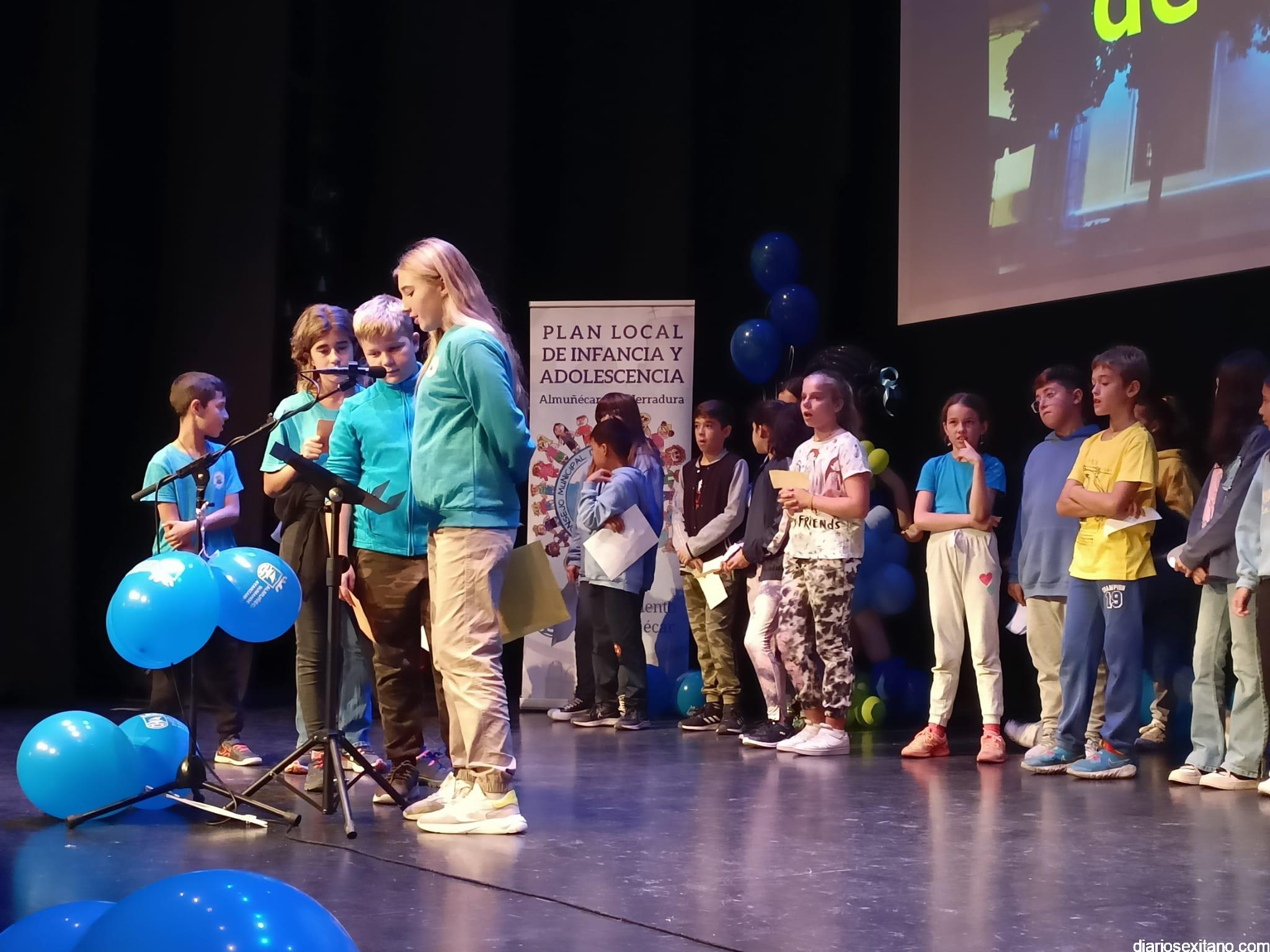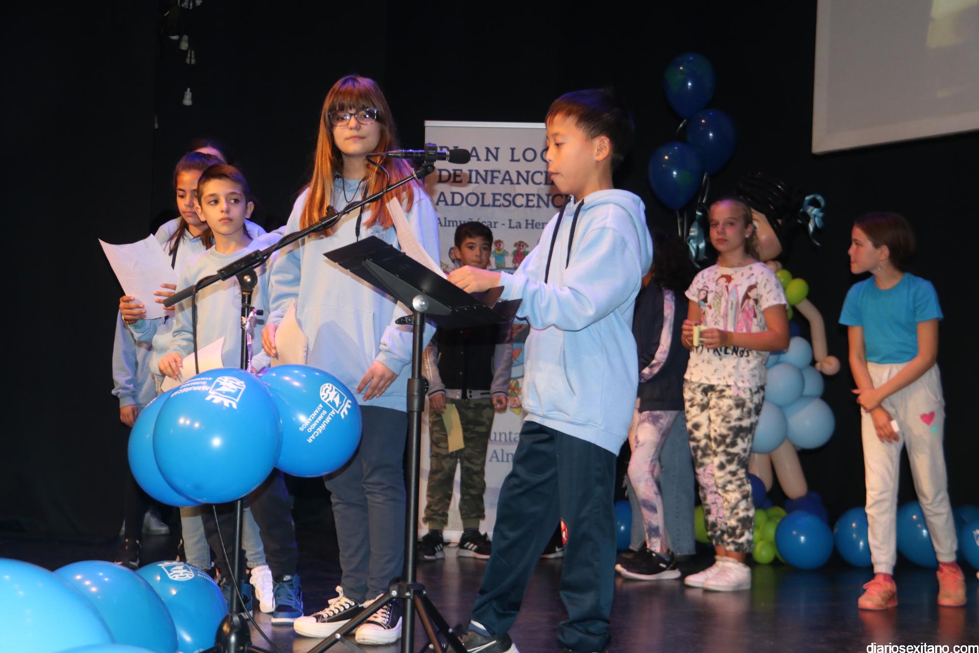 El auditorio de la Casa del Cultura ha sido testigo de la lectura de los Derechos de los niños y niñas que han realizado una amplia representación de pequeños sexitanos ante sus compañeros y representantes municipales encabezados por el alcalde, Juan José Ruiz Joya, acompañado de la edil de Servicios Sociales e Infancia, Maria del Carmen Reinoso, junto con los también concejales, Beatriz González y Javier García.