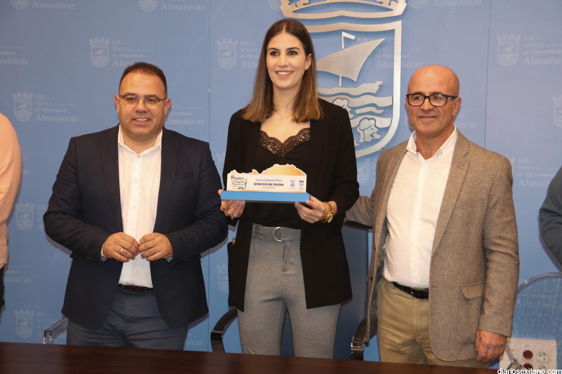 El alcalde de Almuñécar, Juan José Ruiz Joya, ha entregado este lunes el premio de “Sexitana de Oro” a la jugadora internacional de balonmano, Irene Espínola, que milita actualmente en el equipo Rapid de Bucarest (Rumanía). El galardón acordado por el Área Municipal de Deportes quiso reconocer a la jugadora en la gala de los “Premios del Deporte” de Almuñécar y La Herradura, que celebró la semana pasada y a la que Irene no pudo asistir porque disputaba un encuentro.