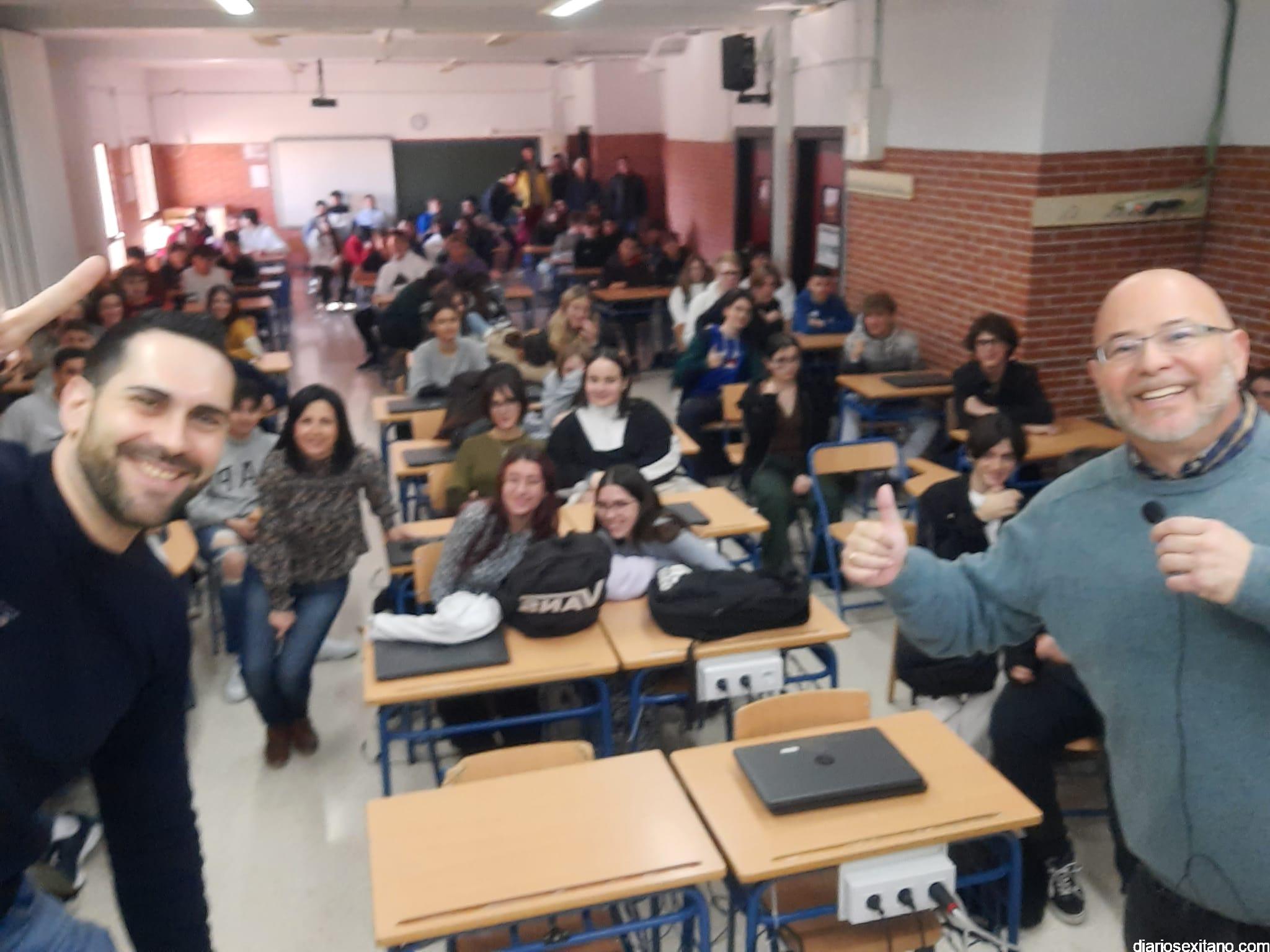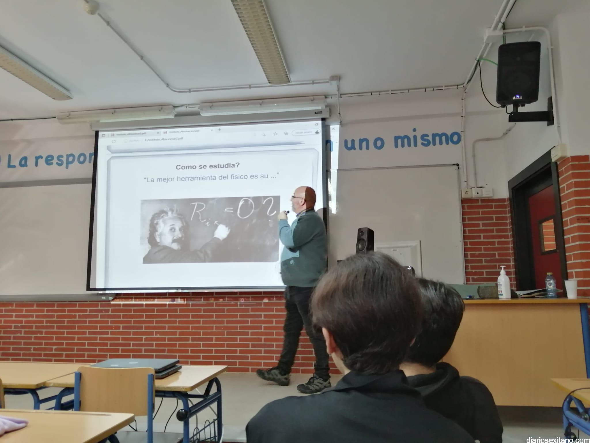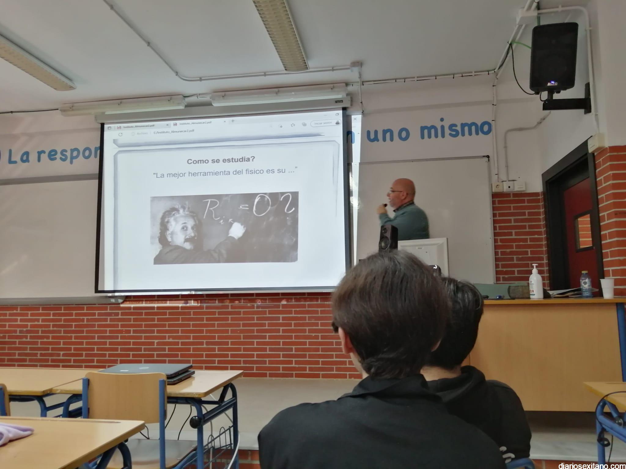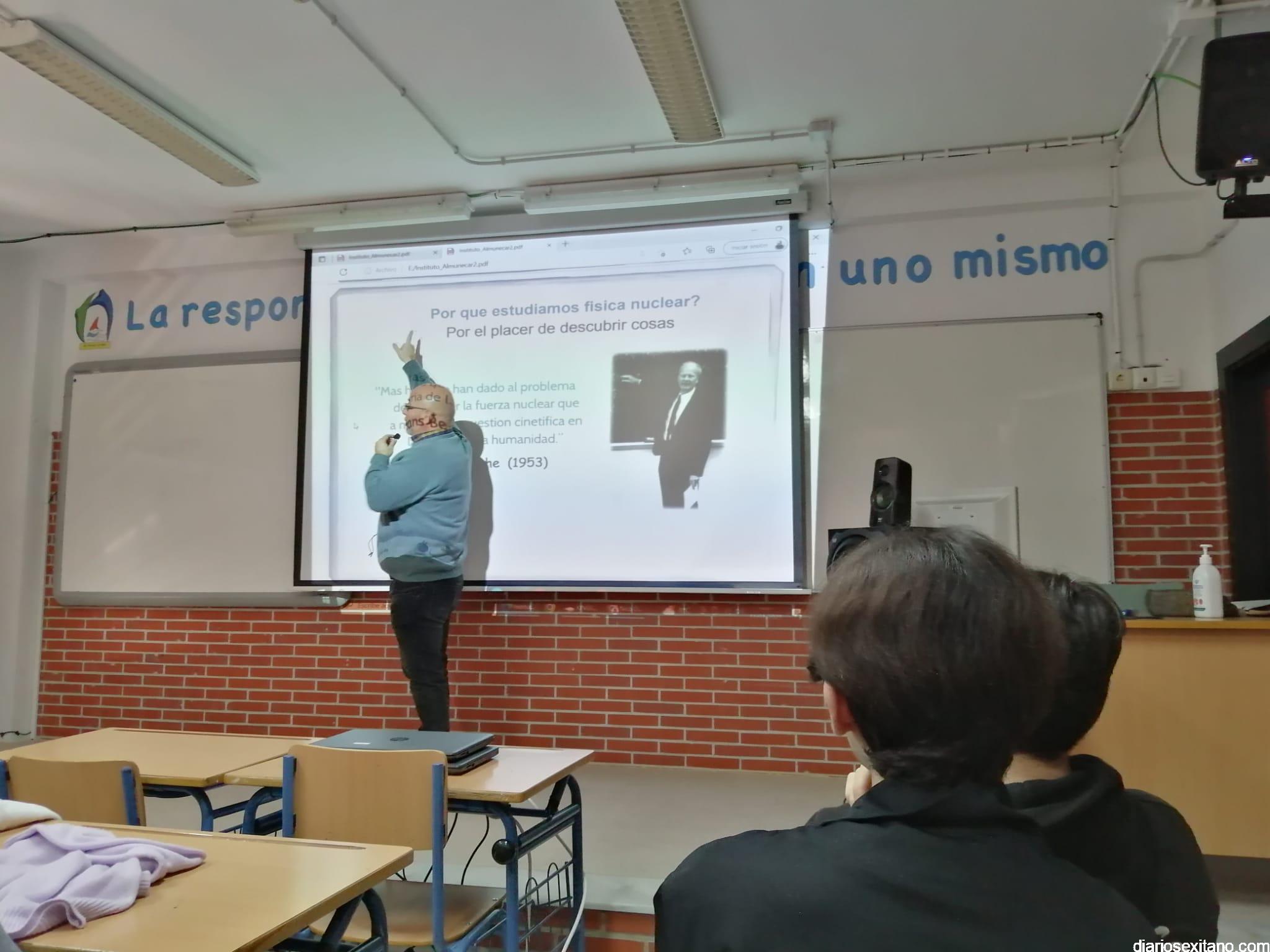 El profesor sexitano de Física Nuclear y Astrofísico Nicolás Orce González ha impartido “una fantástica” una conferencia este miércoles en el IES Puerta de Almuñécar a los alumnos de Ciencias de 3⁰ y 4⁰ de ESO así como a los de 1⁰ y 2⁰ de Bachillerato, según ha informado el director Valeriano Antequera.