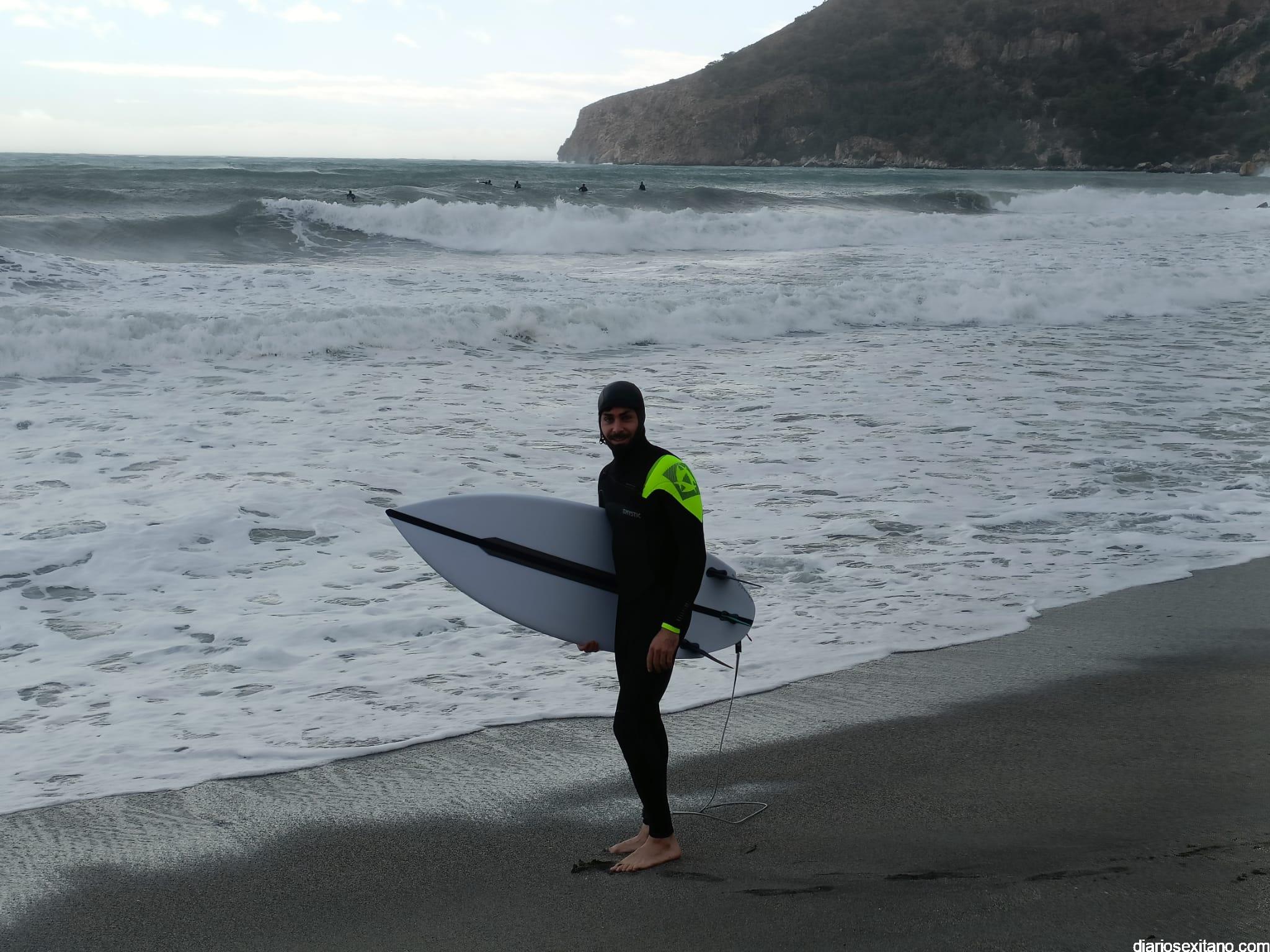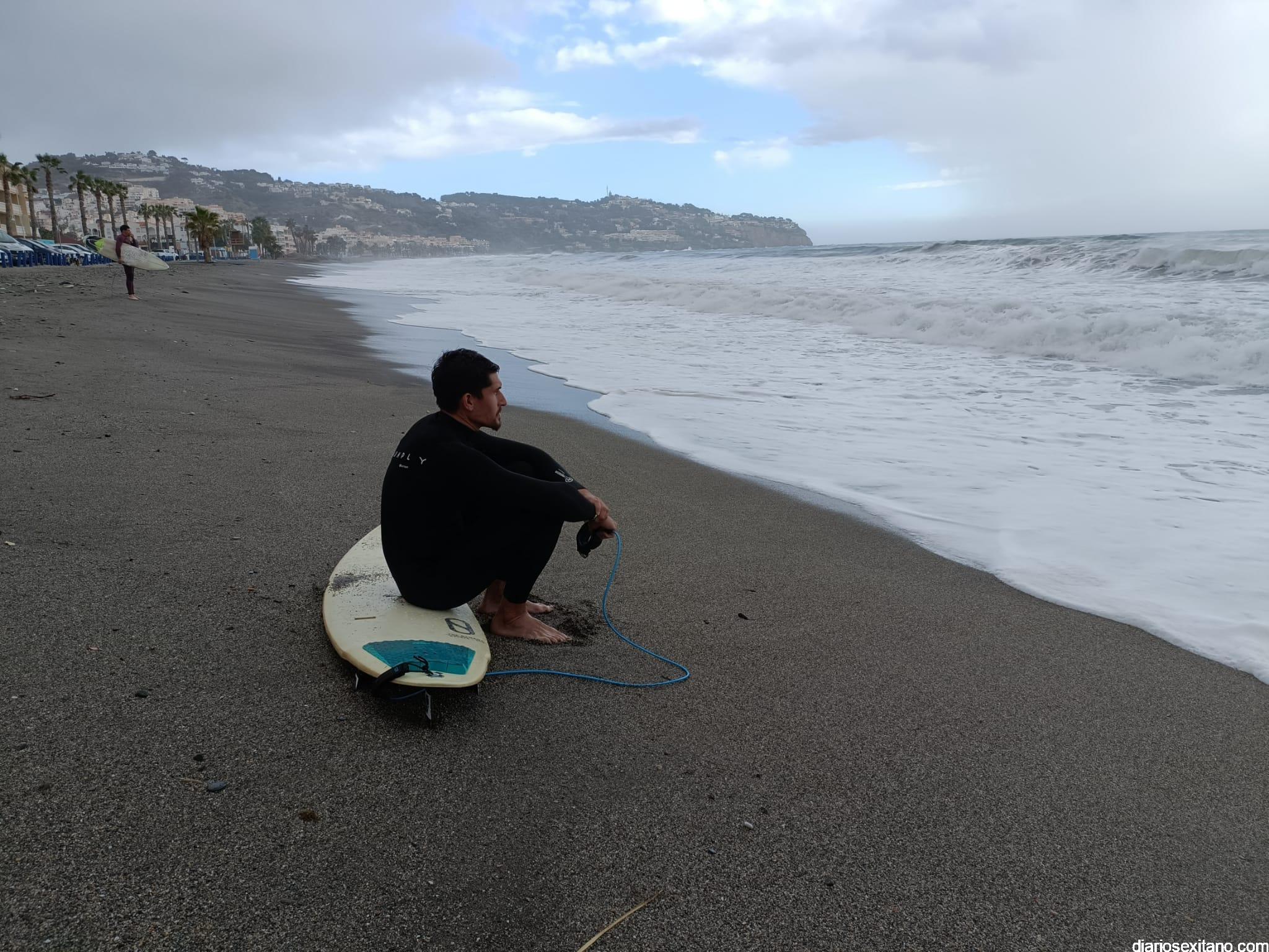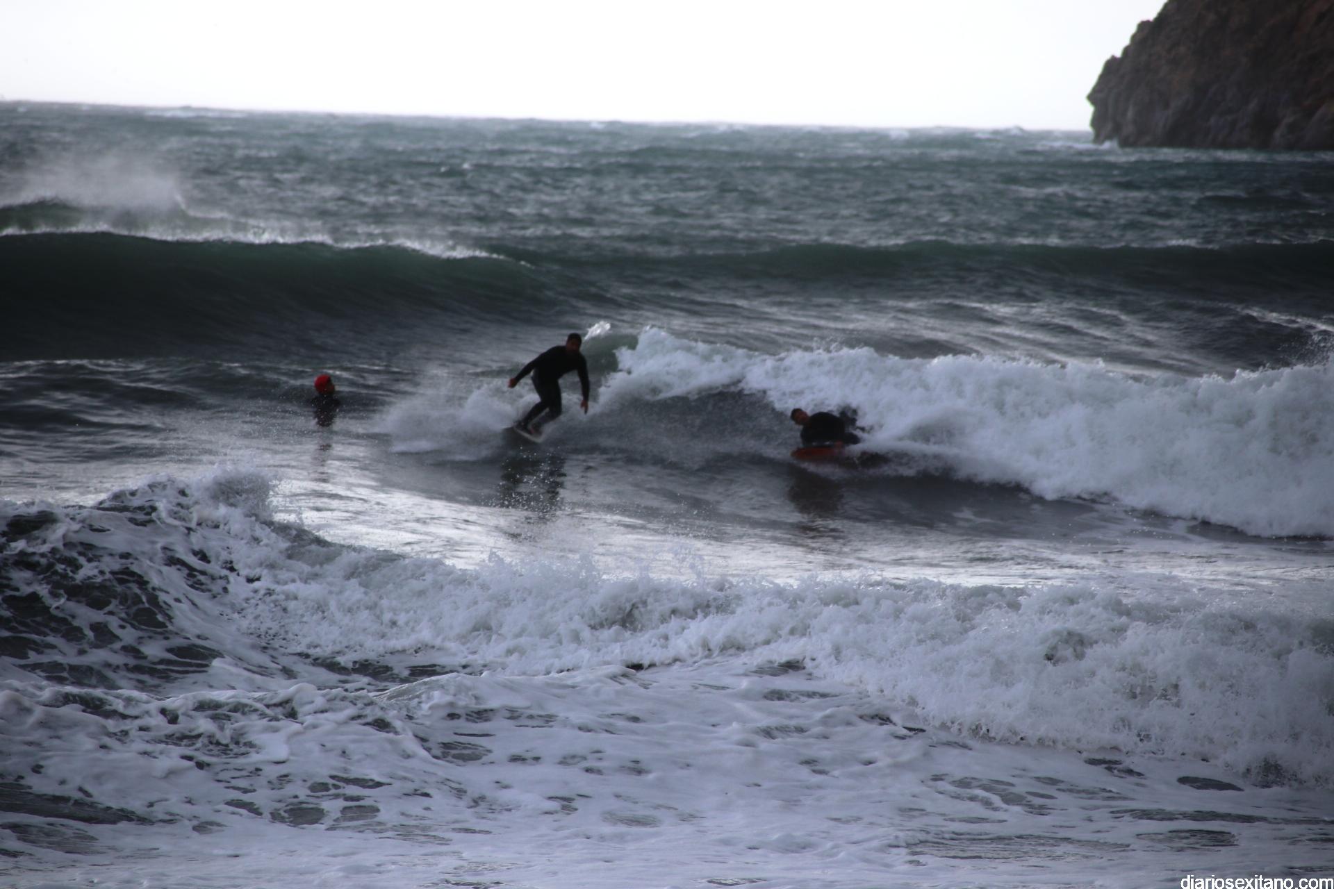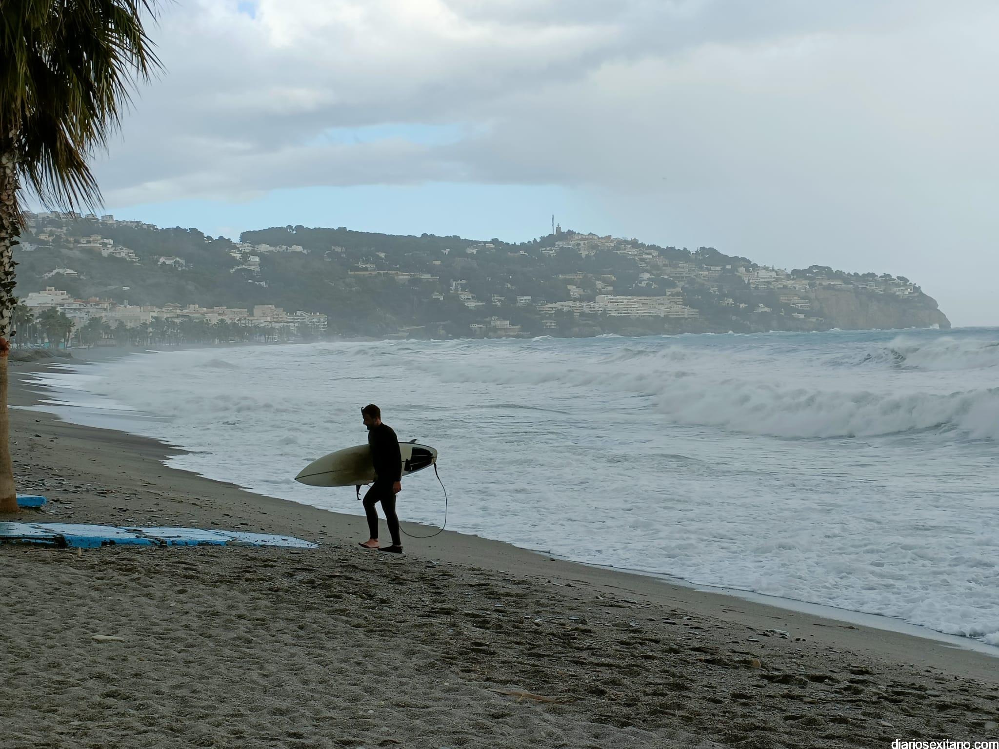 Surfistas llegados de la provincia de Málaga y Granada, equipados con trajes de neopreno y la tabla en mano, se han concentrado en la zona de la desembocadura de río Jate, cerca de Peña Parda, en la playa herradureña, y no dudaron en echarse a la mar a pesar del fuerte oleaje y una jornada invernal.