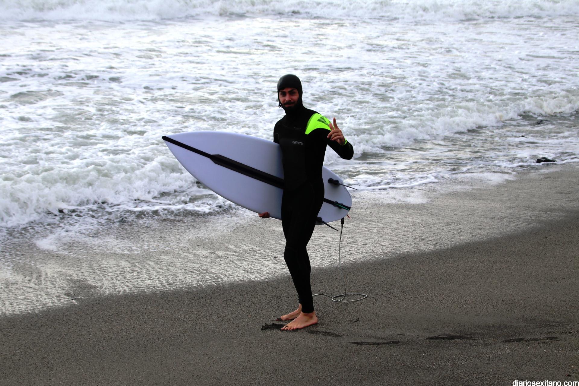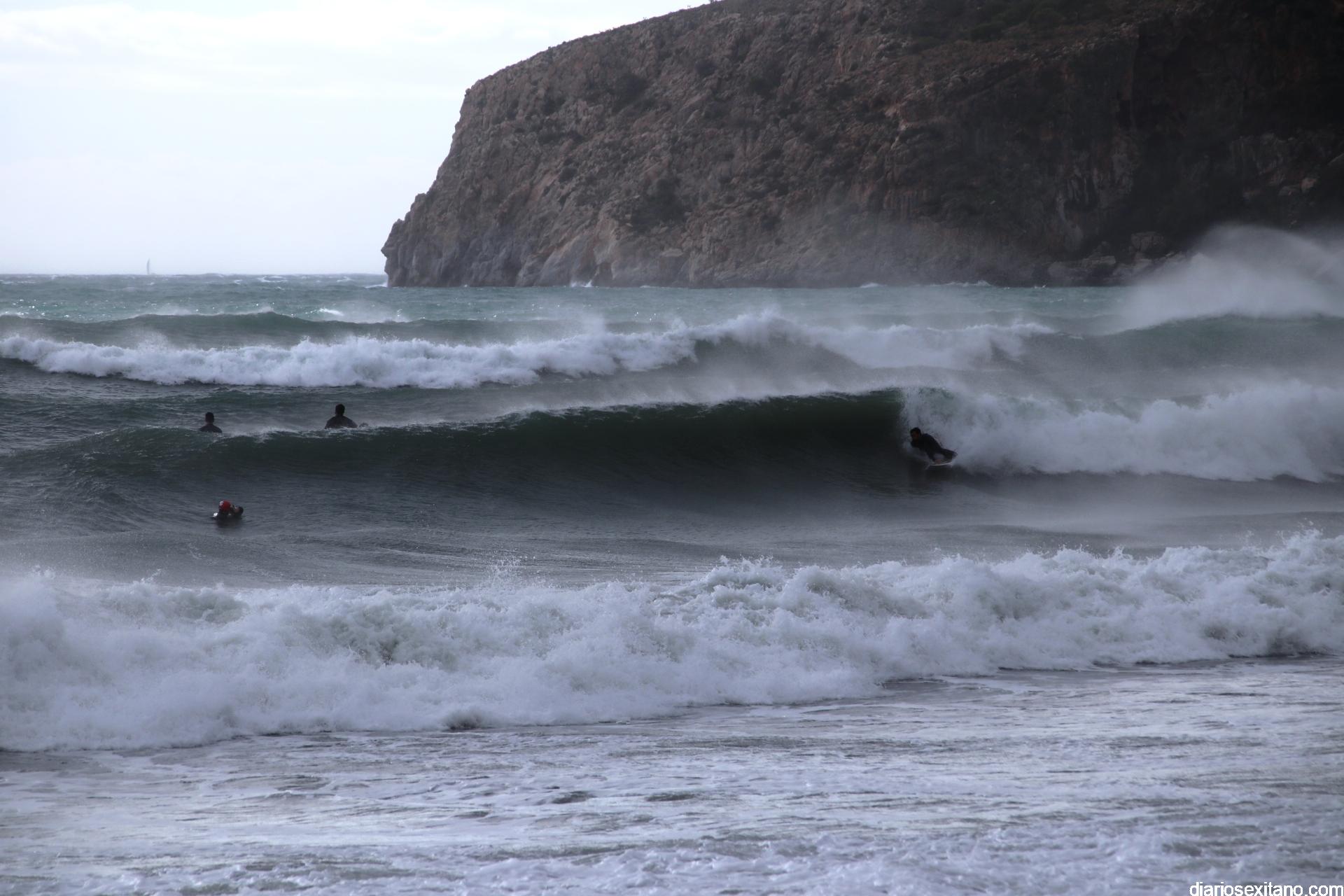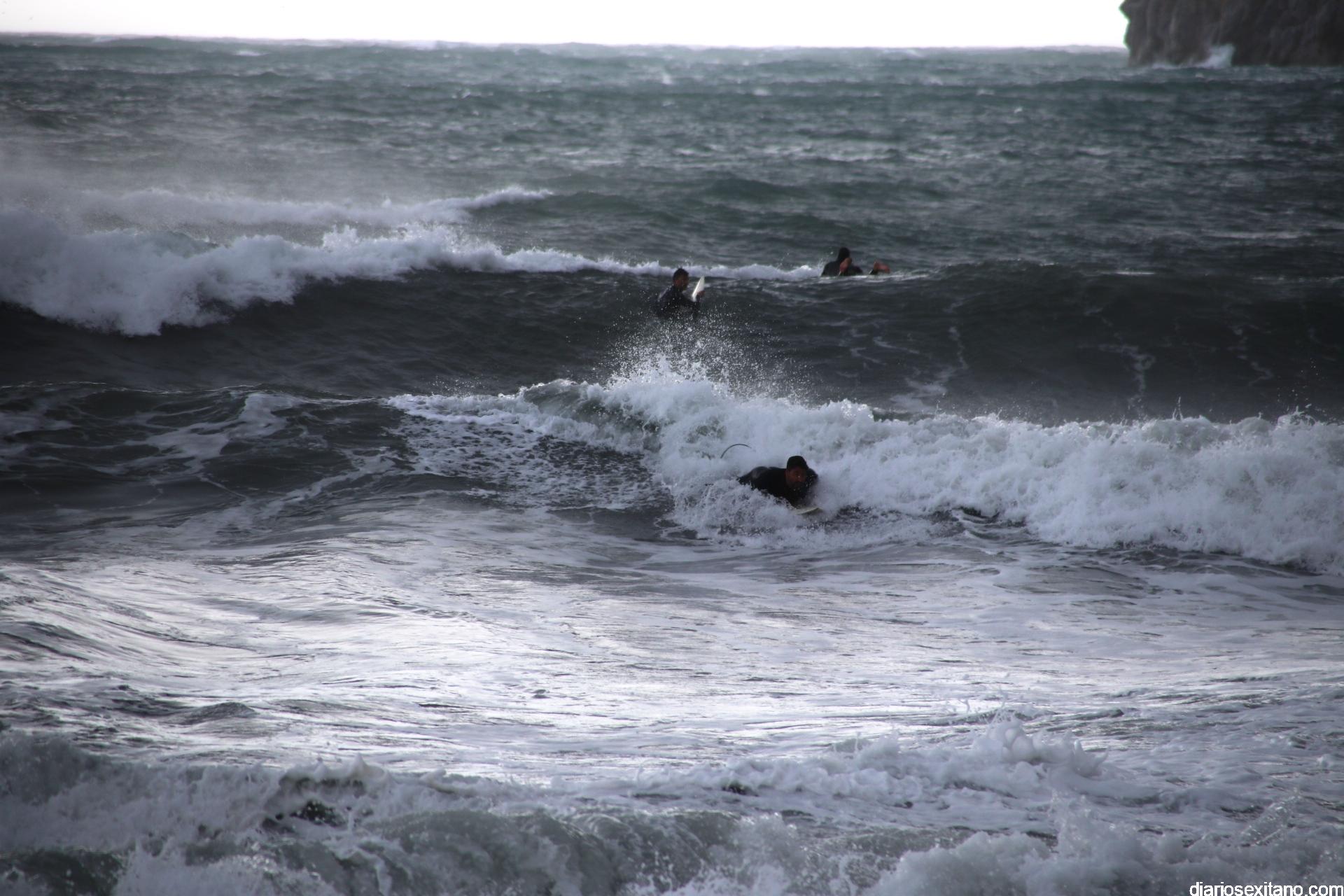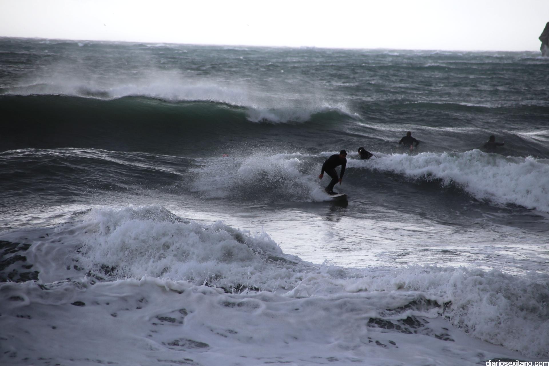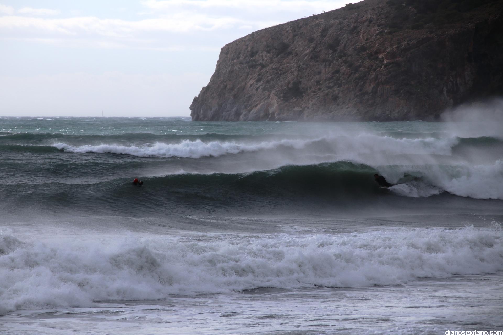 Surfistas llegados de la provincia de Málaga y Granada, equipados con trajes de neopreno y la tabla en mano, se han concentrado en la zona de la desembocadura de río Jate, cerca de Peña Parda, en la playa herradureña, y no dudaron en echarse a la mar a pesar del fuerte oleaje y una jornada invernal.