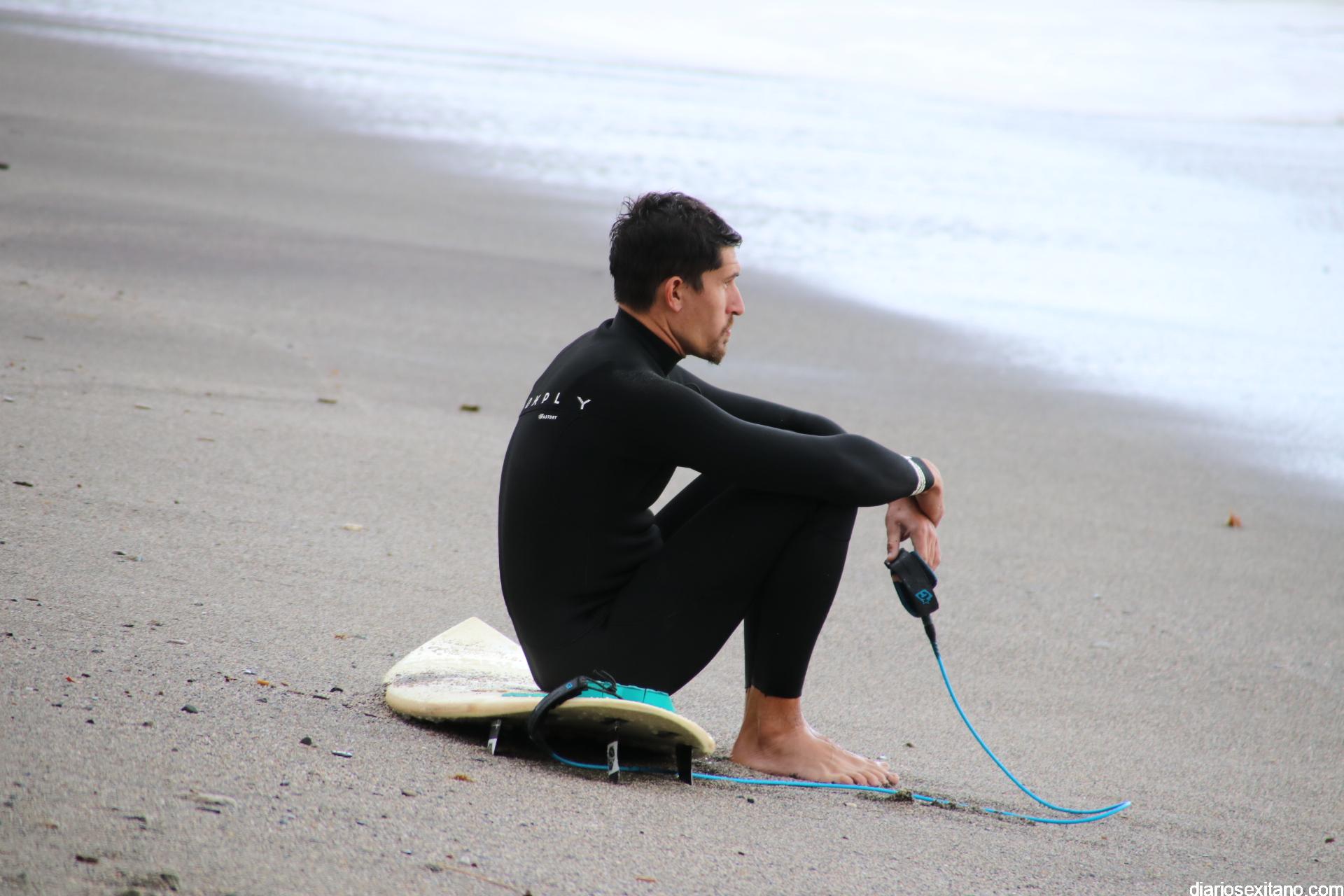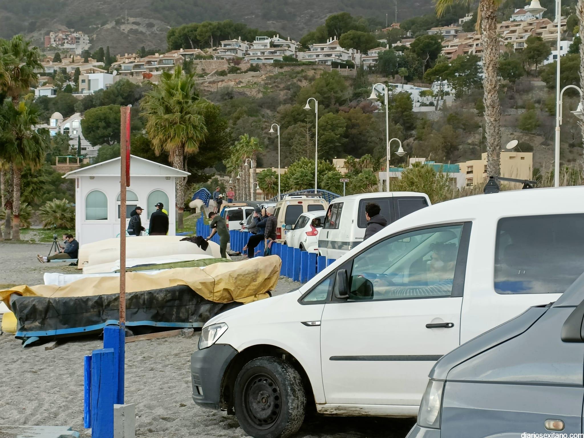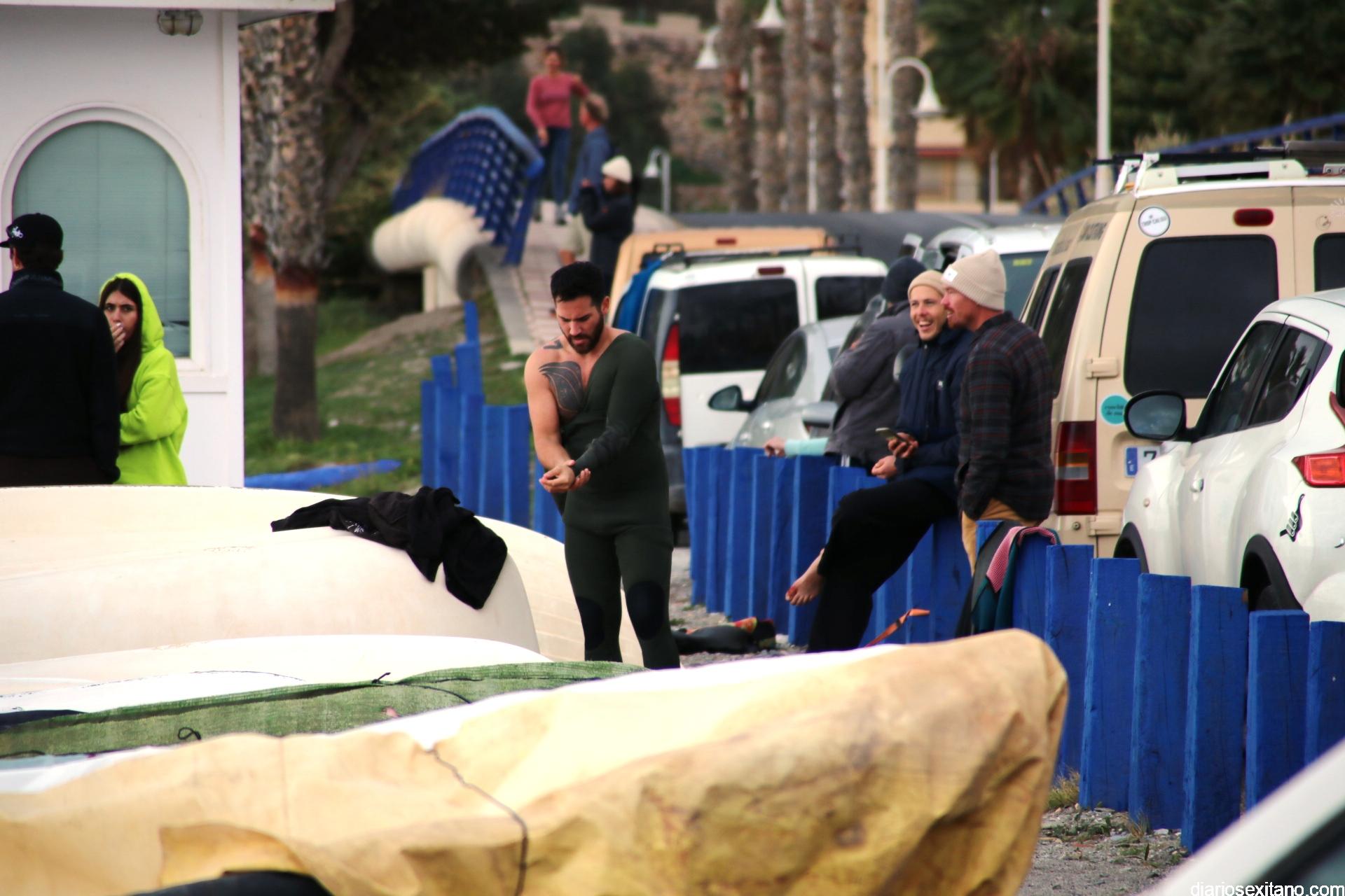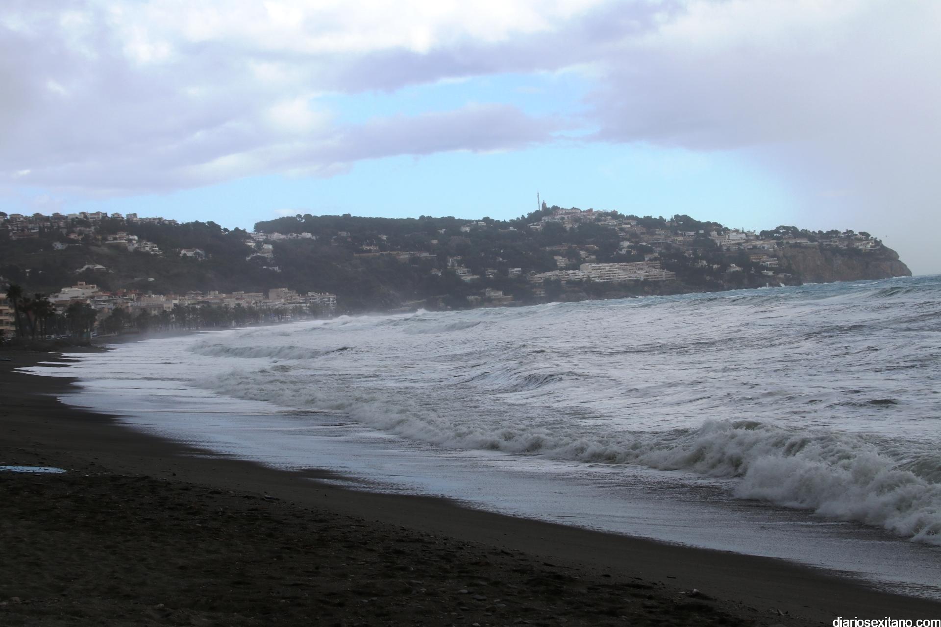 Surfistas llegados de la provincia de Málaga y Granada, equipados con trajes de neopreno y la tabla en mano, se han concentrado en la zona de la desembocadura de río Jate, cerca de Peña Parda, en la playa herradureña, y no dudaron en echarse a la mar a pesar del fuerte oleaje y una jornada invernal.
