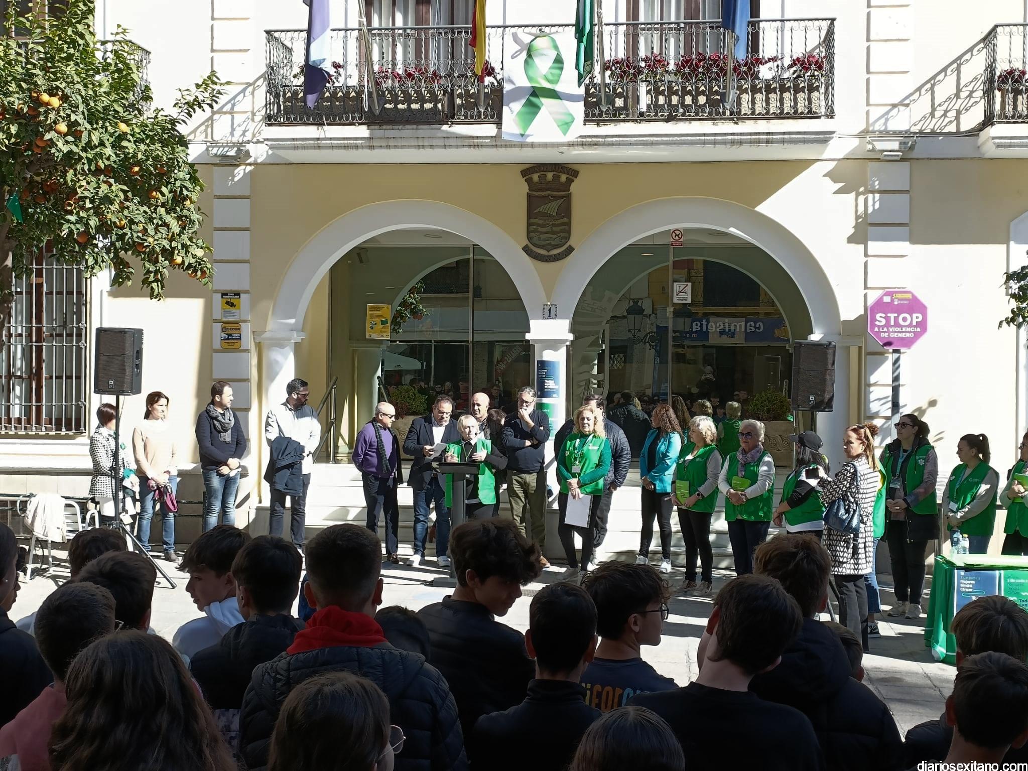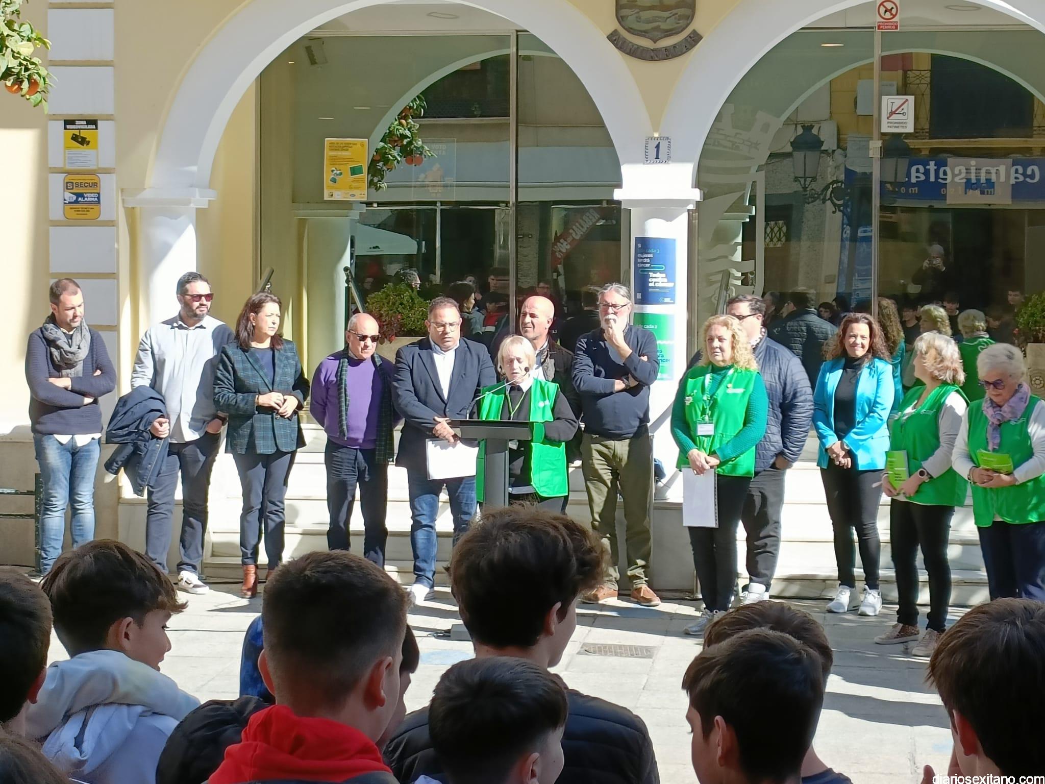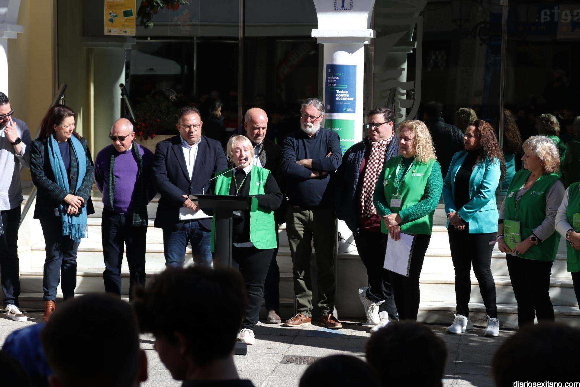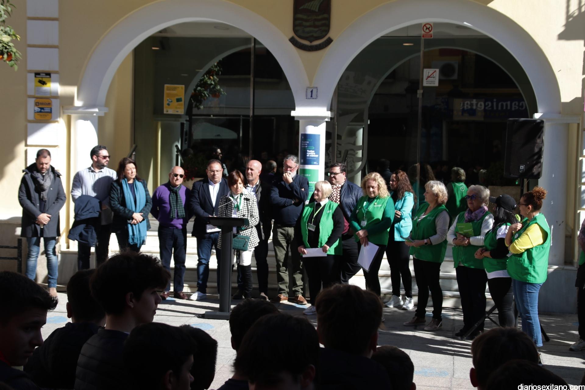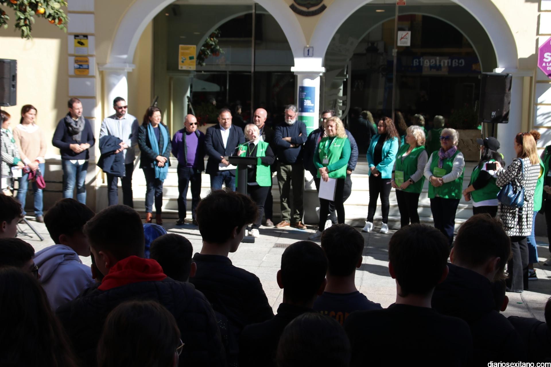El acto ha contado con la participación de corporativos sexitanos, encabezado por el alcalde, Juan José Ruiz Joya, voluntariado de la Junta Local de AECC con la presidenta al frente Concepción García Fernández y alumnos del IES Puerta del Mar.
