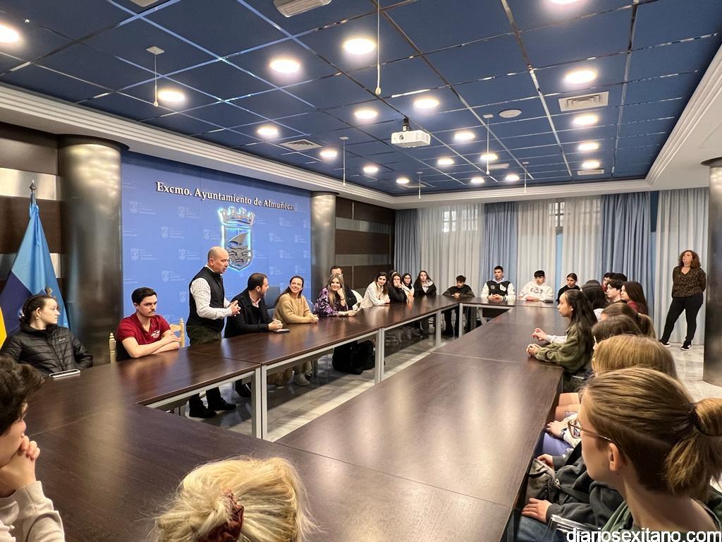 La teniente de alcalde del Ayuntamiento de Almuñécar, Beatriz González Orce y el concejal delegado de Cultura, Alberto García Gilabert han recibido este lunes en el Consistorio sexitano a los alumnos y profesores de dos institutos de Alemania y Grecia que participan en el intercambio Eramus+ con el IES Al Andalus de Almuñécar.