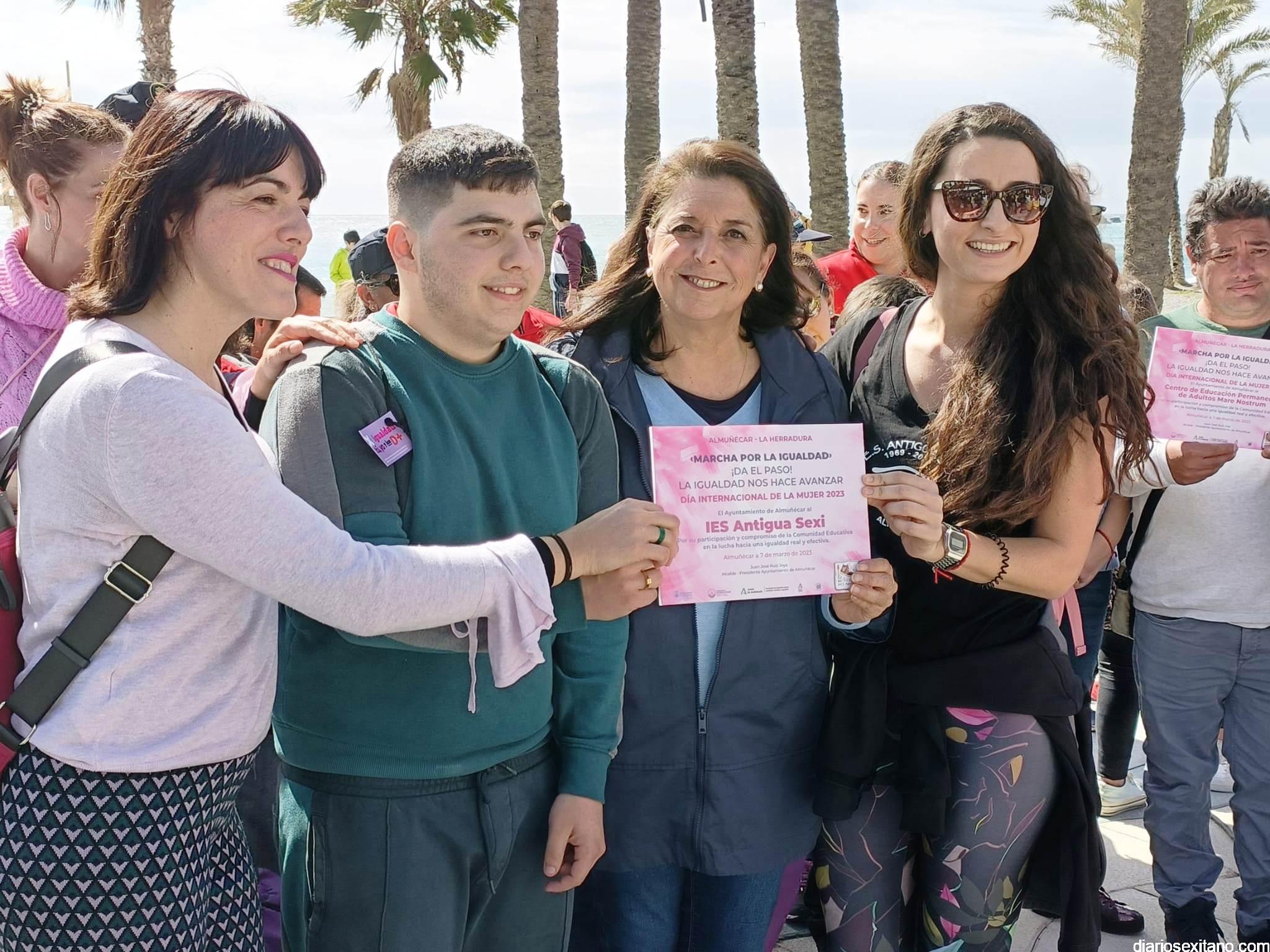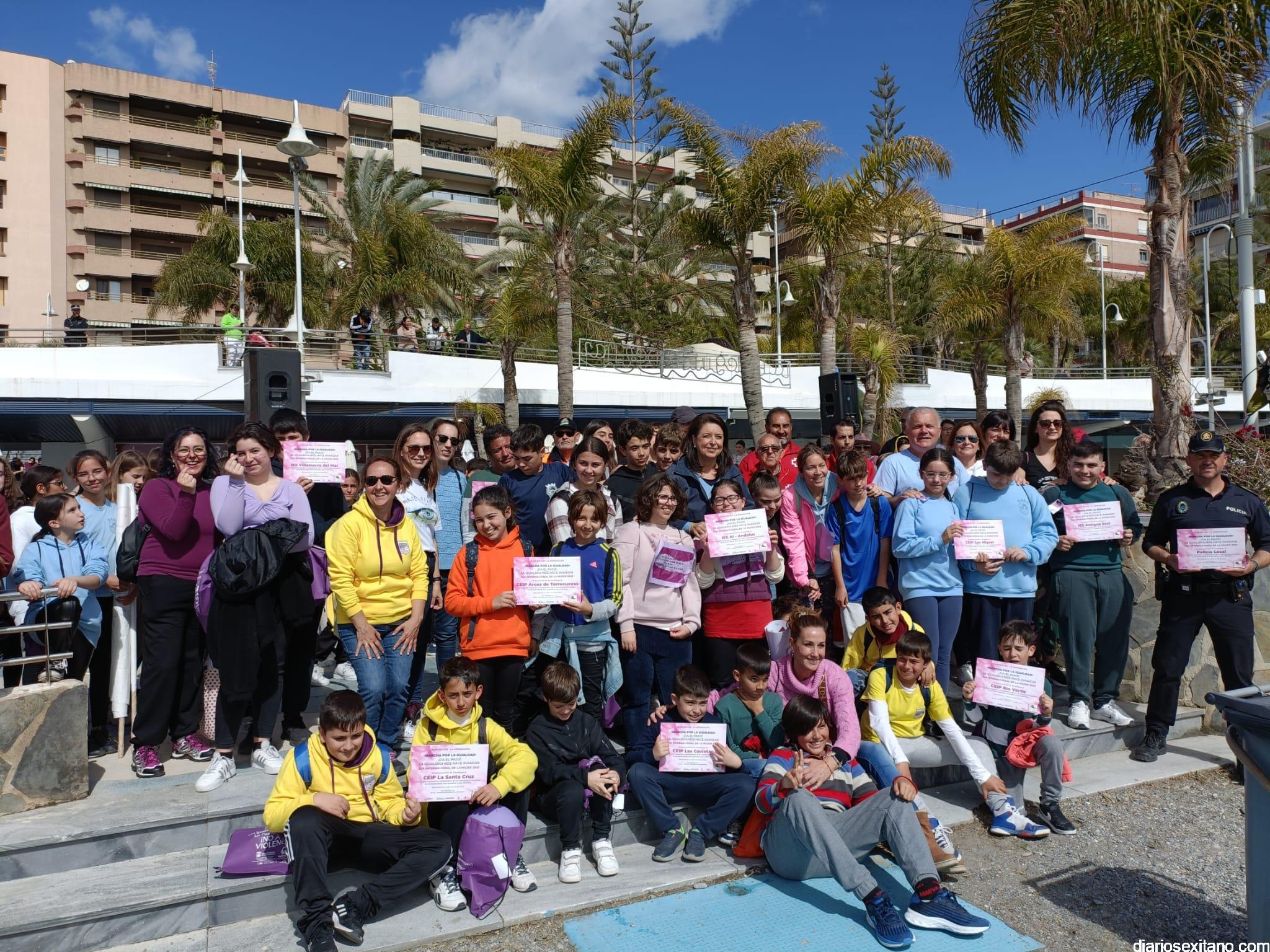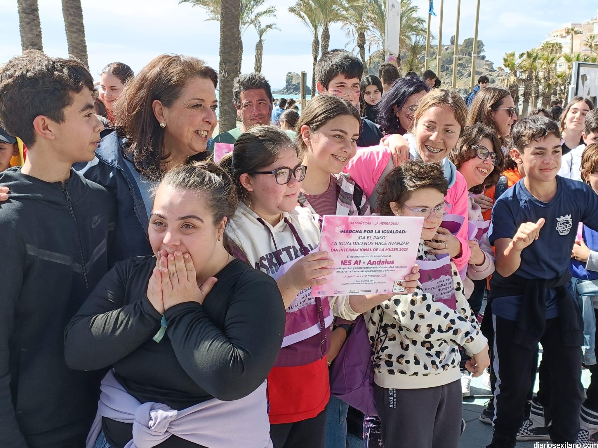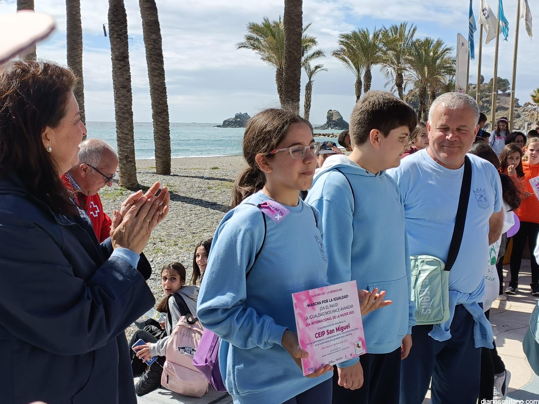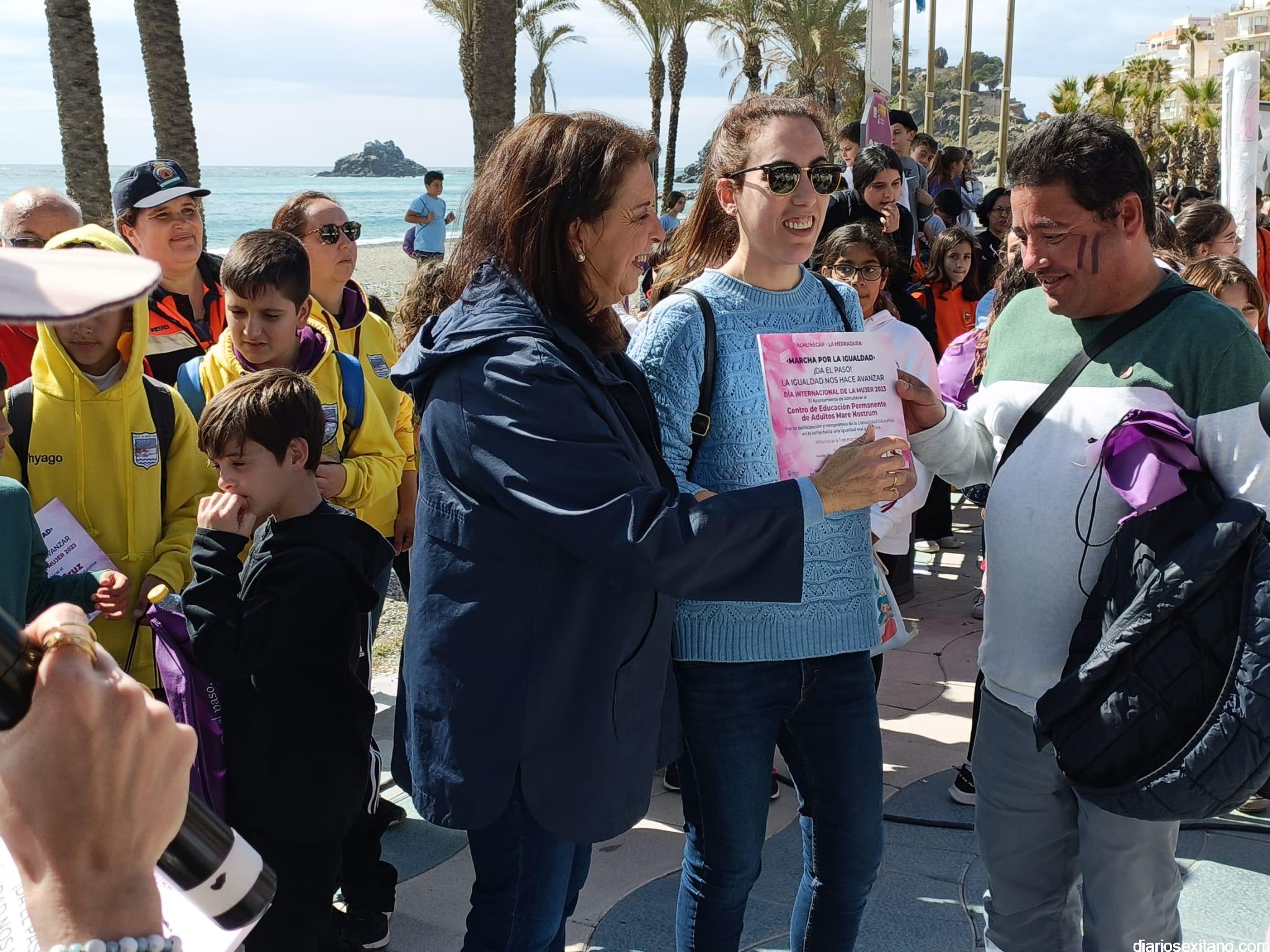 Con la entrega de diplomas a los centros educativos, Policía Local, Protección Civil y Cruz Roja ha concluido la “Marcha por la Igualdad” celebrada en Almuñécar y en la que han participado casi un millar de personas entre estudiantes y profesores. El acto, celebrado este martes bajo la organización del Centro Municipal de la Mujer, dependiente de la Concejalía de Bienestar Sociales e Igualdad del Ayuntamiento Almuñécar, se celebró con motivo del Día Internacional de la Mujer en el municipio sexitano bajo el lema “Almuñécar, sumando avanzamos”.
