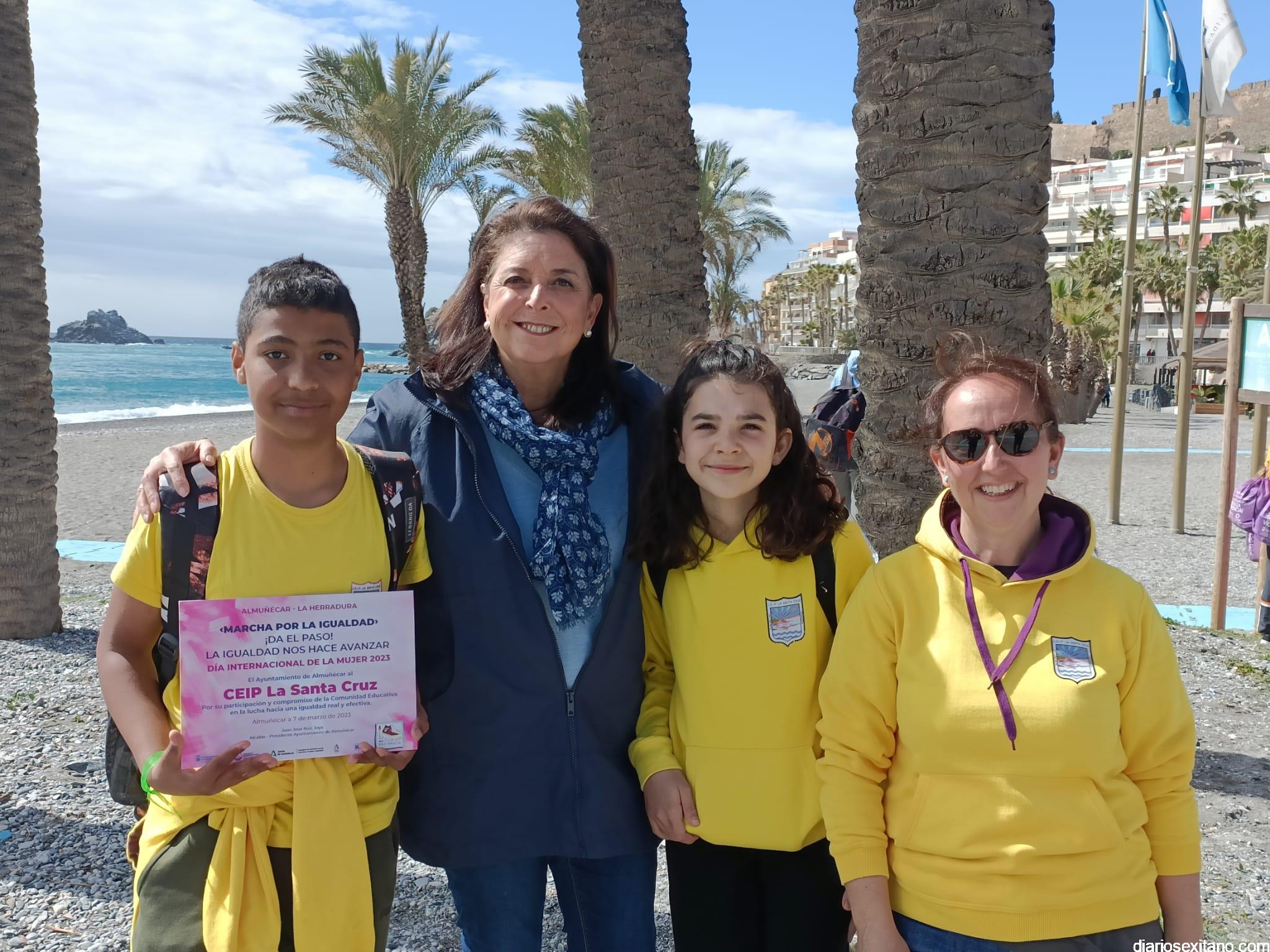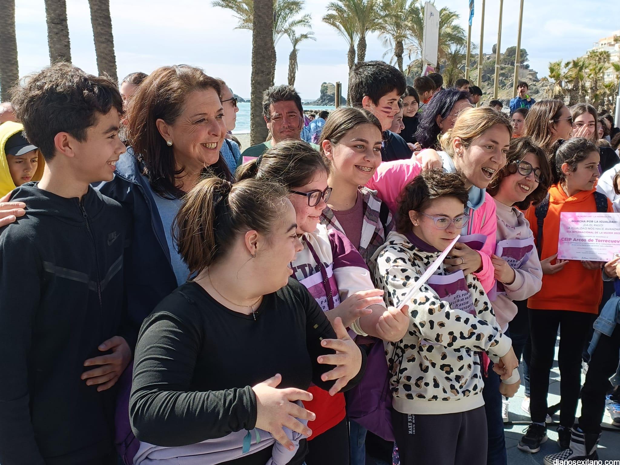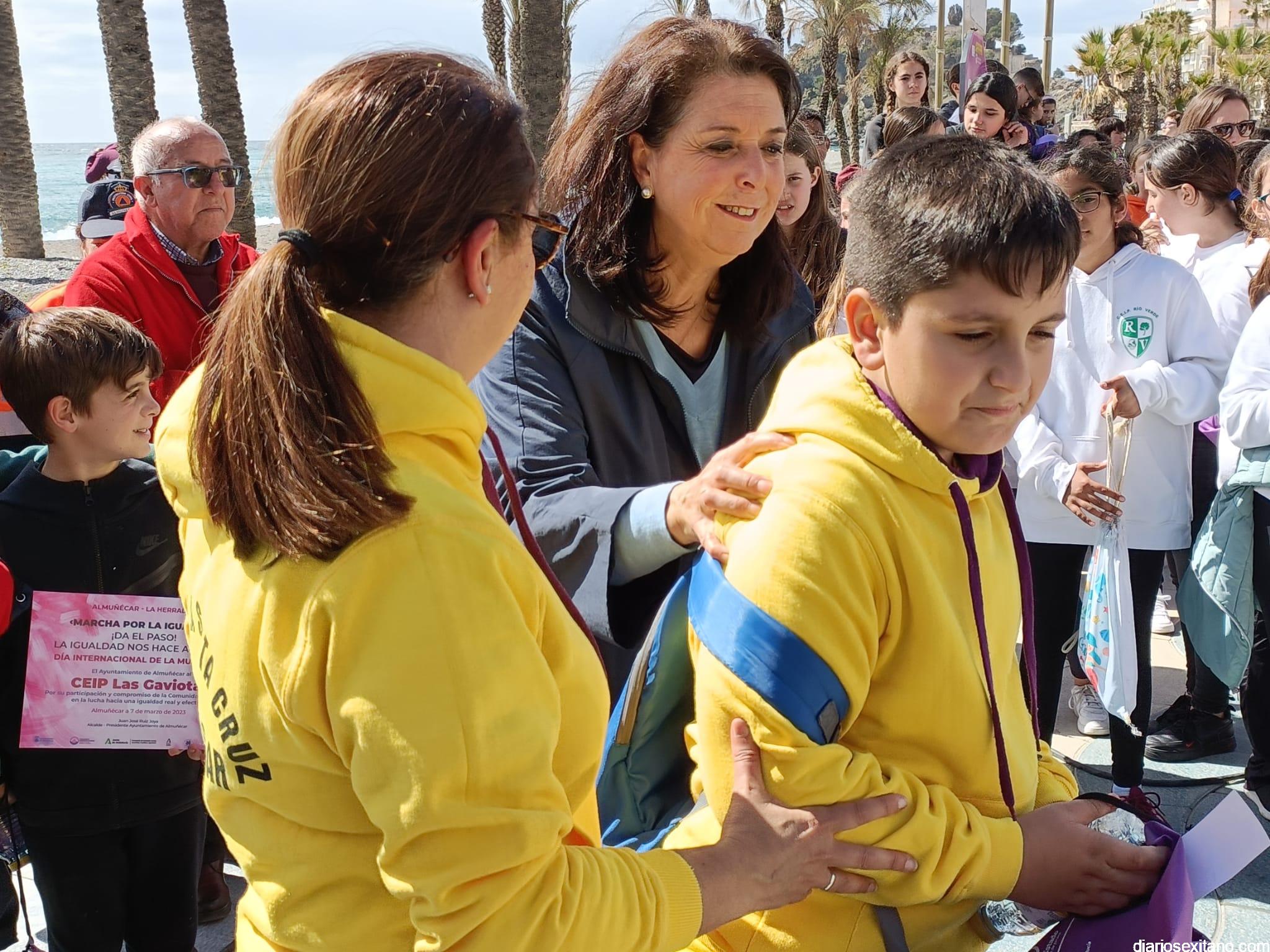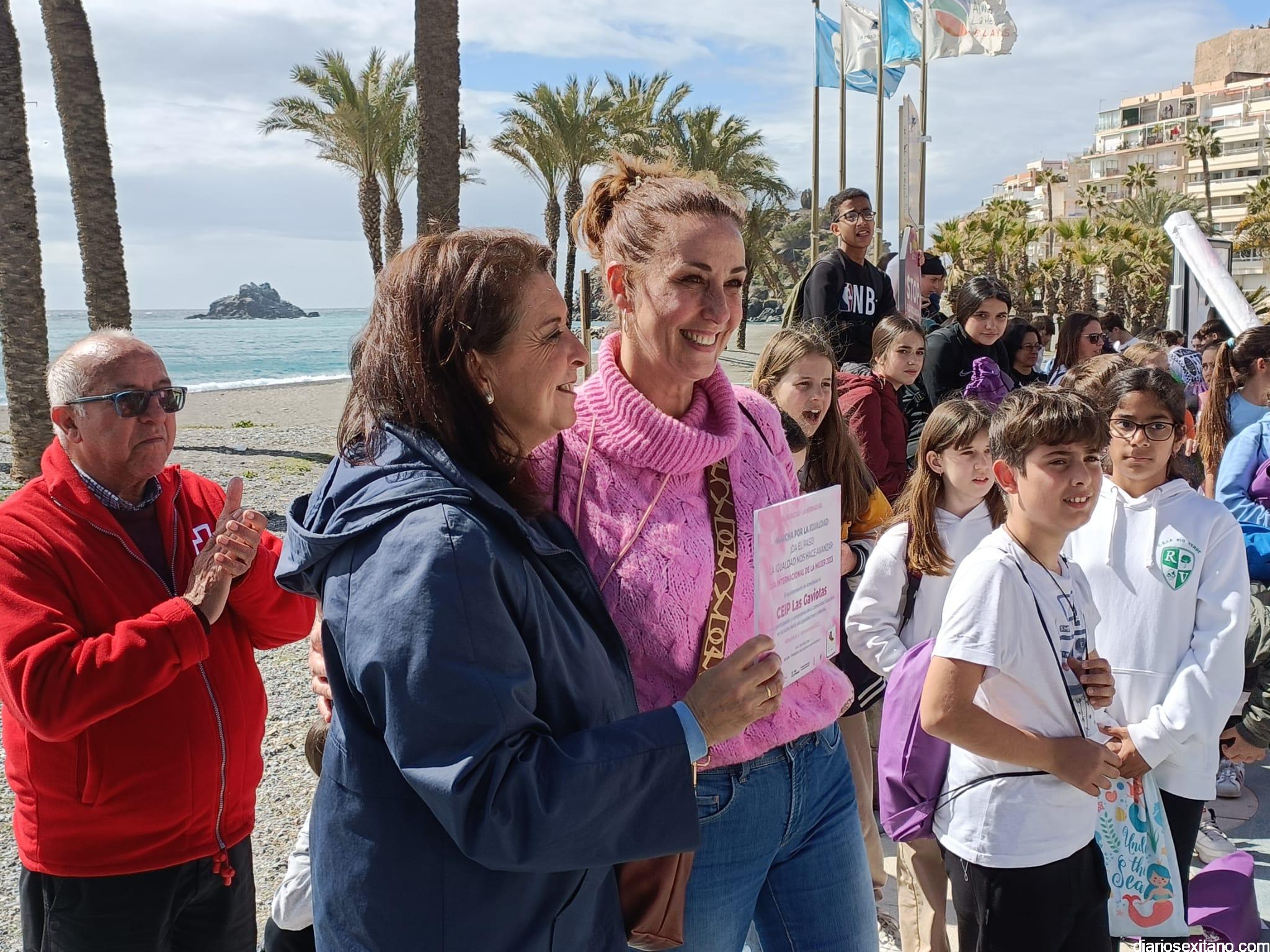 Con la entrega de diplomas a los centros educativos, Policía Local, Protección Civil y Cruz Roja ha concluido la “Marcha por la Igualdad” celebrada en Almuñécar y en la que han participado casi un millar de personas entre estudiantes y profesores. El acto, celebrado este martes bajo la organización del Centro Municipal de la Mujer, dependiente de la Concejalía de Bienestar Sociales e Igualdad del Ayuntamiento Almuñécar, se celebró con motivo del Día Internacional de la Mujer en el municipio sexitano bajo el lema “Almuñécar, sumando avanzamos”.