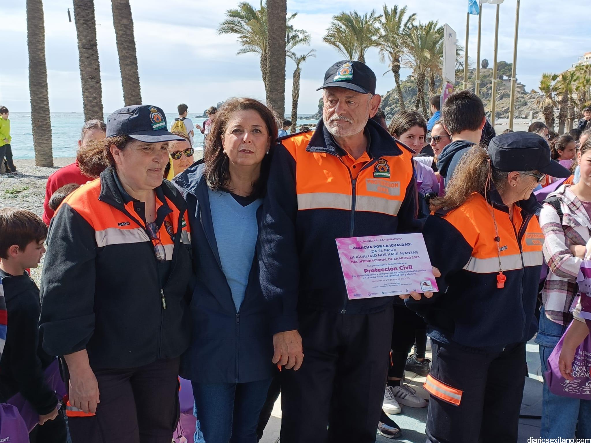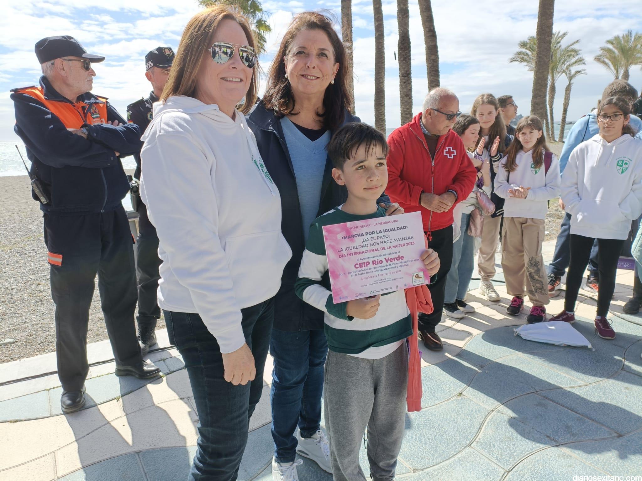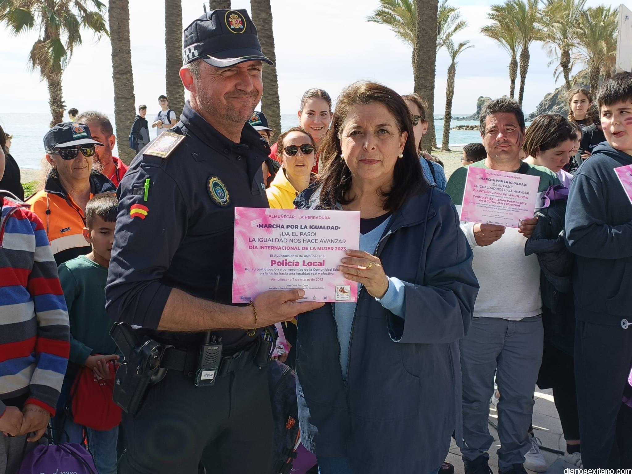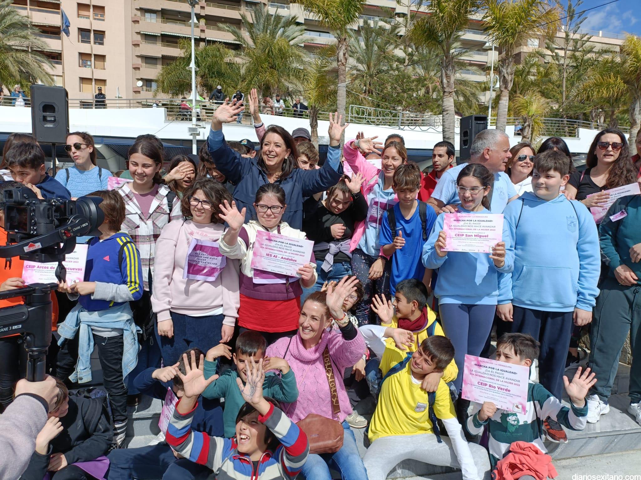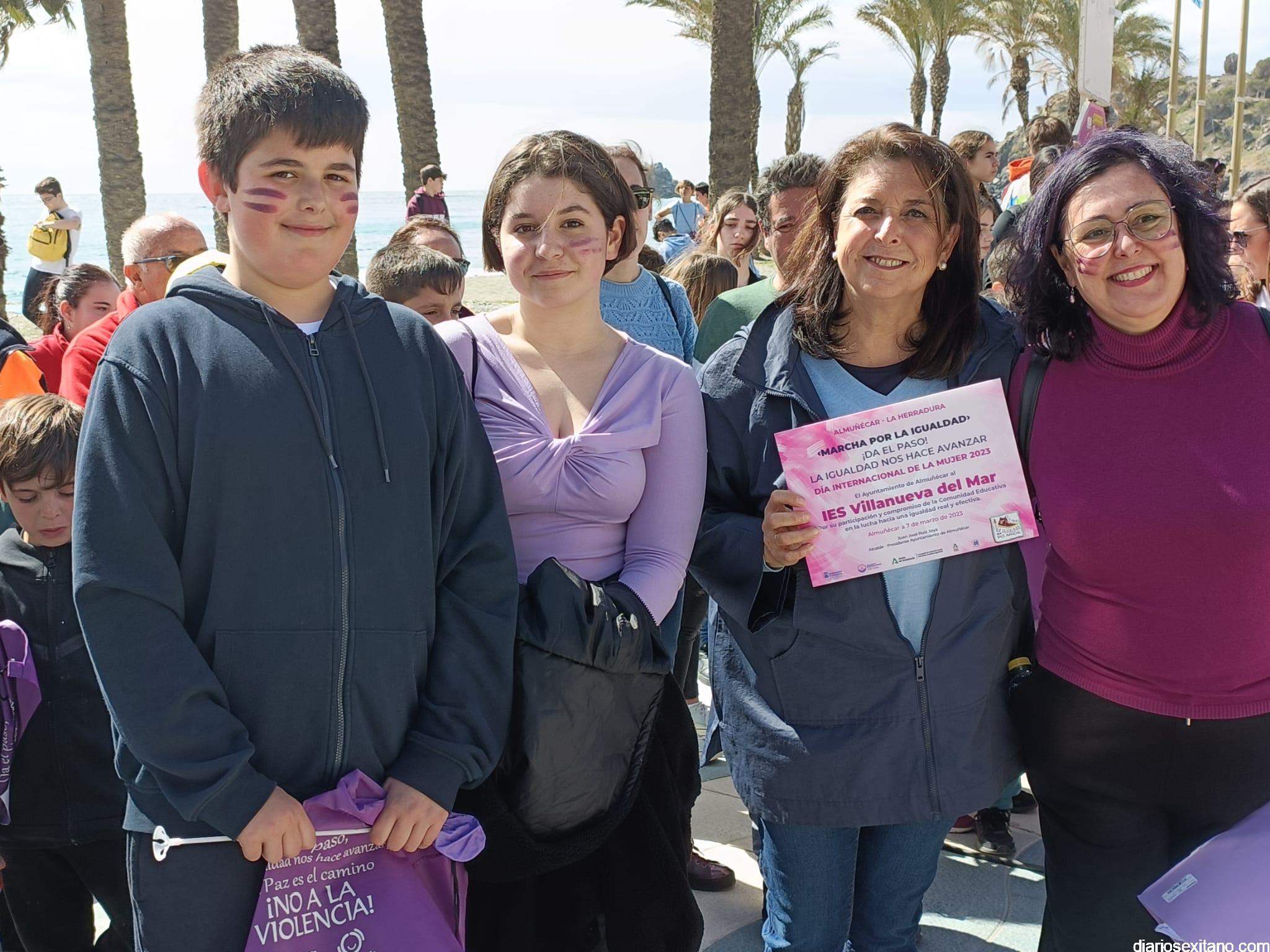 Con la entrega de diplomas a los centros educativos, Policía Local, Protección Civil y Cruz Roja ha concluido la “Marcha por la Igualdad” celebrada en Almuñécar y en la que han participado casi un millar de personas entre estudiantes y profesores. El acto, celebrado este martes bajo la organización del Centro Municipal de la Mujer, dependiente de la Concejalía de Bienestar Sociales e Igualdad del Ayuntamiento Almuñécar, se celebró con motivo del Día Internacional de la Mujer en el municipio sexitano bajo el lema “Almuñécar, sumando avanzamos”.