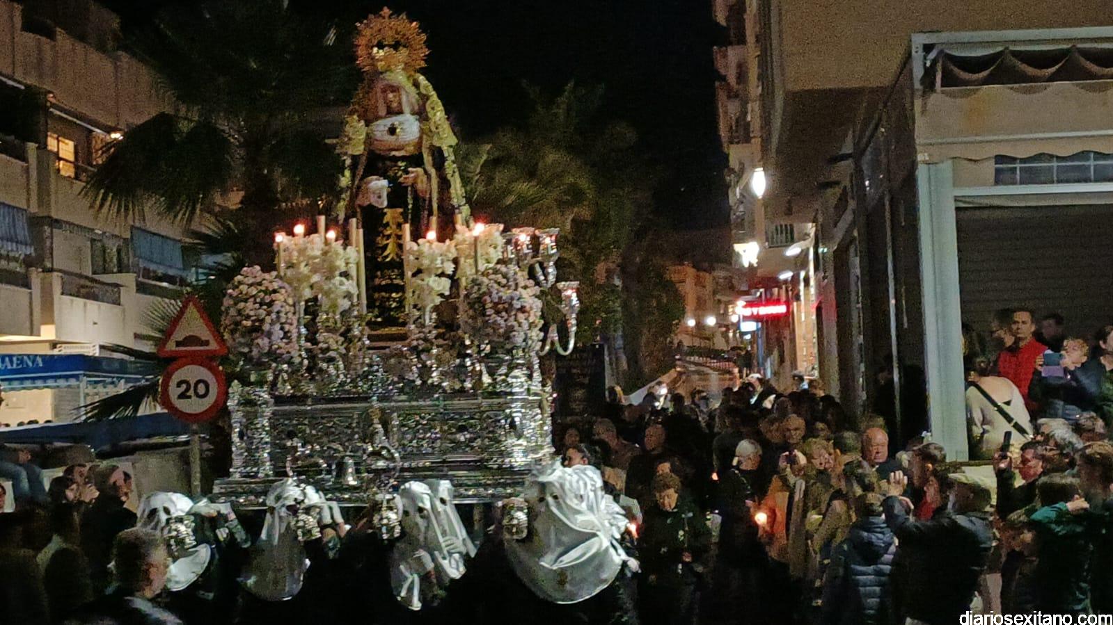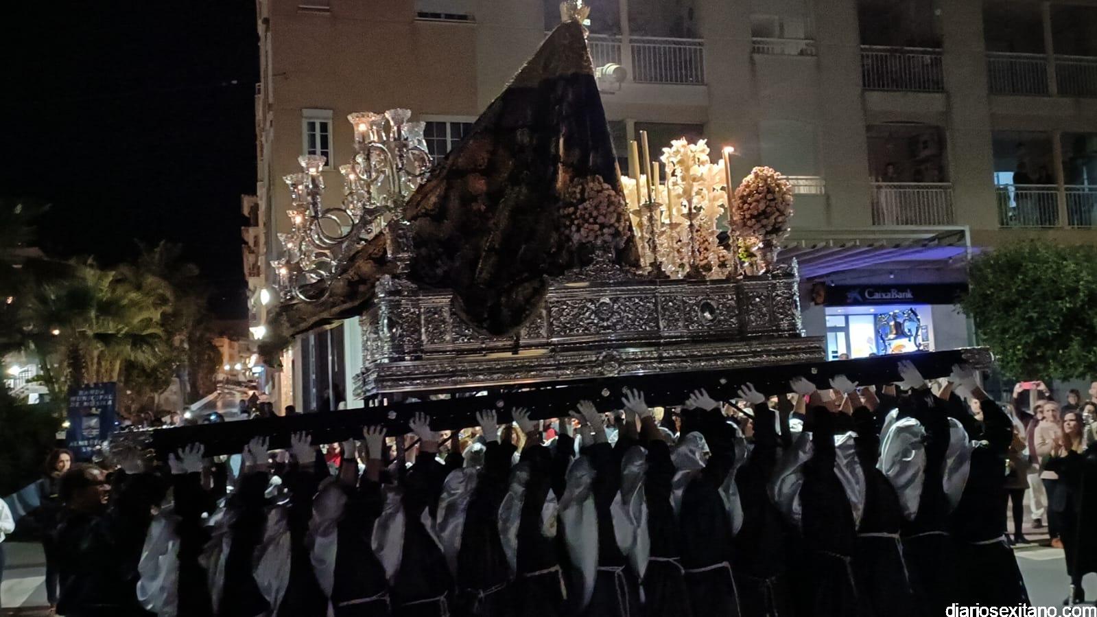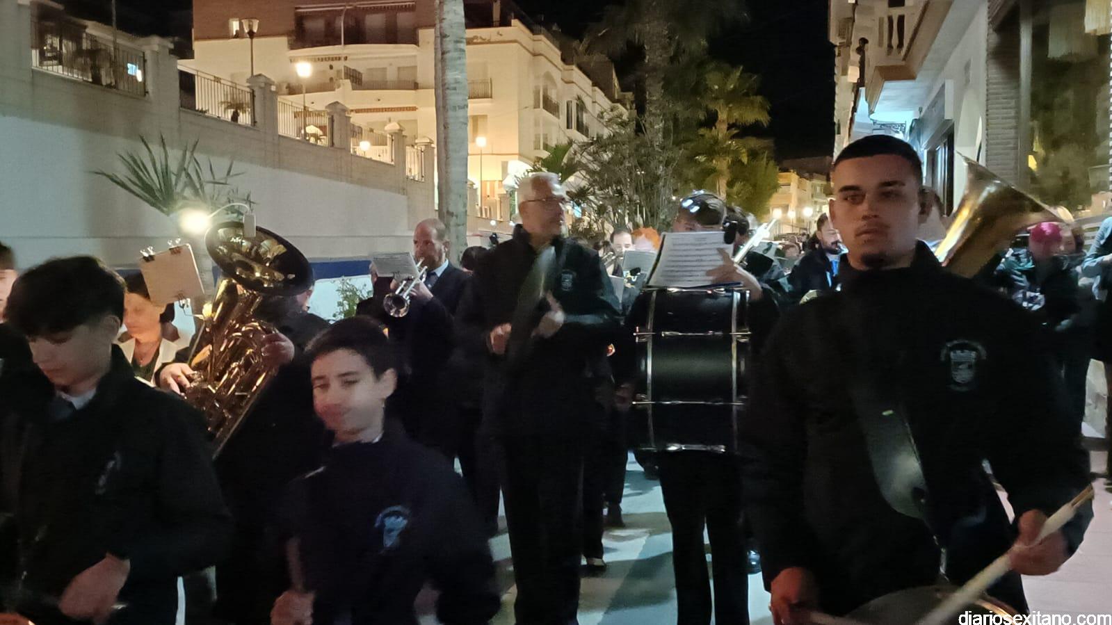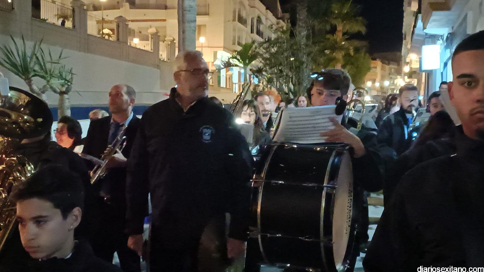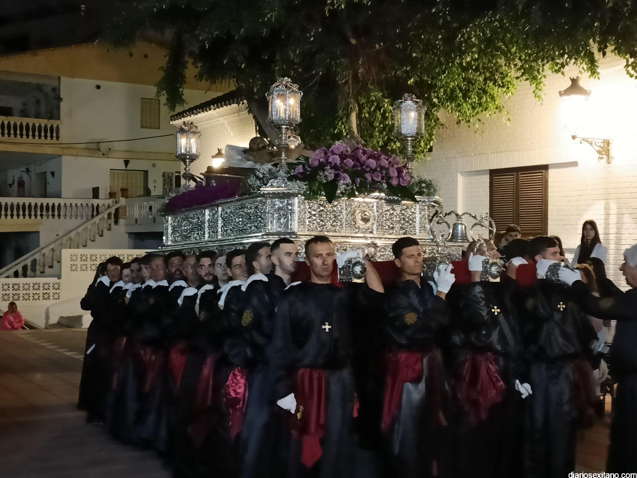 Durante más de dos horas procesionaron los dos pasos que salieron de la Iglesia parroquial de San José pasadas las 9 de la noche. La comitiva, organizada por la Cofradía de La Herradura, que lleva el nombre de los sagrados titulares y que preside Antonio Almanza, estuvo encabezada por el cura párroco Néstor Robledo acompañado por el teniente de alcalde, Daniel Barbero. A los sones de la Banda Municipal de Música de Almuñécar, dirigida por David Pino, y un trío de música de cámara que acompañó al trono del Cristo del Sepulcro, la procesión puso rumbo hacía la calle Canalejas hasta llegar a la calle España para acceder a la calle Real.