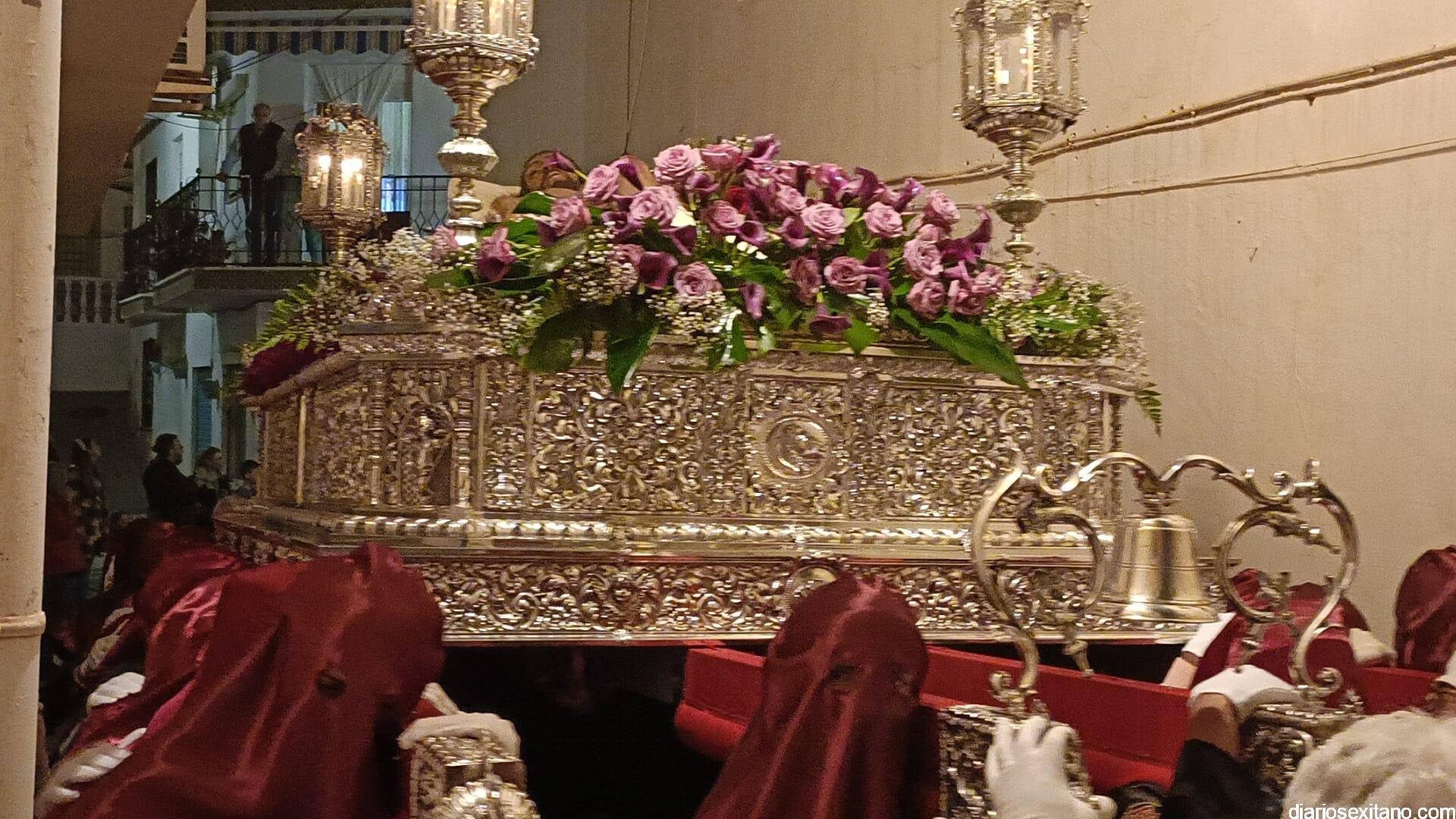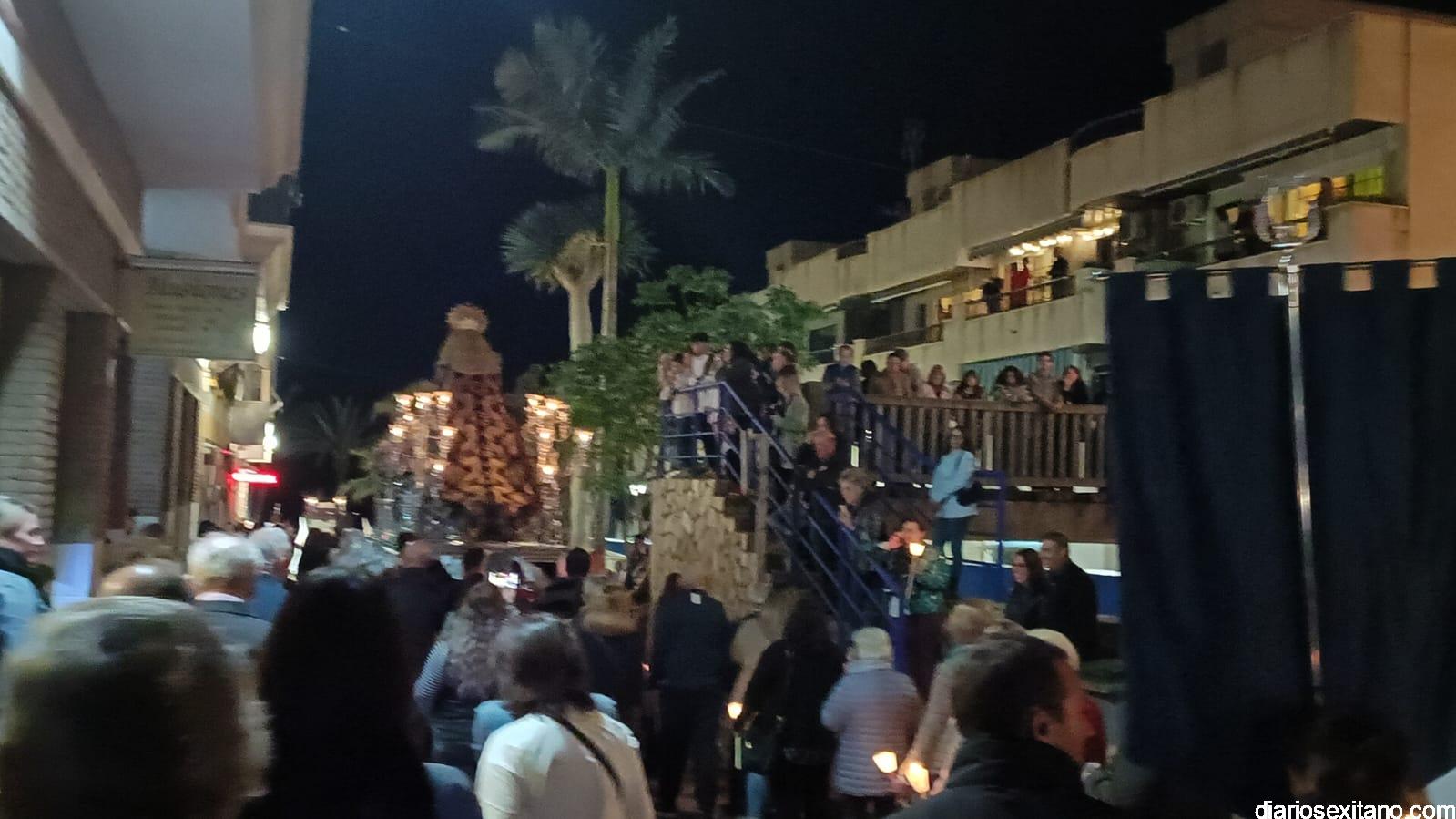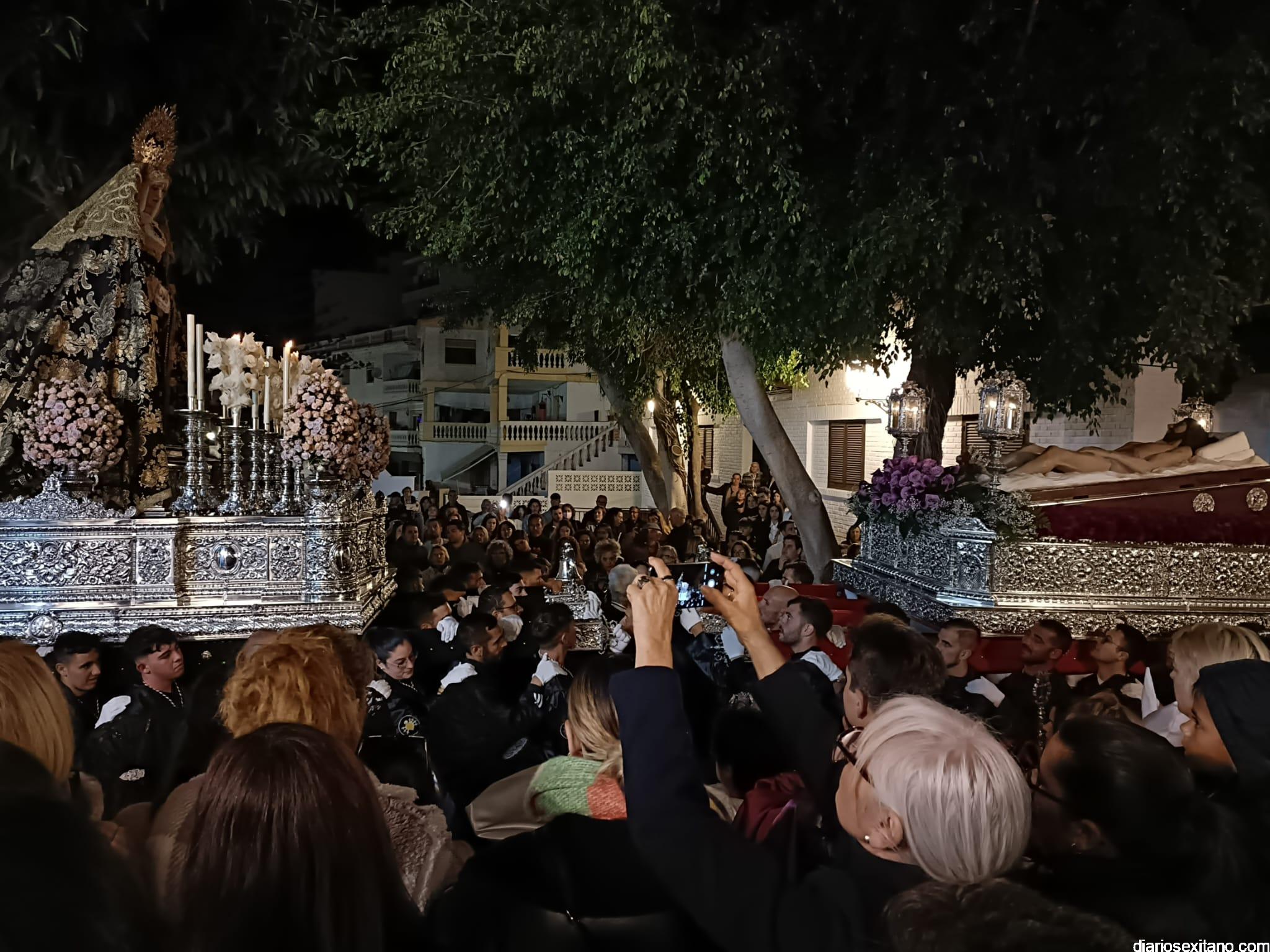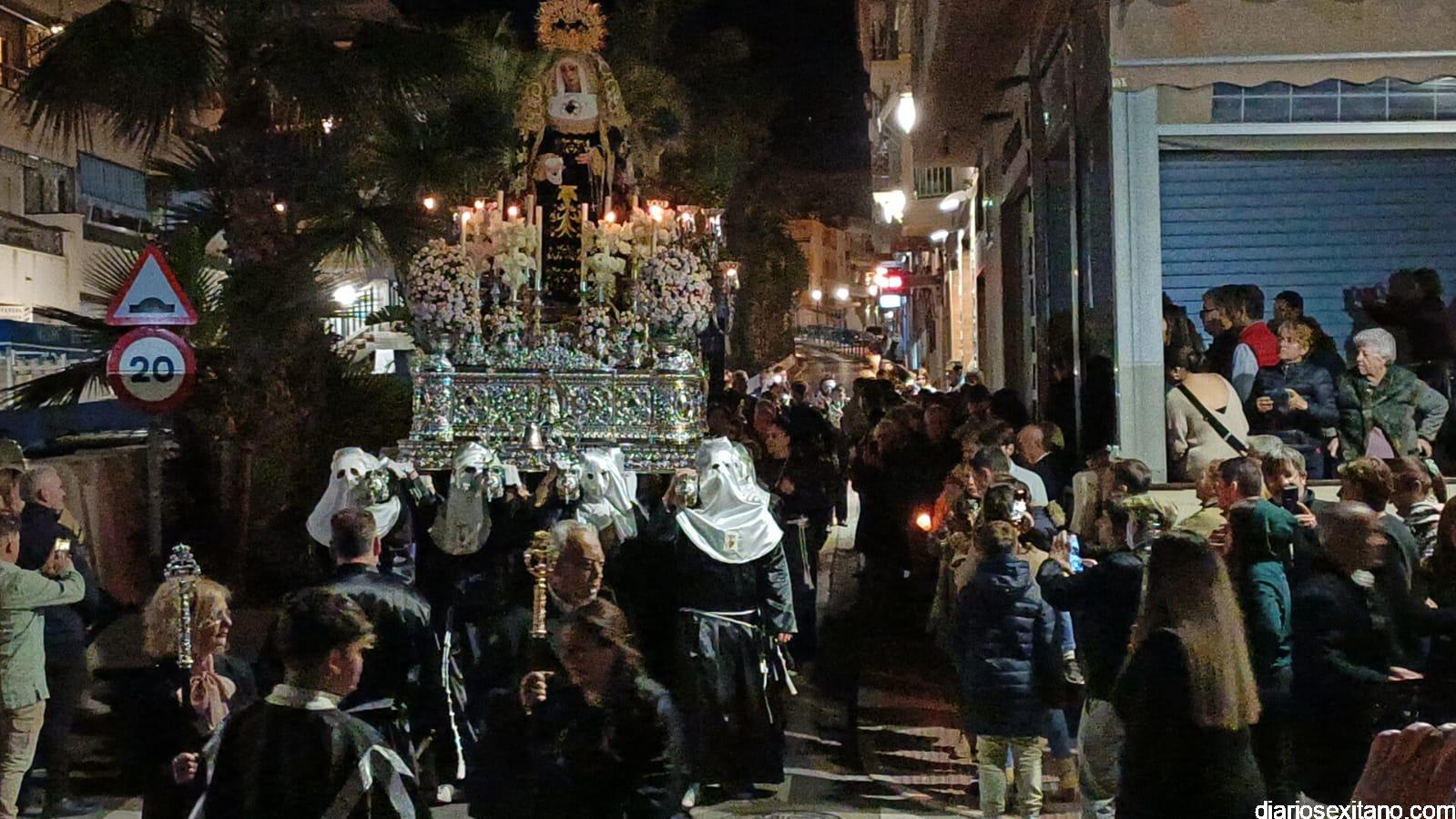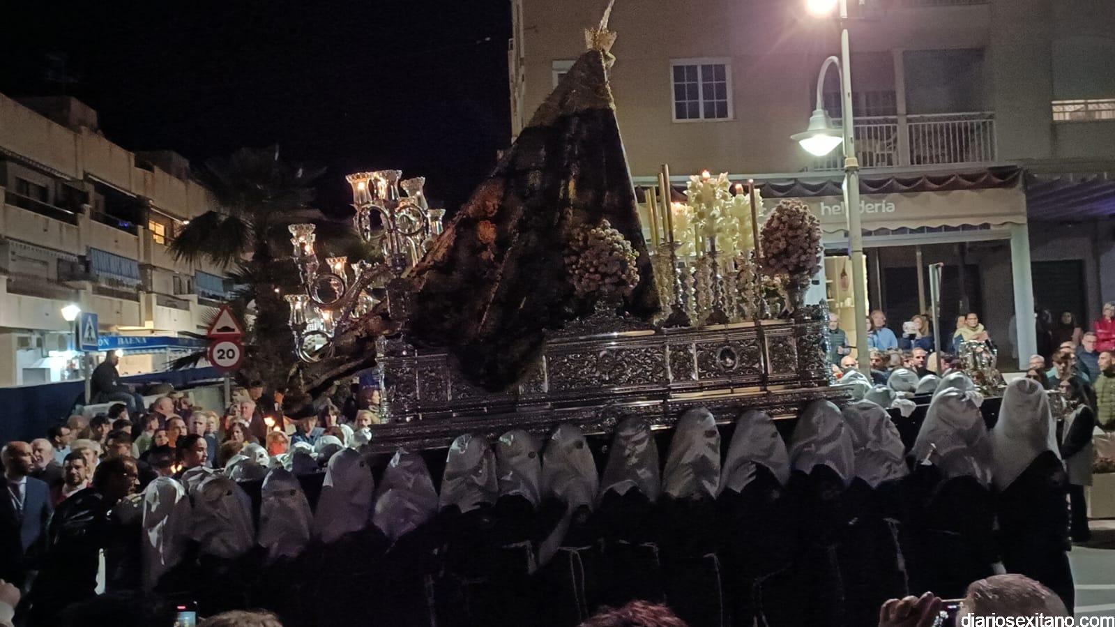 Durante más de dos horas procesionaron los dos pasos que salieron de la Iglesia parroquial de San José pasadas las 9 de la noche. La comitiva, organizada por la Cofradía de La Herradura, que lleva el nombre de los sagrados titulares y que preside Antonio Almanza, estuvo encabezada por el cura párroco Néstor Robledo acompañado por el teniente de alcalde, Daniel Barbero. A los sones de la Banda Municipal de Música de Almuñécar, dirigida por David Pino, y un trío de música de cámara que acompañó al trono del Cristo del Sepulcro, la procesión puso rumbo hacía la calle Canalejas hasta llegar a la calle España para acceder a la calle Real.