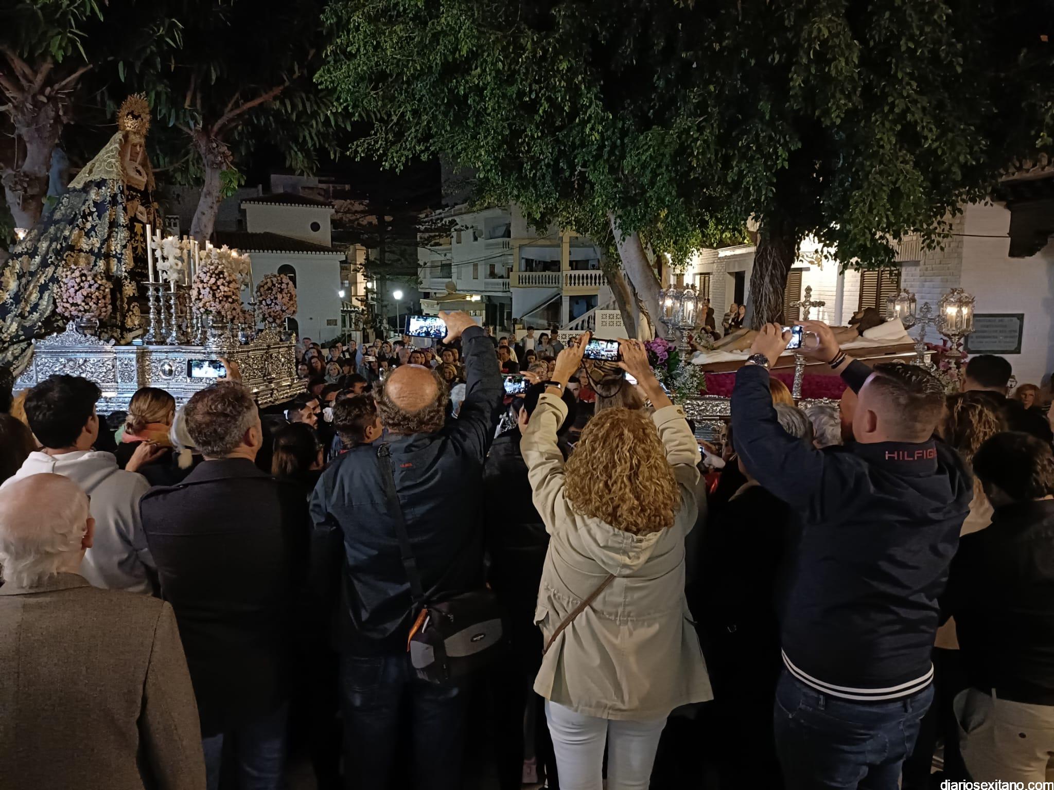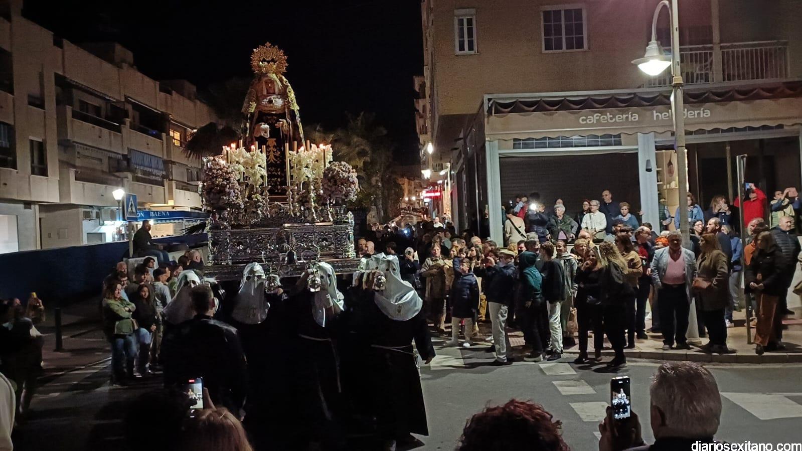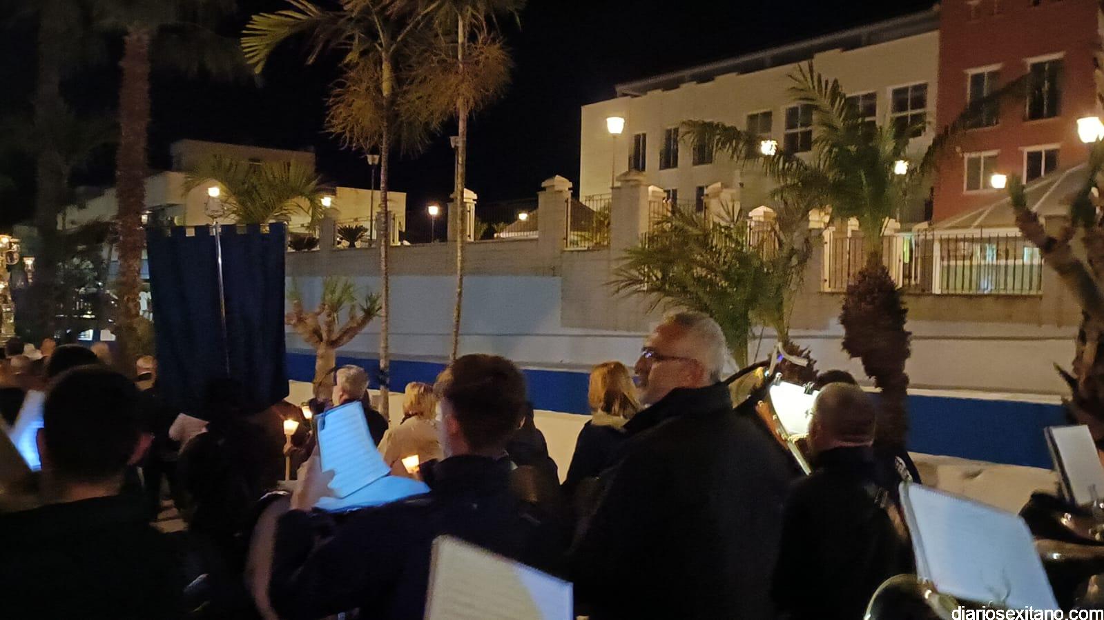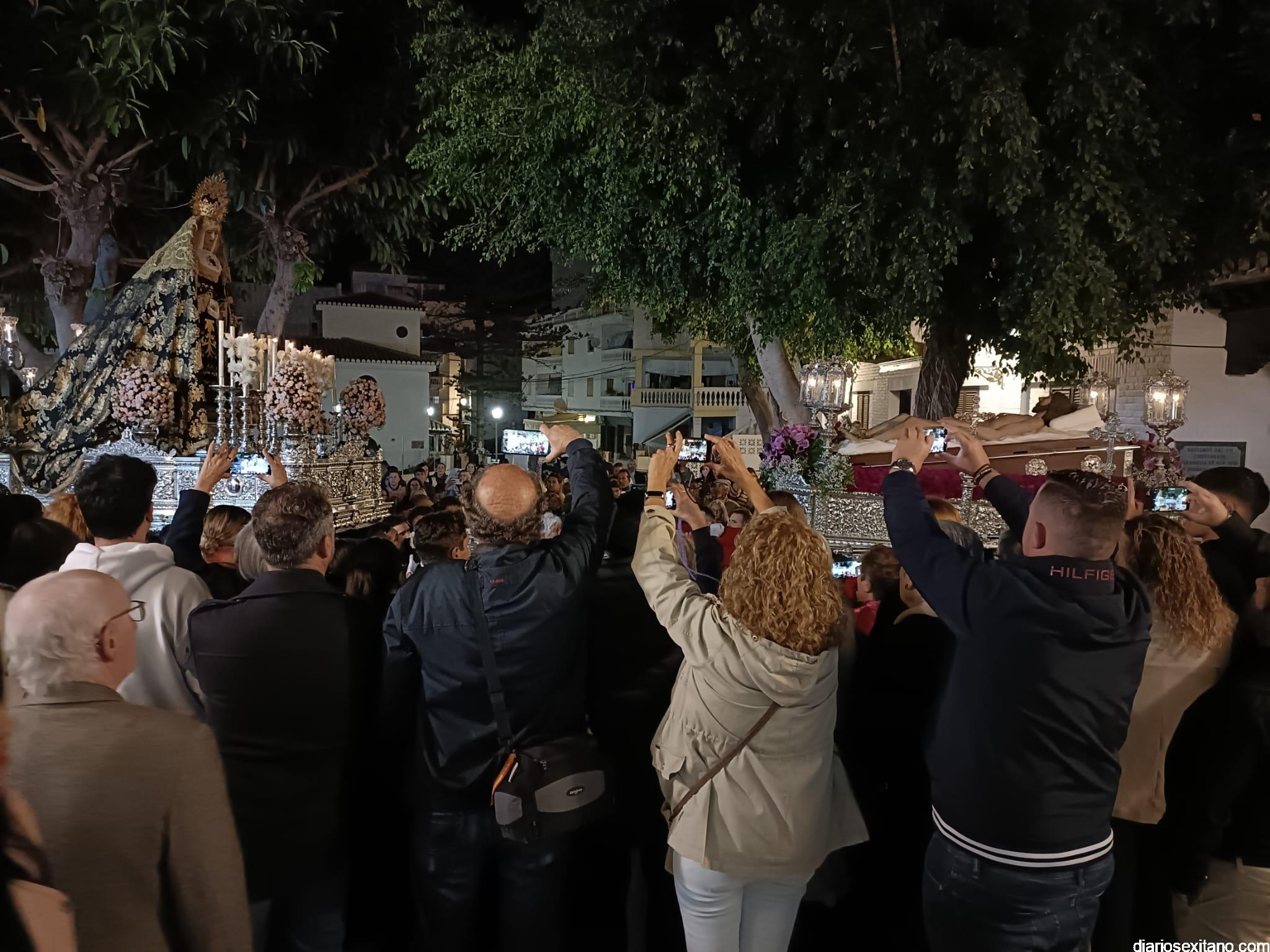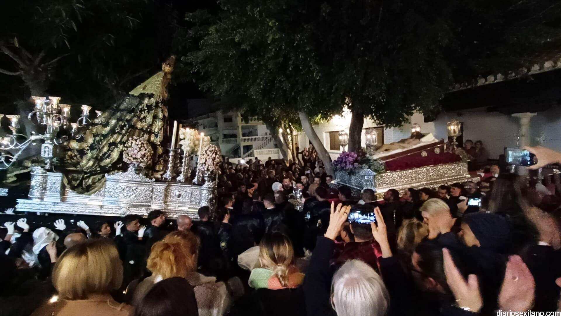 Durante más de dos horas procesionaron los dos pasos que salieron de la Iglesia parroquial de San José pasadas las 9 de la noche. La comitiva, organizada por la Cofradía de La Herradura, que lleva el nombre de los sagrados titulares y que preside Antonio Almanza, estuvo encabezada por el cura párroco Néstor Robledo acompañado por el teniente de alcalde, Daniel Barbero. A los sones de la Banda Municipal de Música de Almuñécar, dirigida por David Pino, y un trío de música de cámara que acompañó al trono del Cristo del Sepulcro, la procesión puso rumbo hacía la calle Canalejas hasta llegar a la calle España para acceder a la calle Real.