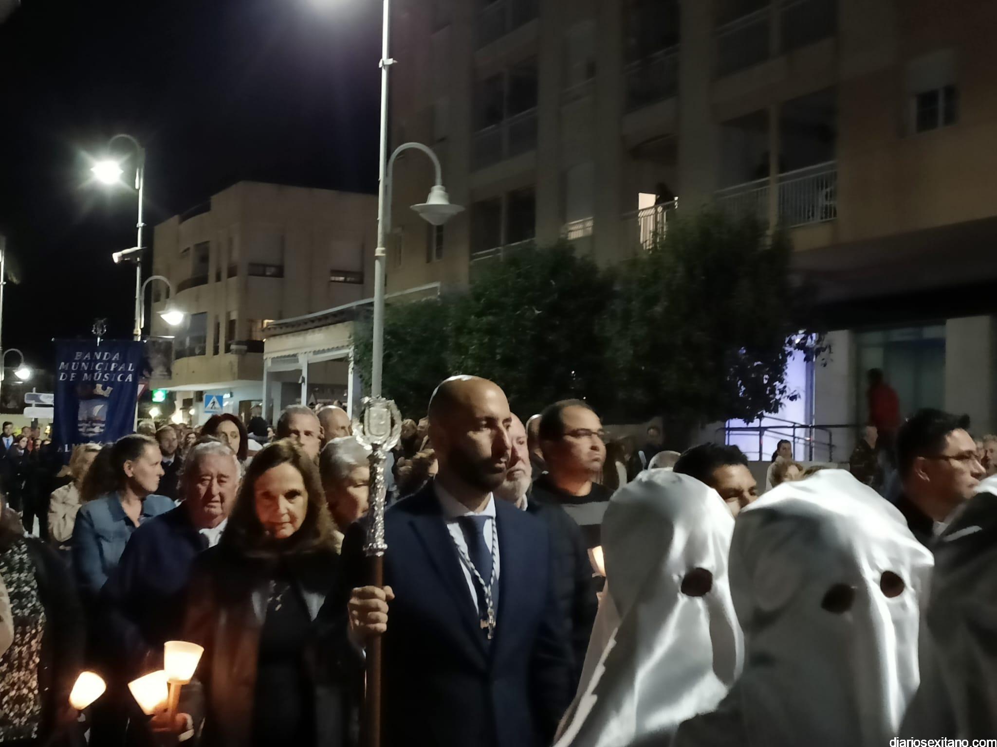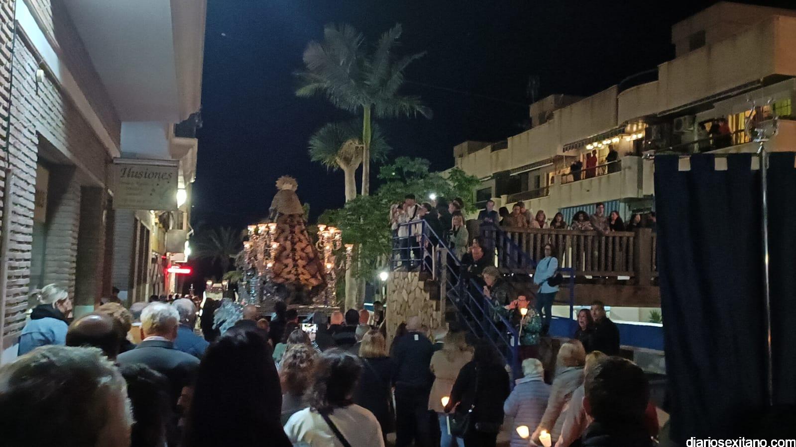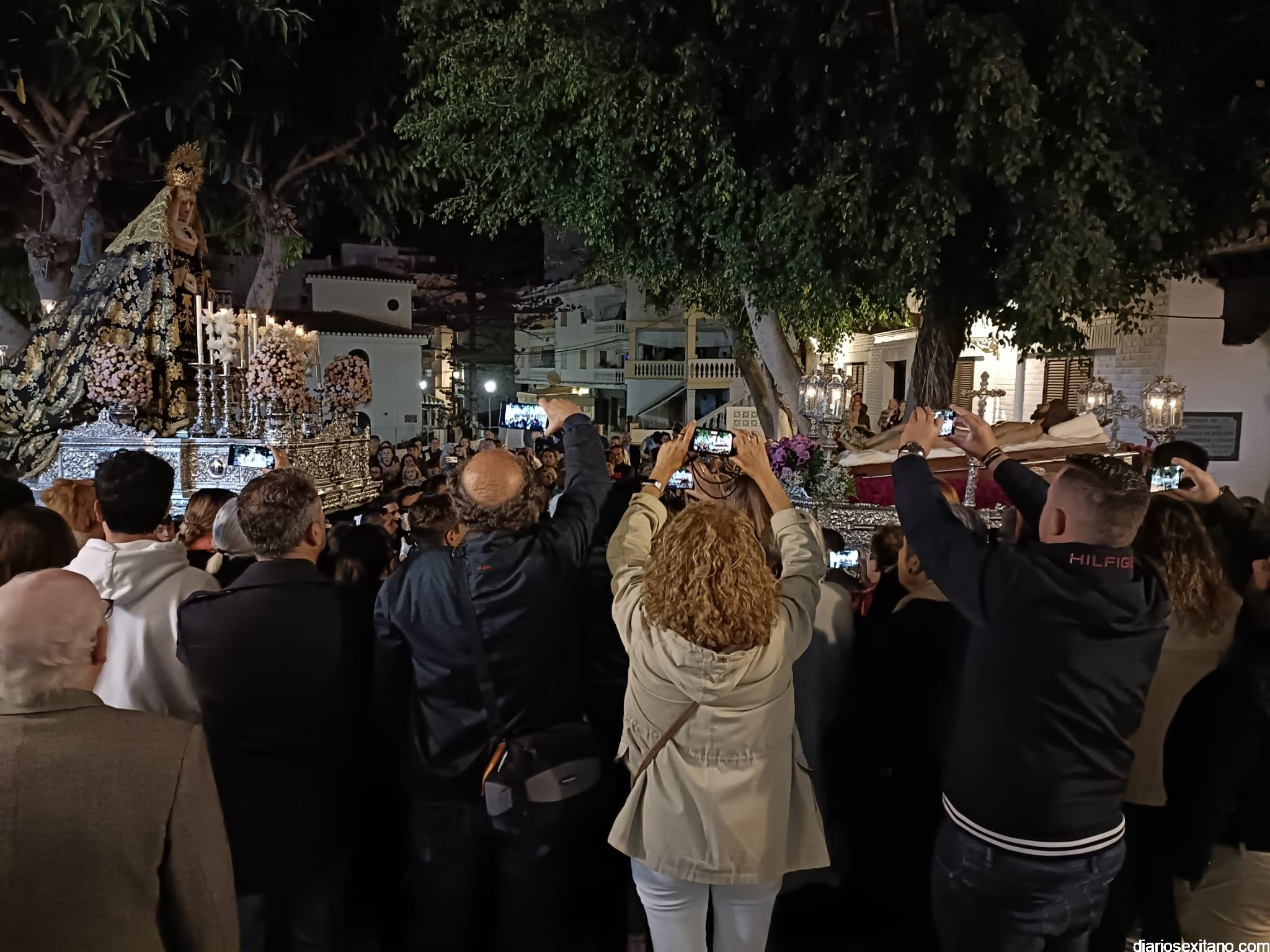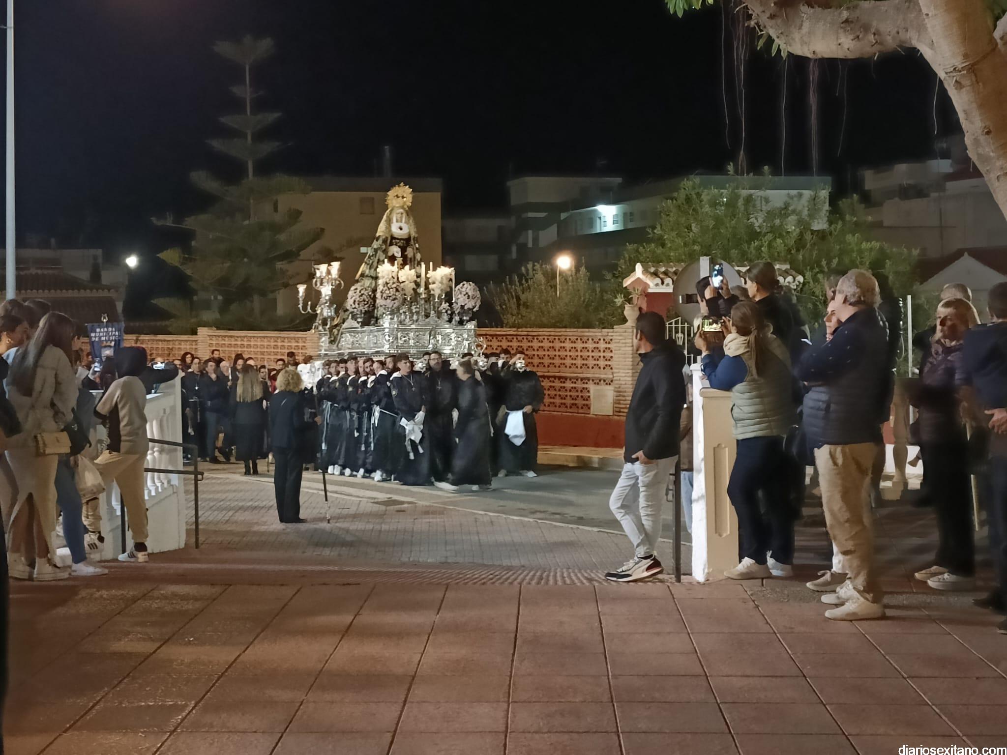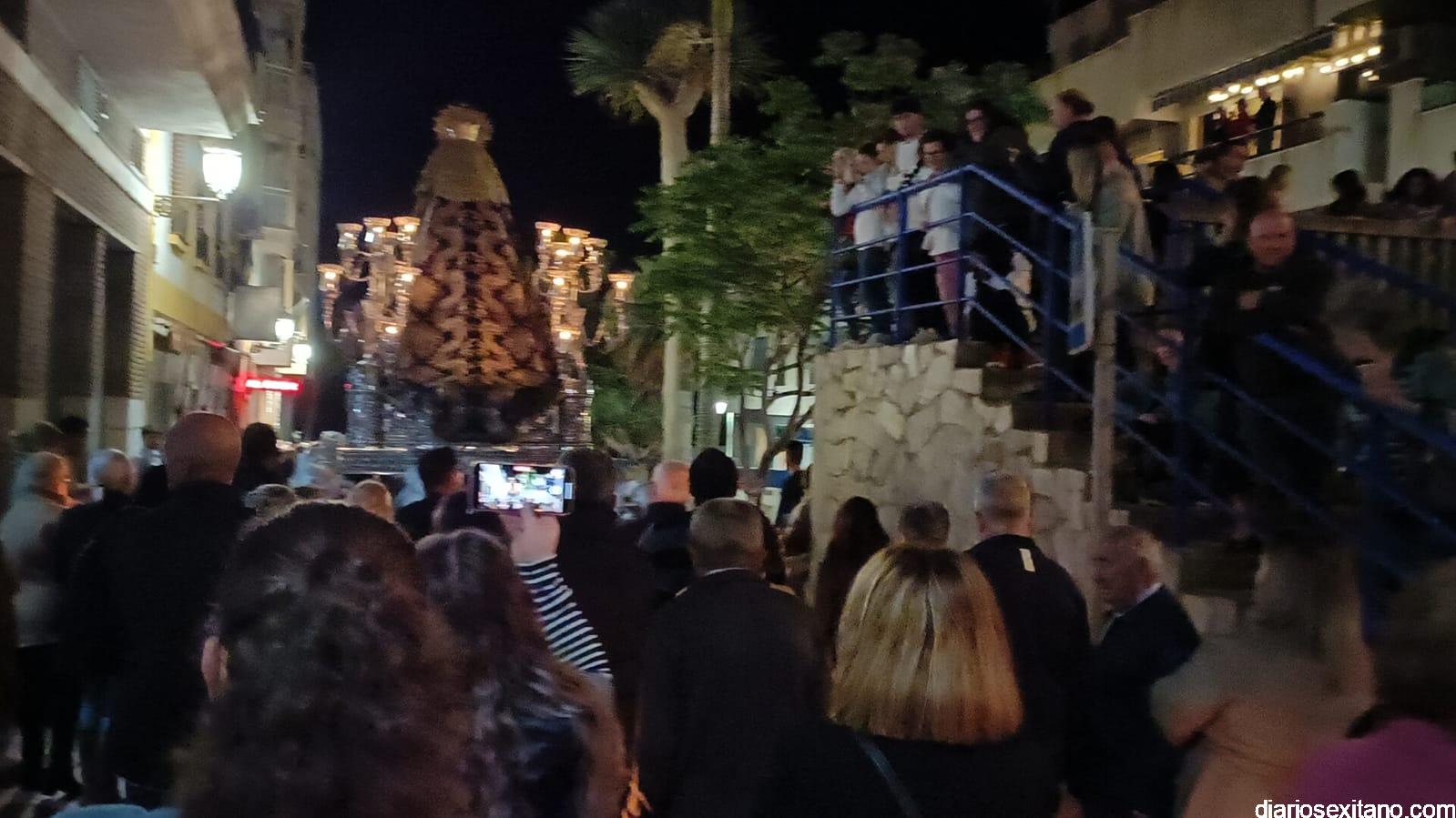 Durante más de dos horas procesionaron los dos pasos que salieron de la Iglesia parroquial de San José pasadas las 9 de la noche. La comitiva, organizada por la Cofradía de La Herradura, que lleva el nombre de los sagrados titulares y que preside Antonio Almanza, estuvo encabezada por el cura párroco Néstor Robledo acompañado por el teniente de alcalde, Daniel Barbero. A los sones de la Banda Municipal de Música de Almuñécar, dirigida por David Pino, y un trío de música de cámara que acompañó al trono del Cristo del Sepulcro, la procesión puso rumbo hacía la calle Canalejas hasta llegar a la calle España para acceder a la calle Real.