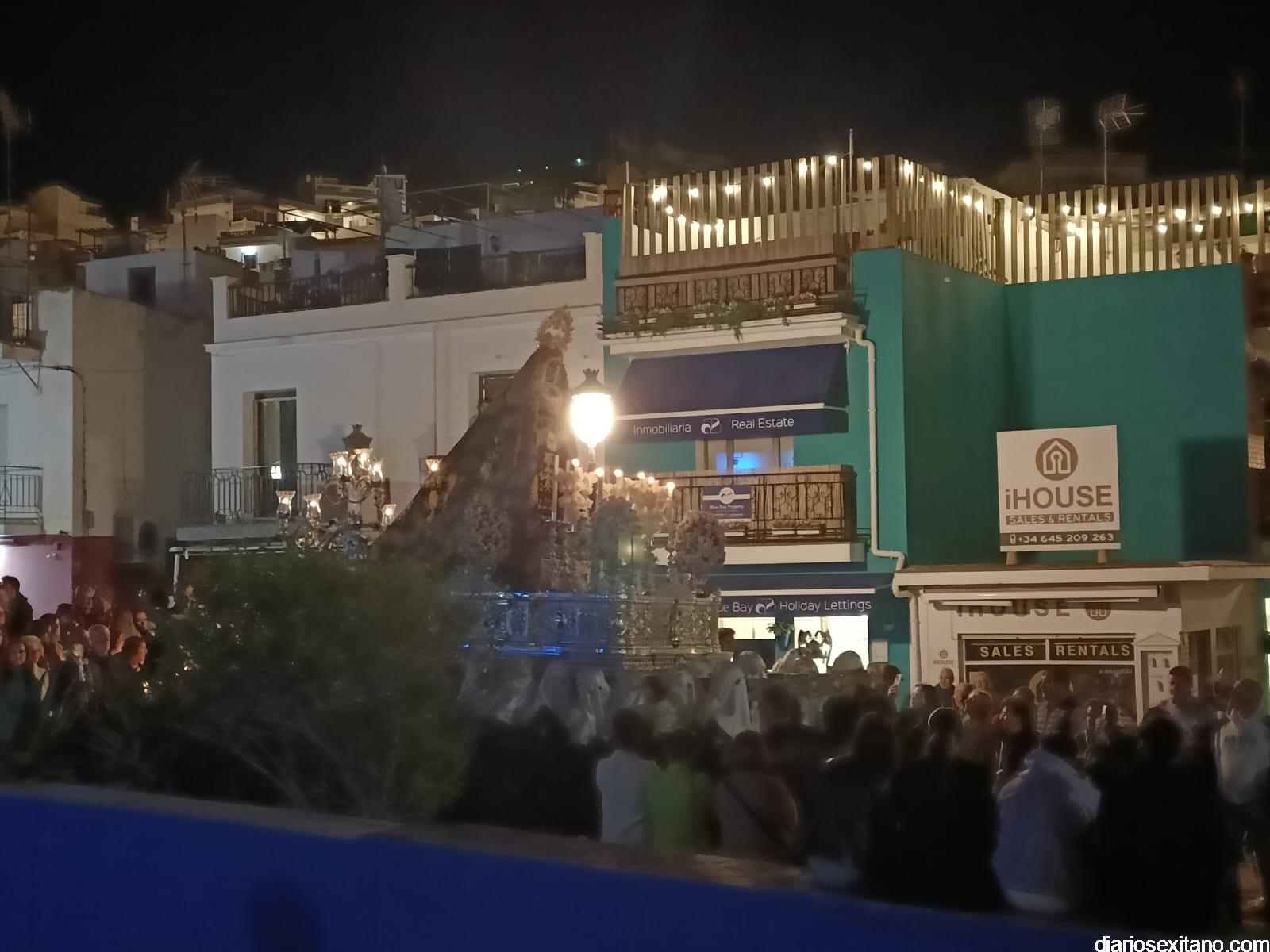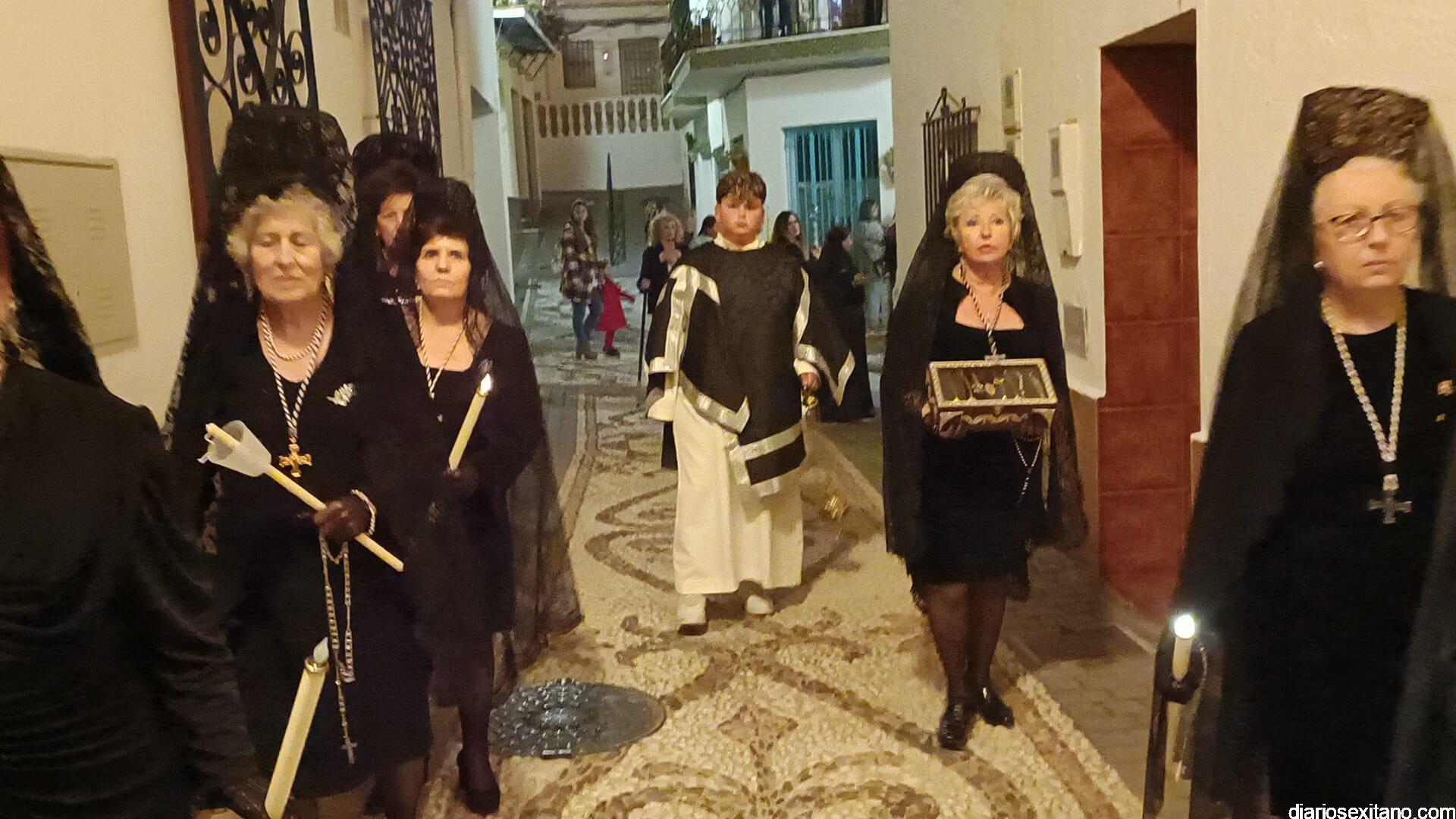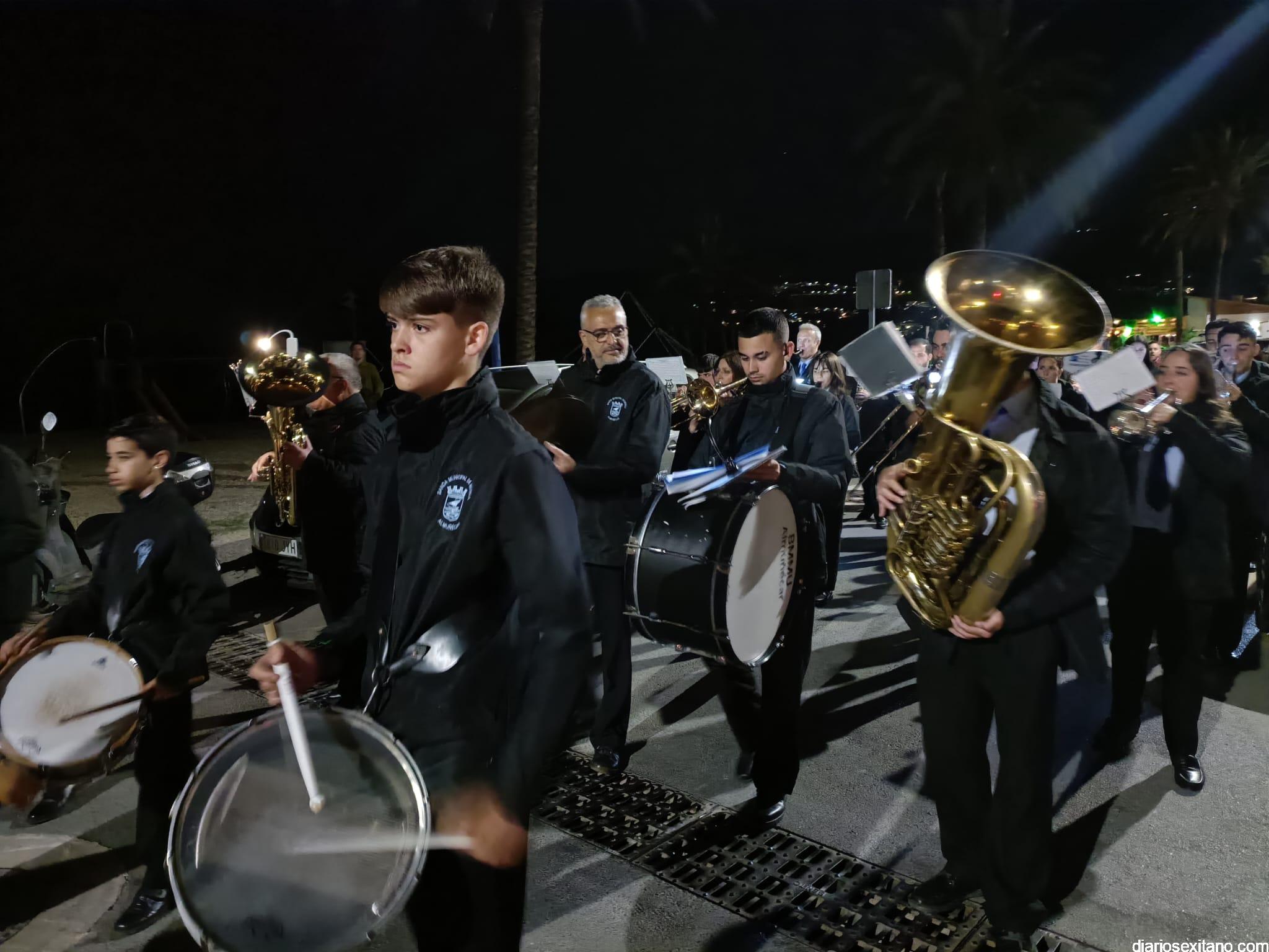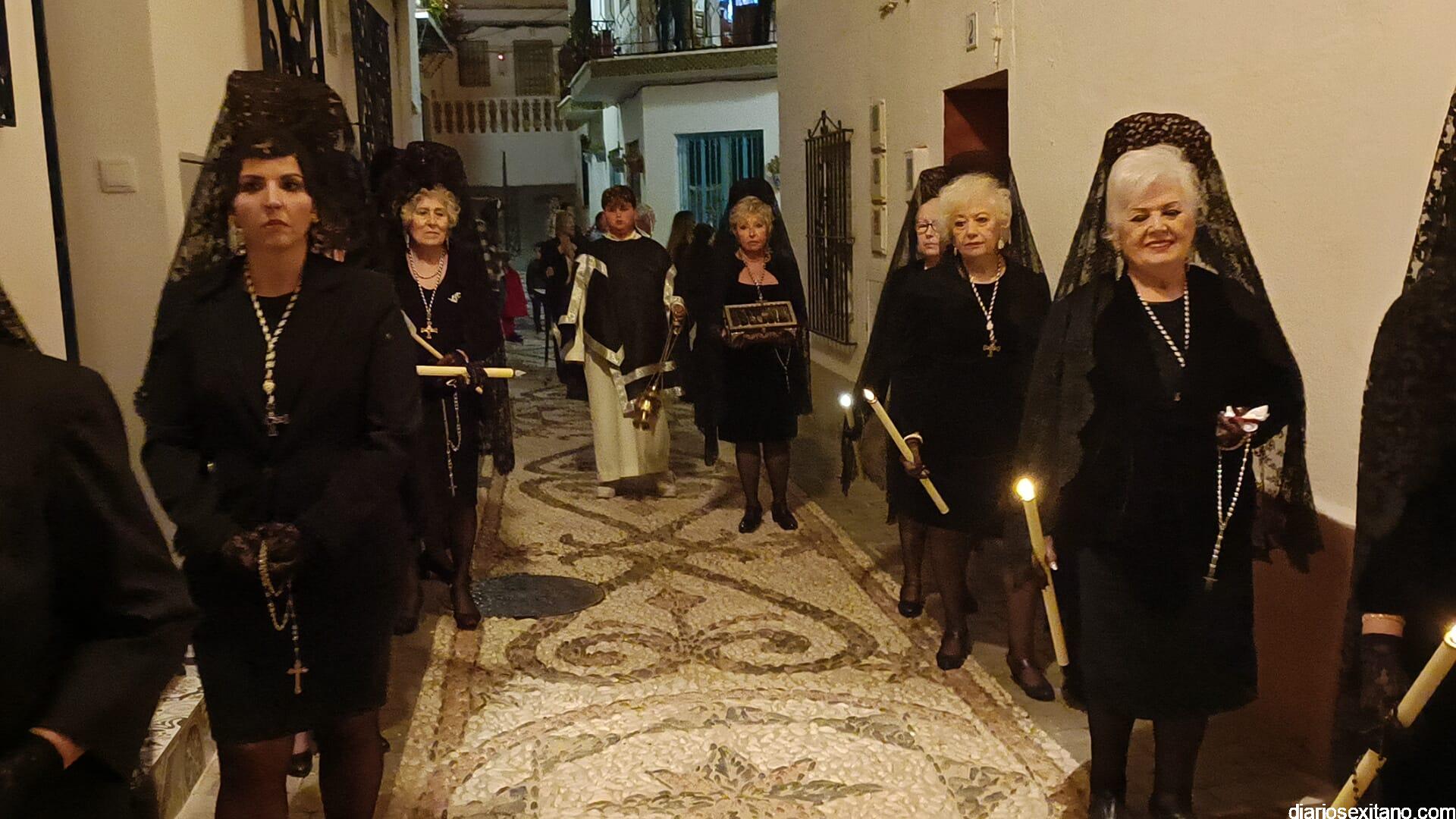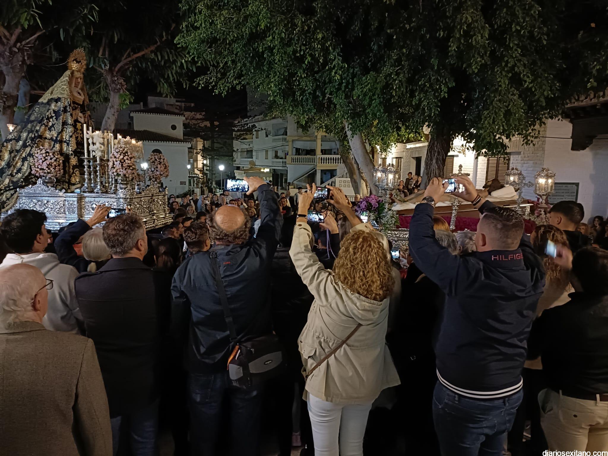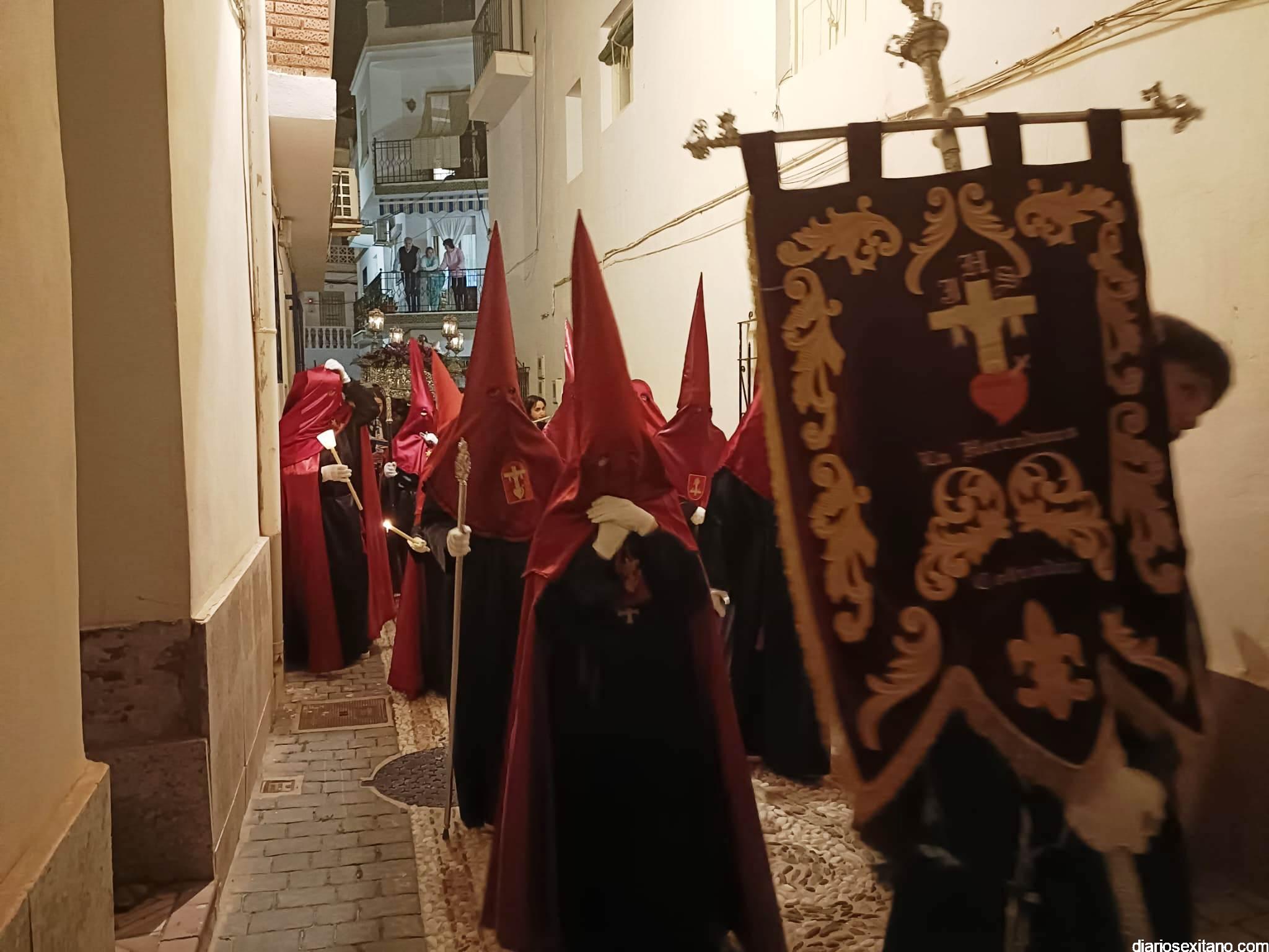 Durante más de dos horas procesionaron los dos pasos que salieron de la Iglesia parroquial de San José pasadas las 9 de la noche. La comitiva, organizada por la Cofradía de La Herradura, que lleva el nombre de los sagrados titulares y que preside Antonio Almanza, estuvo encabezada por el cura párroco Néstor Robledo acompañado por el teniente de alcalde, Daniel Barbero. A los sones de la Banda Municipal de Música de Almuñécar, dirigida por David Pino, y un trío de música de cámara que acompañó al trono del Cristo del Sepulcro, la procesión puso rumbo hacía la calle Canalejas hasta llegar a la calle España para acceder a la calle Real.
