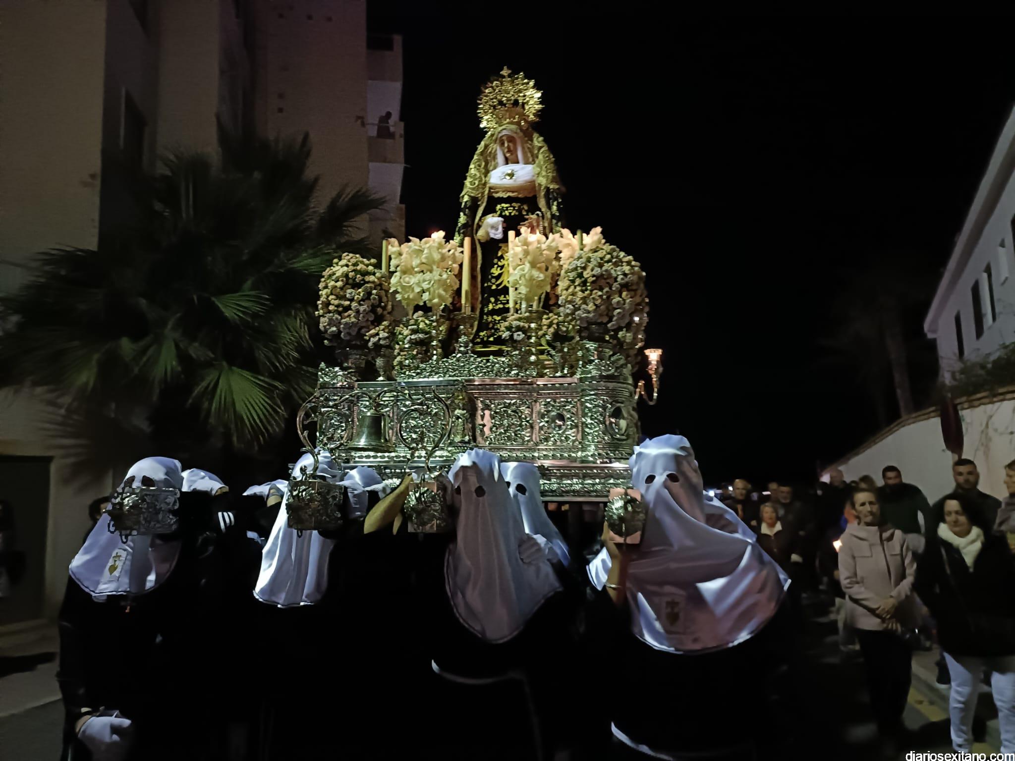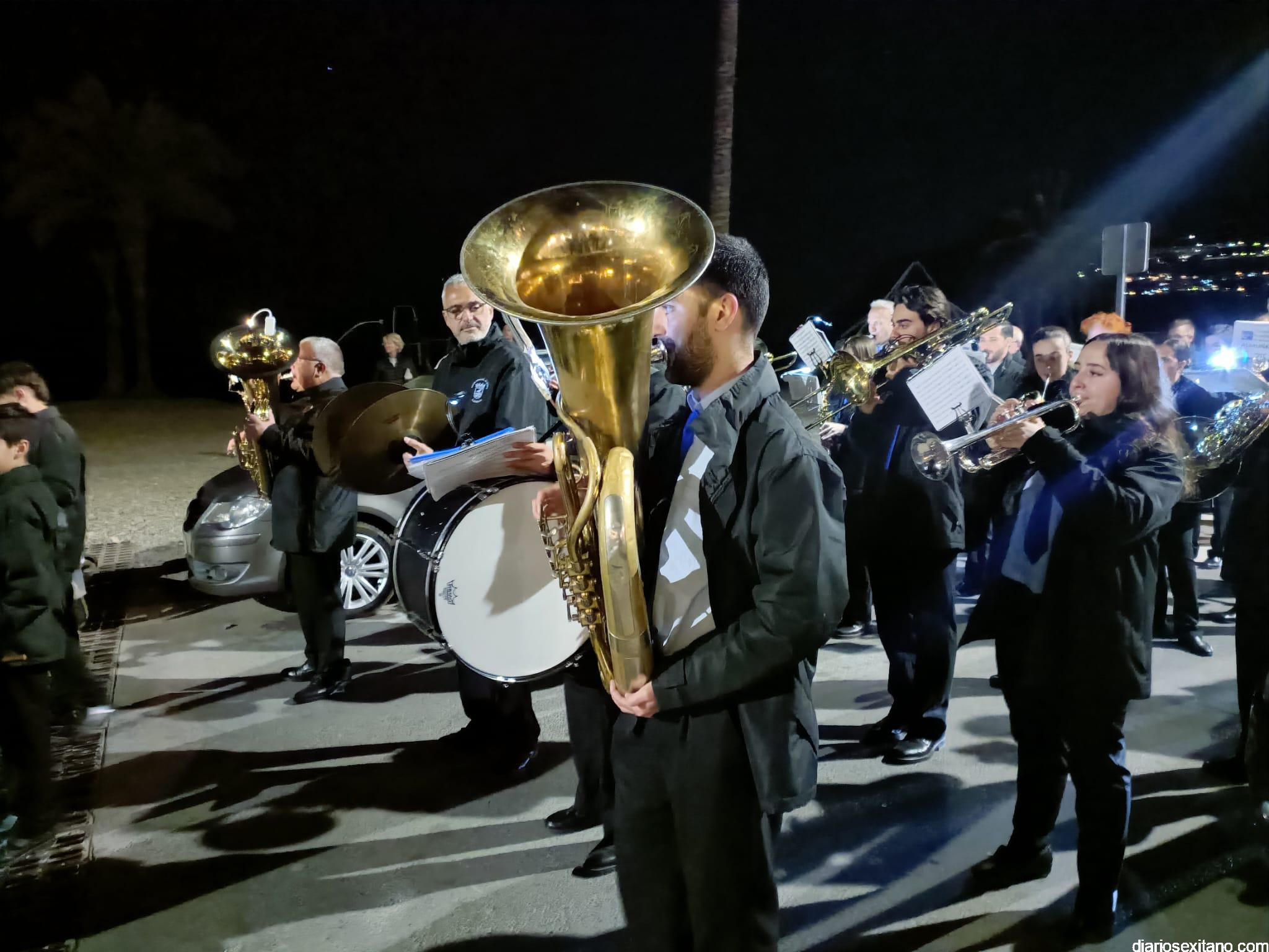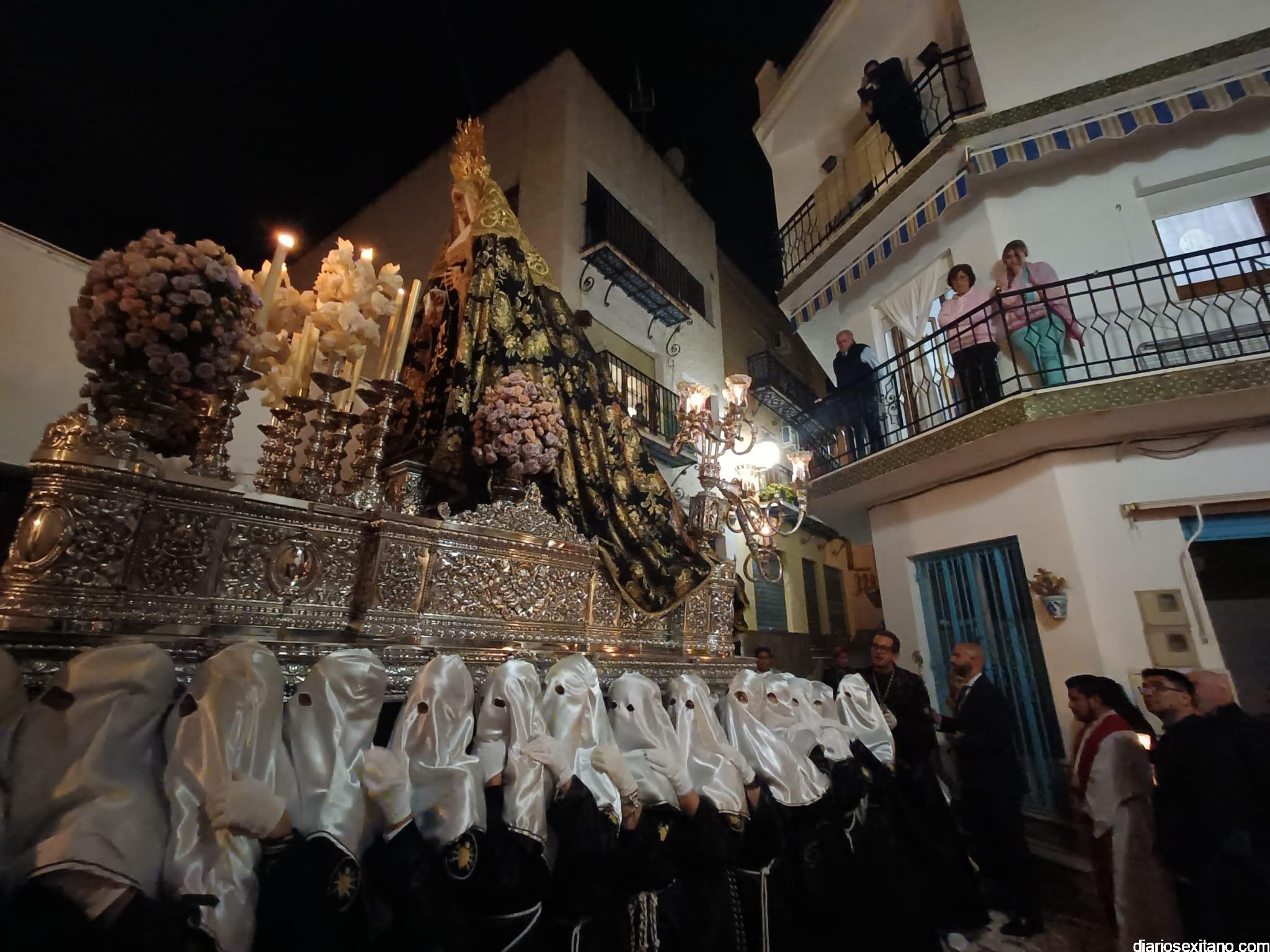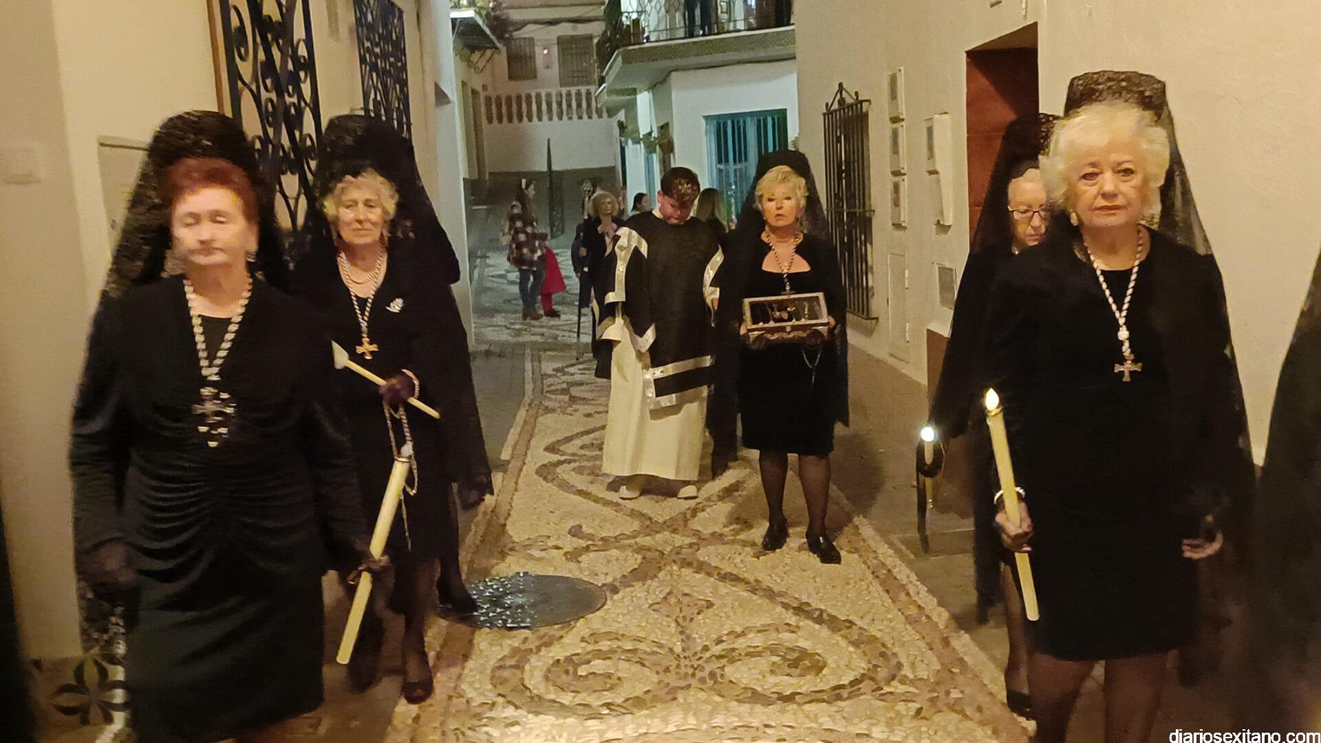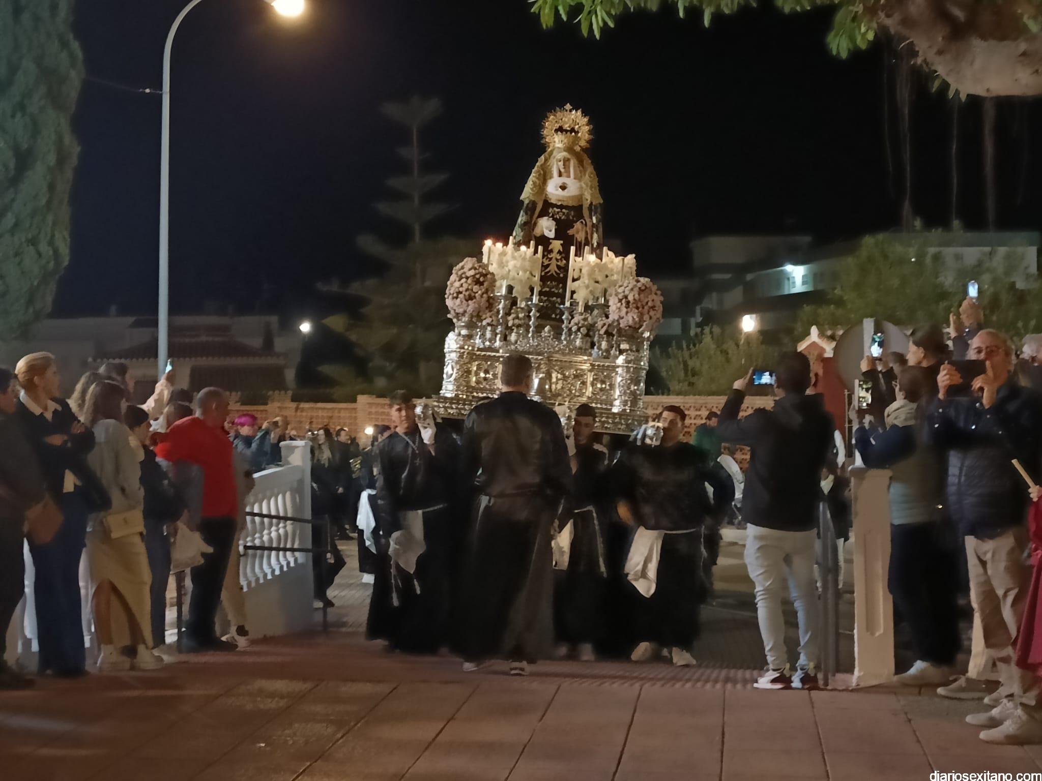 Durante más de dos horas procesionaron los dos pasos que salieron de la Iglesia parroquial de San José pasadas las 9 de la noche. La comitiva, organizada por la Cofradía de La Herradura, que lleva el nombre de los sagrados titulares y que preside Antonio Almanza, estuvo encabezada por el cura párroco Néstor Robledo acompañado por el teniente de alcalde, Daniel Barbero. A los sones de la Banda Municipal de Música de Almuñécar, dirigida por David Pino, y un trío de música de cámara que acompañó al trono del Cristo del Sepulcro, la procesión puso rumbo hacía la calle Canalejas hasta llegar a la calle España para acceder a la calle Real.