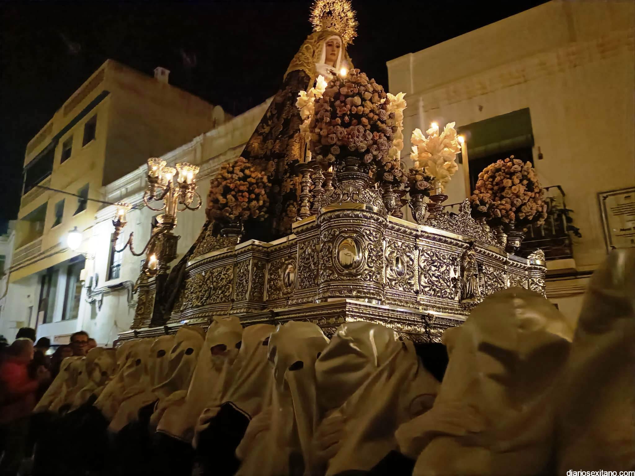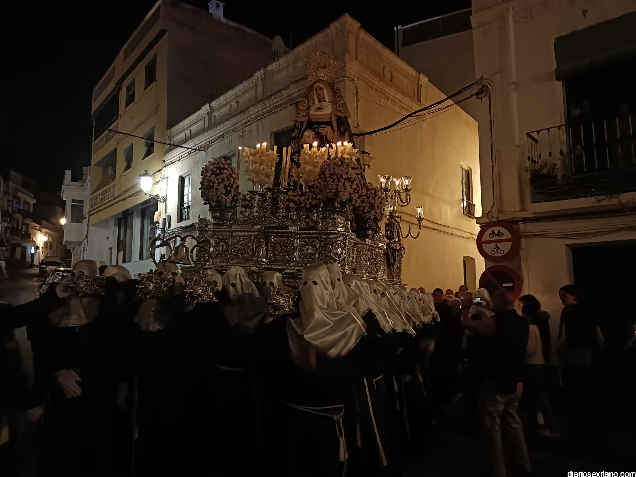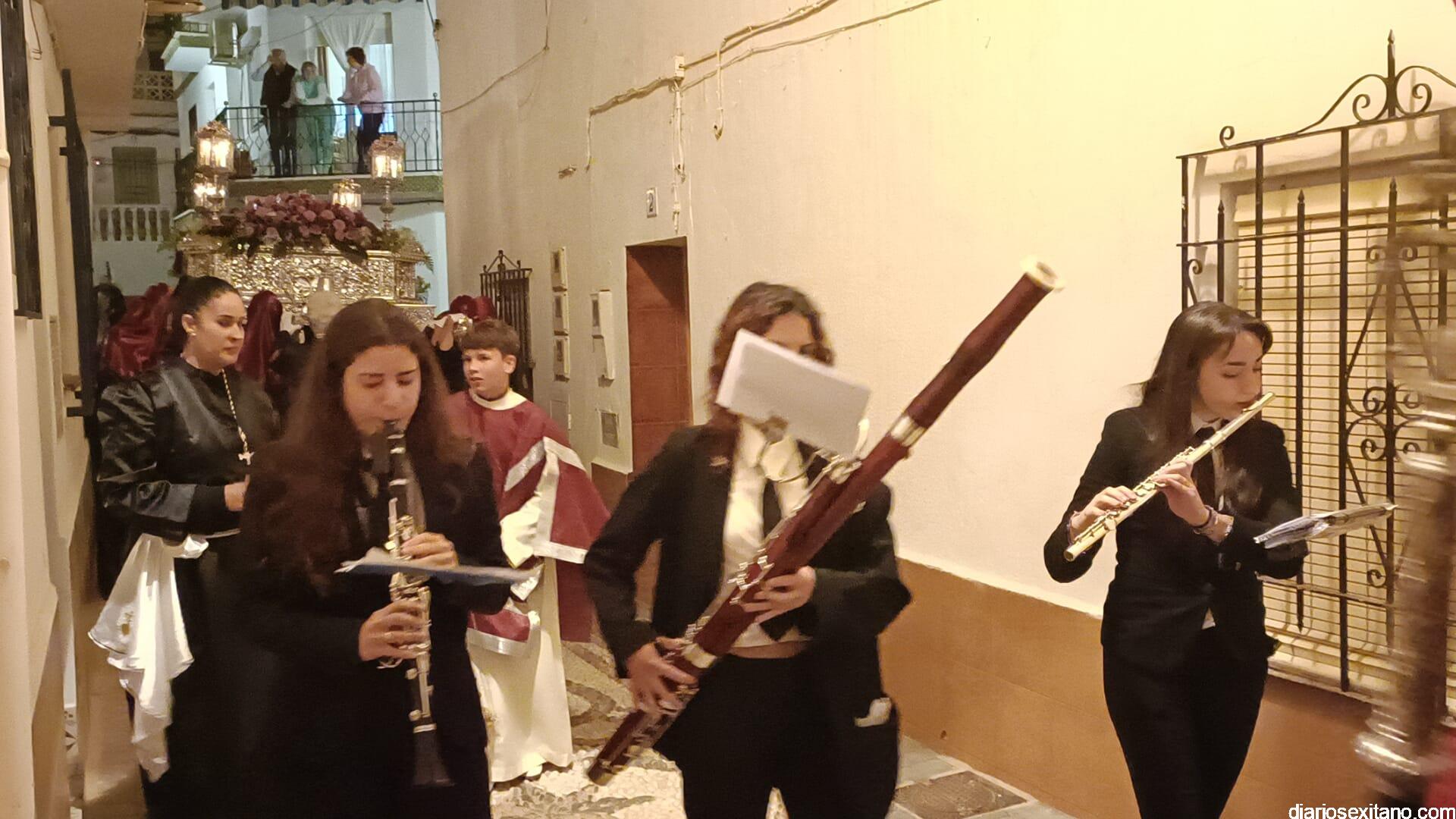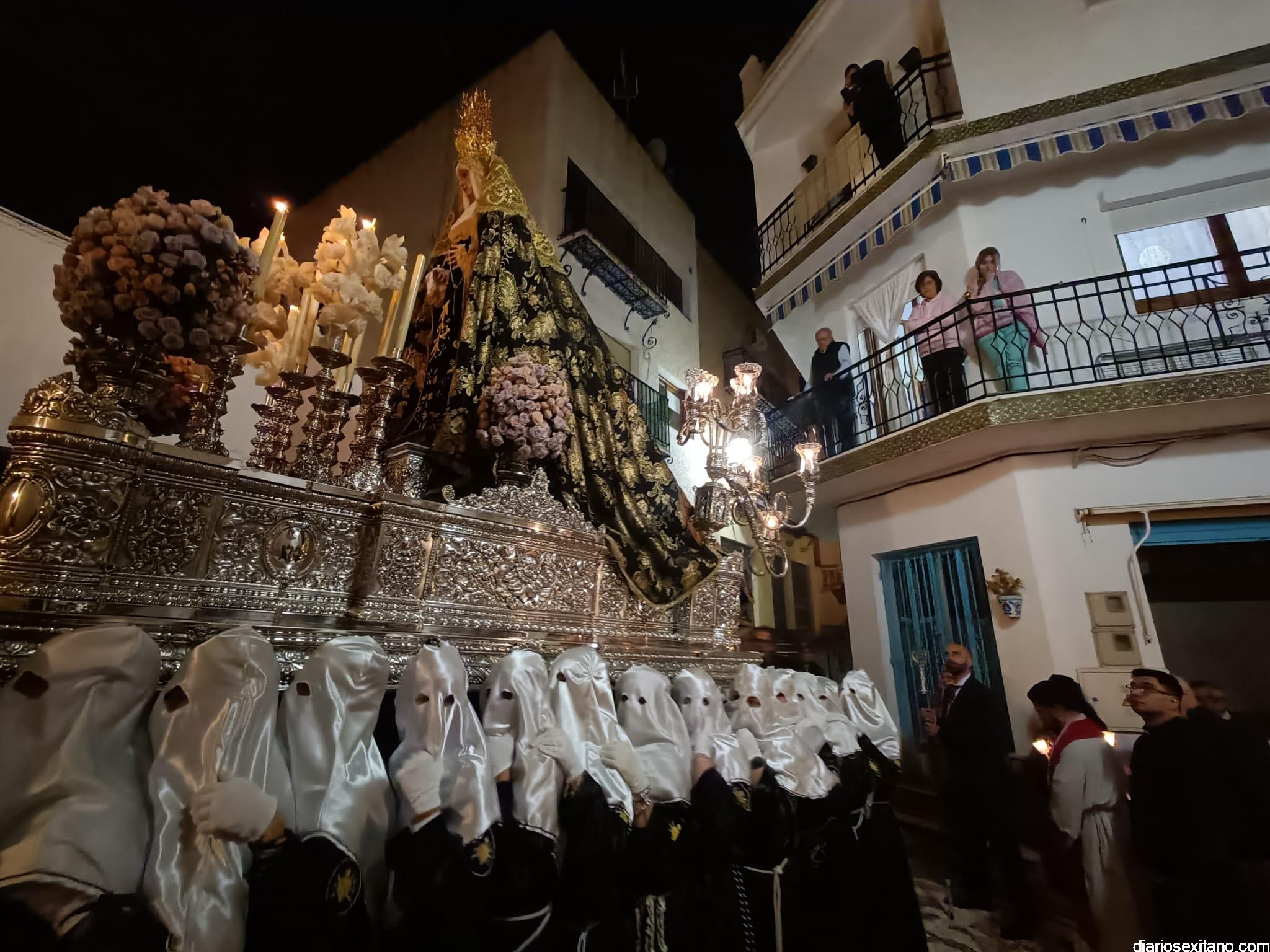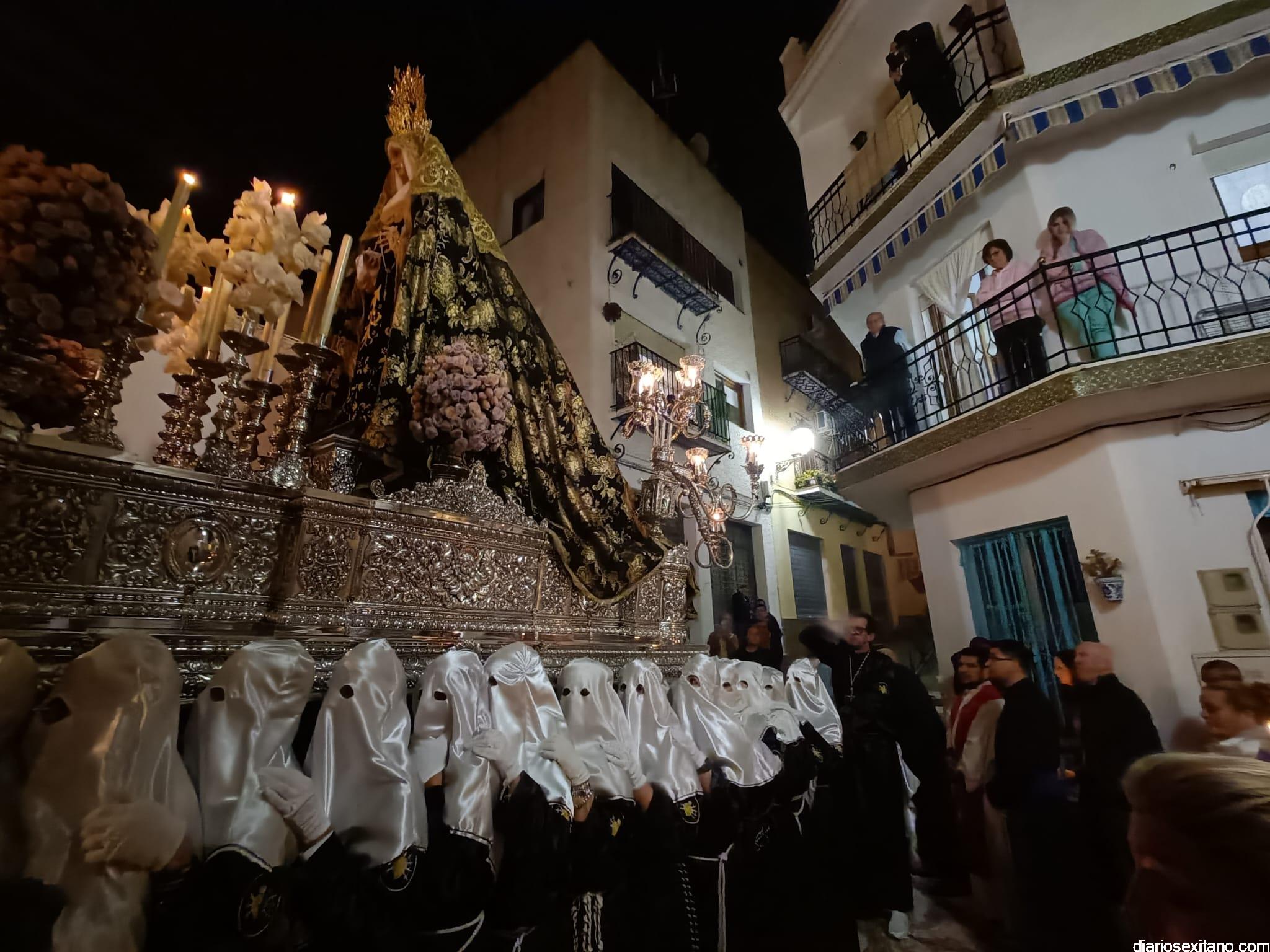 Durante más de dos horas procesionaron los dos pasos que salieron de la Iglesia parroquial de San José pasadas las 9 de la noche. La comitiva, organizada por la Cofradía de La Herradura, que lleva el nombre de los sagrados titulares y que preside Antonio Almanza, estuvo encabezada por el cura párroco Néstor Robledo acompañado por el teniente de alcalde, Daniel Barbero. A los sones de la Banda Municipal de Música de Almuñécar, dirigida por David Pino, y un trío de música de cámara que acompañó al trono del Cristo del Sepulcro, la procesión puso rumbo hacía la calle Canalejas hasta llegar a la calle España para acceder a la calle Real.
