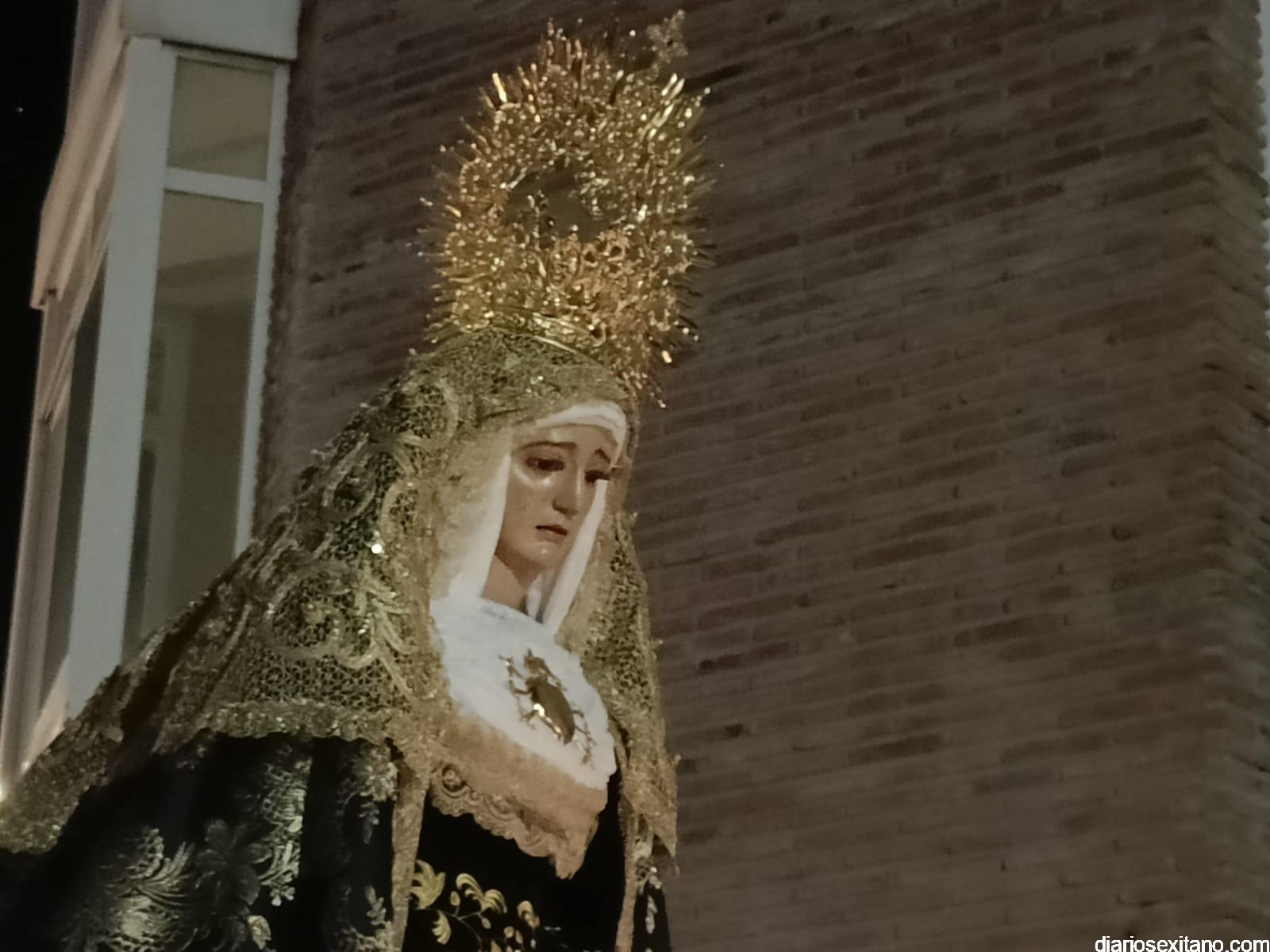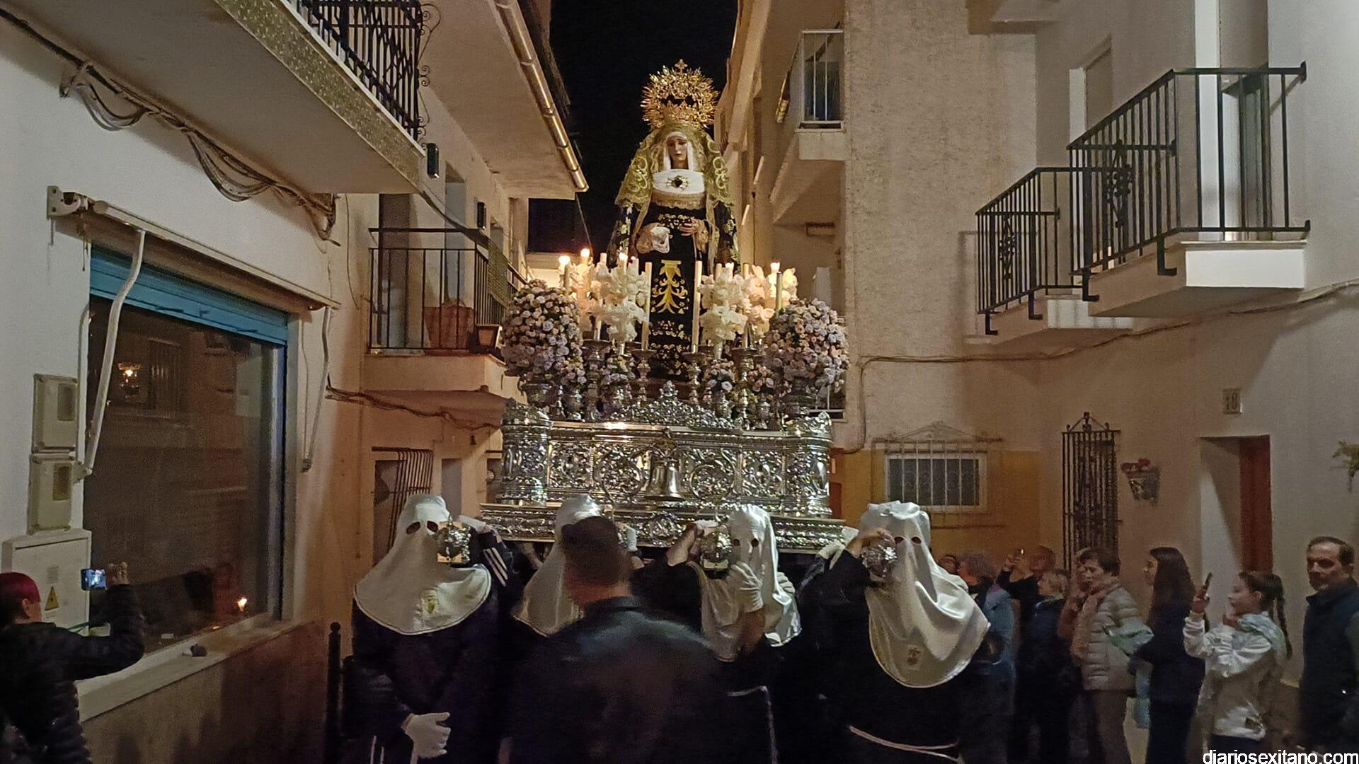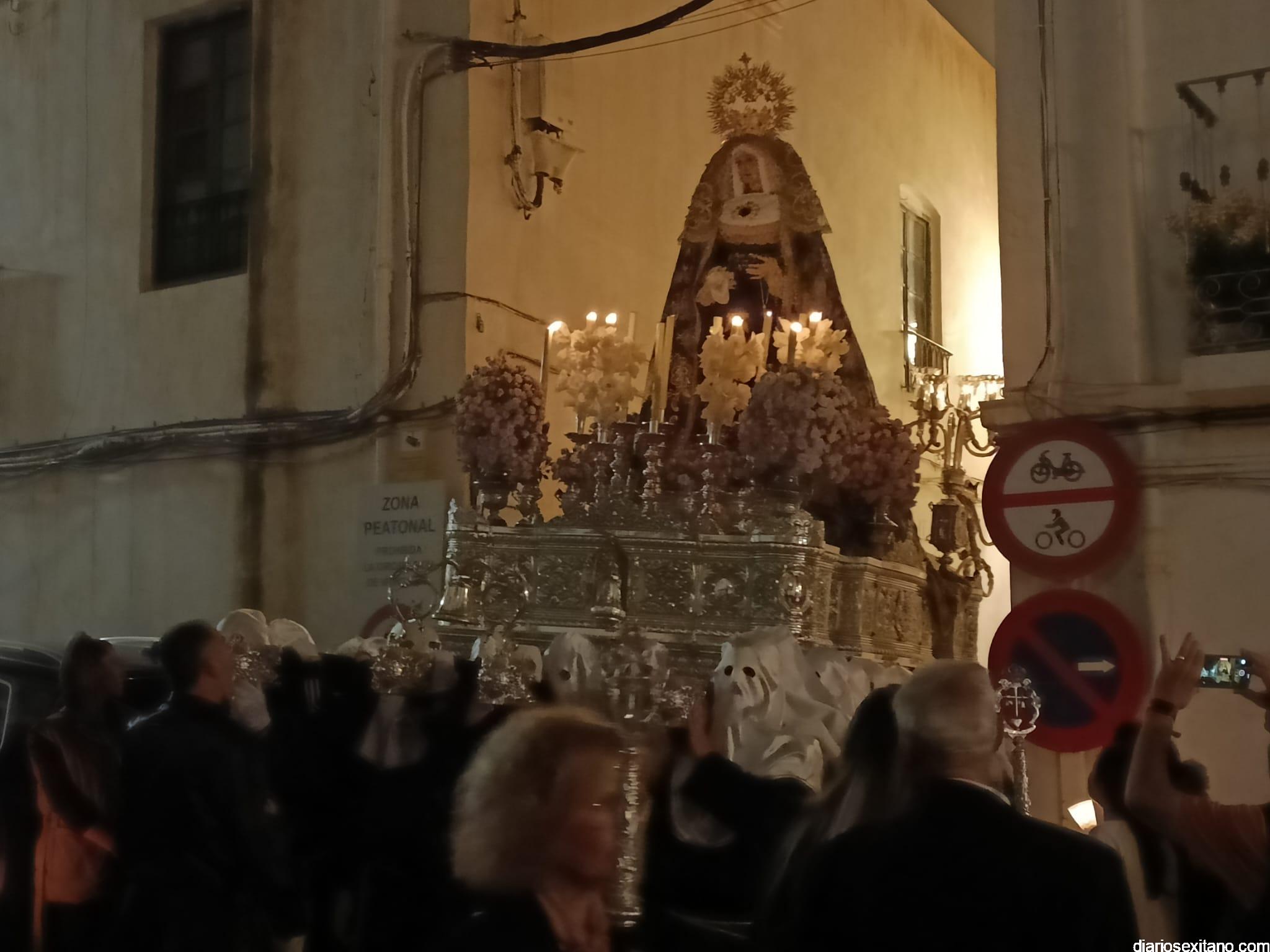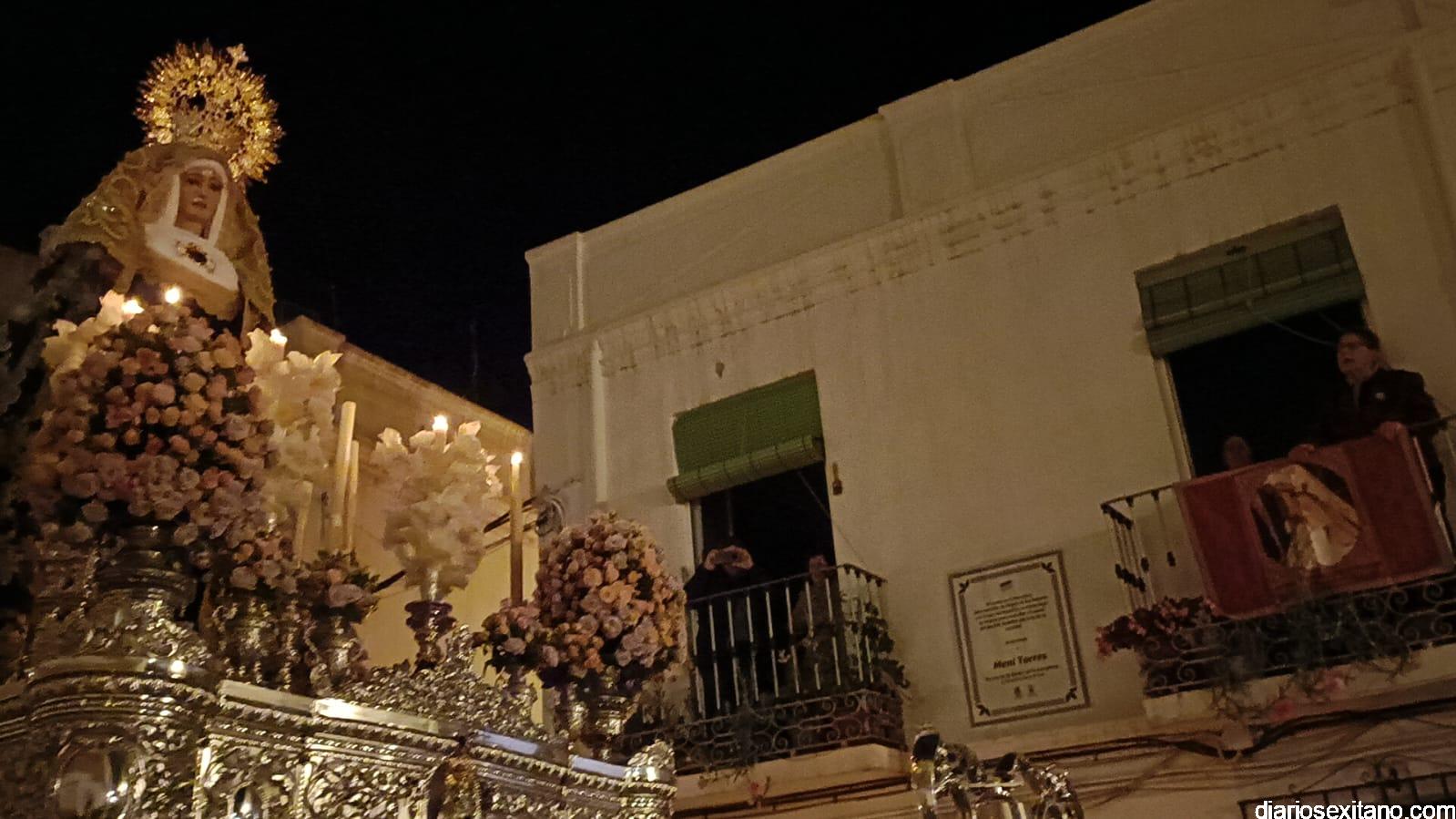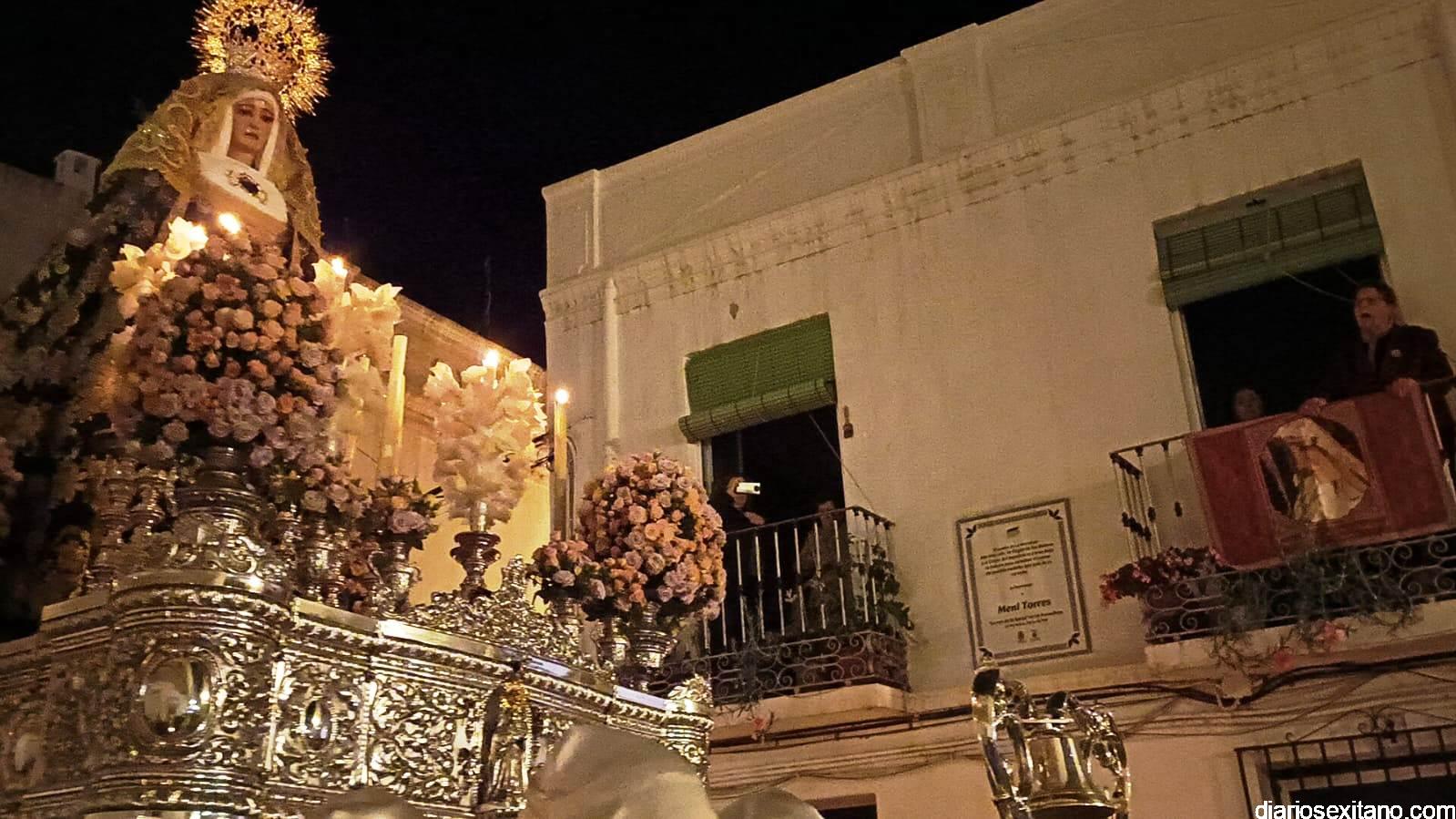 En este punto se vivió el momento más emotivo de la noche con la saeta que cantó Meni Torres a la Virgen de los Dolores en la que agradeció la petición que le hizo de ayuda por hijo. Los horquilleros y horquilleras de la Virgen también realizaron una levantá por el hermano cofrade, Ernesto. Fue, sin duda, el momento más destacado del recorrido antes de acceder a la Acera de Pilar, que llevaría a la comitiva hasta el paseo Andrés Segovia hasta llegar al Barranquillo y volver al templo.