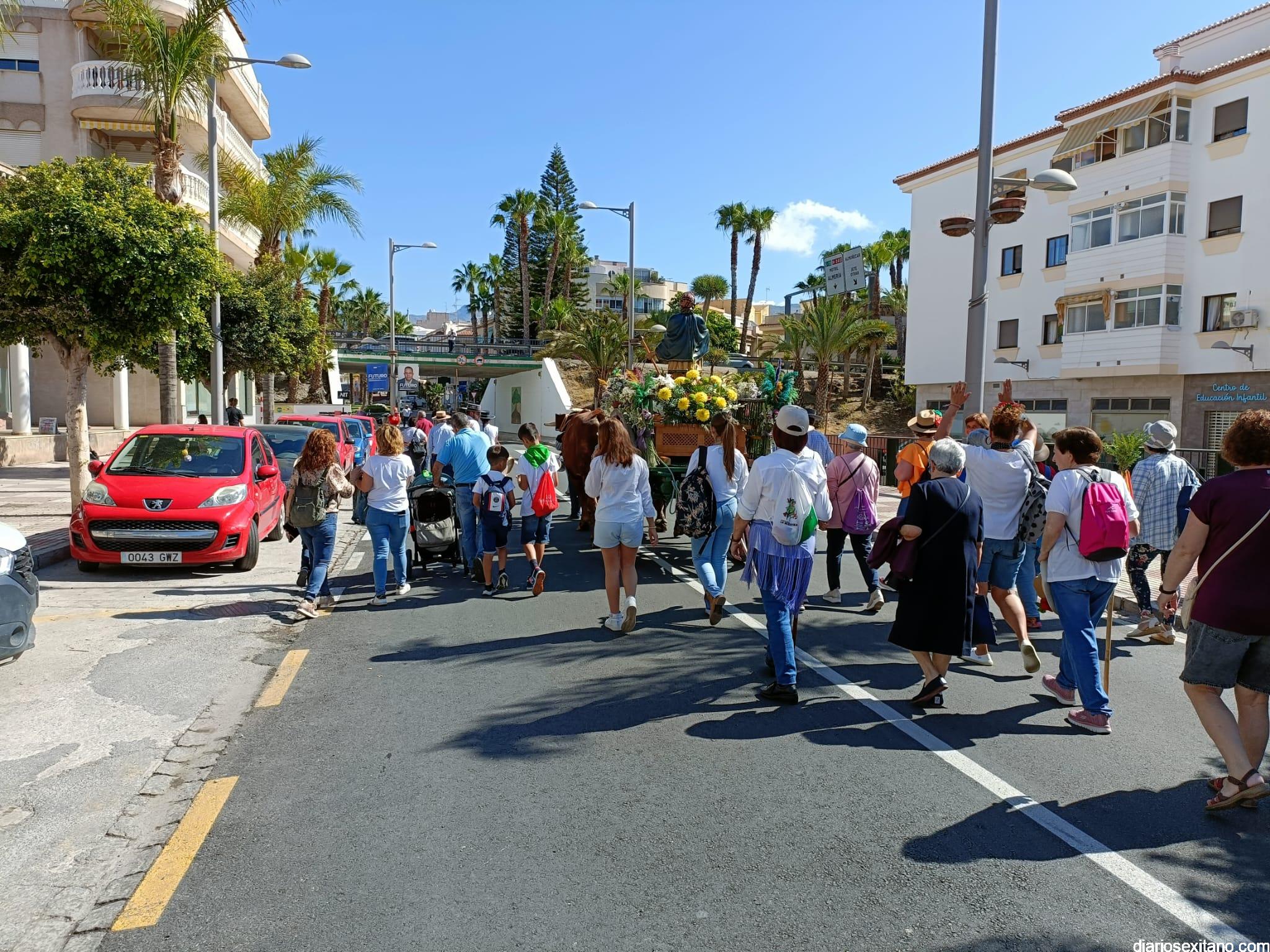 Antes el Párroco de Almuñécar invitó a los asistentes a rezar una plegaria al Patrón de los agricultores pidiéndole la lluvia para regar los campos. Sobre la 10,30 horas un repique de campanas y a los sones de tres tamborileros llegados de Málaga salía el cortejo del pórtico de la iglesia El Salvador para llegar a la calle Tetuán, donde se sumaron casi una treintena de carrozas que formaron la Romería ya por el centro urbano para poner rumbo la Vega de Río Verde tras recorrer la avenida Rey Juan Carlos I, La Carrera y Carretera del Suspiro para salir al barrio La Paloma por calle Molvízar. Numerosos vecinos salieron al encuentro para saludar y despedir a los romeros.