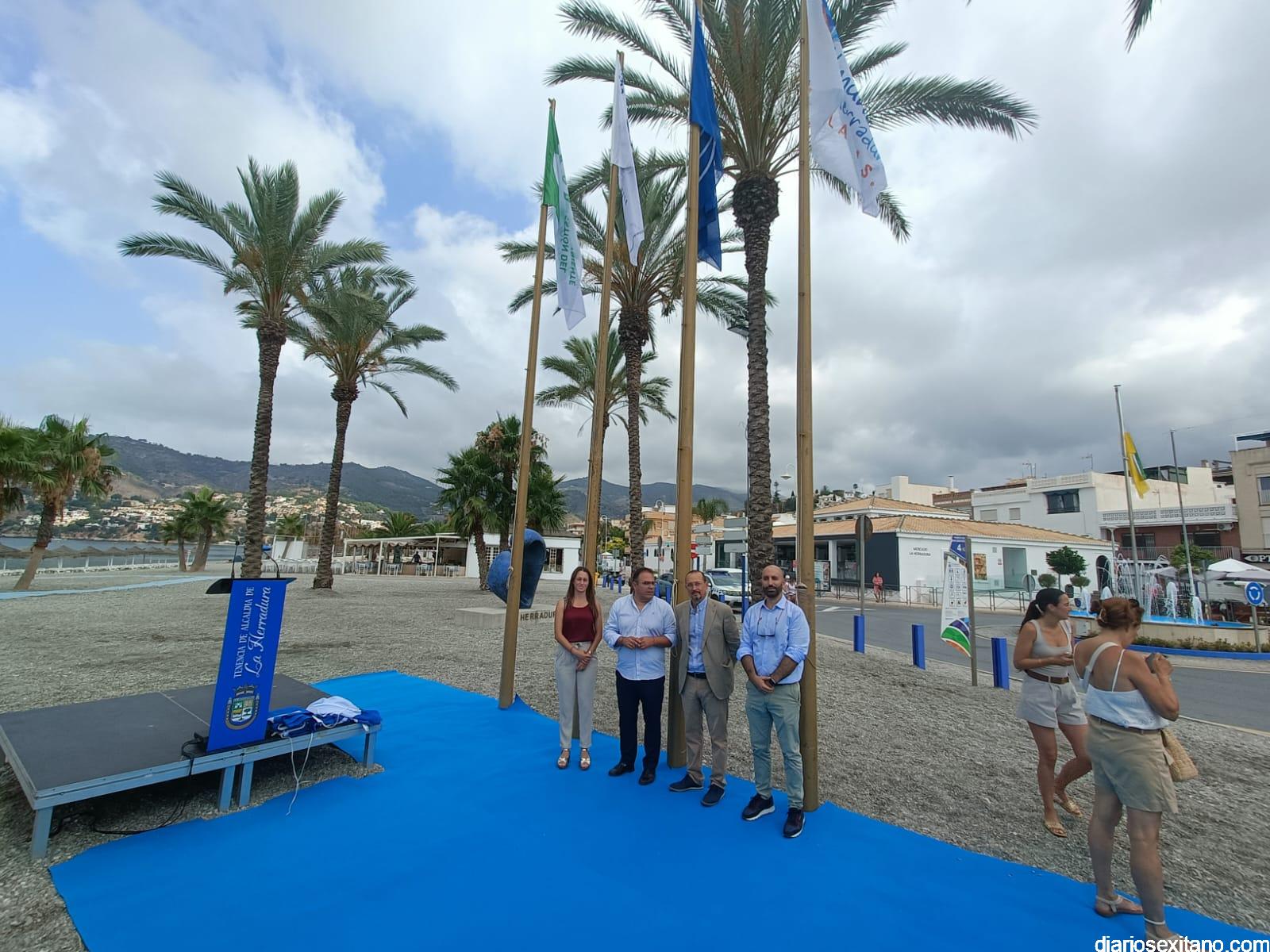 La playa de La Herradura ha acogido este viernes el acto oficial del izado de las banderas azules que ondean este verano en las cinco playas que ha concedido la ADEAC para las playas sexitanas de: La Herradura, Marina del Este, San Cristóbal, Puerta del Mar y Velilla. A las que se suma en el municipio la del puerto deportivo de Marina del Este, con lo cual son seis banderas azules las que ondean este verano en el destino Almuñécar La Herradura.