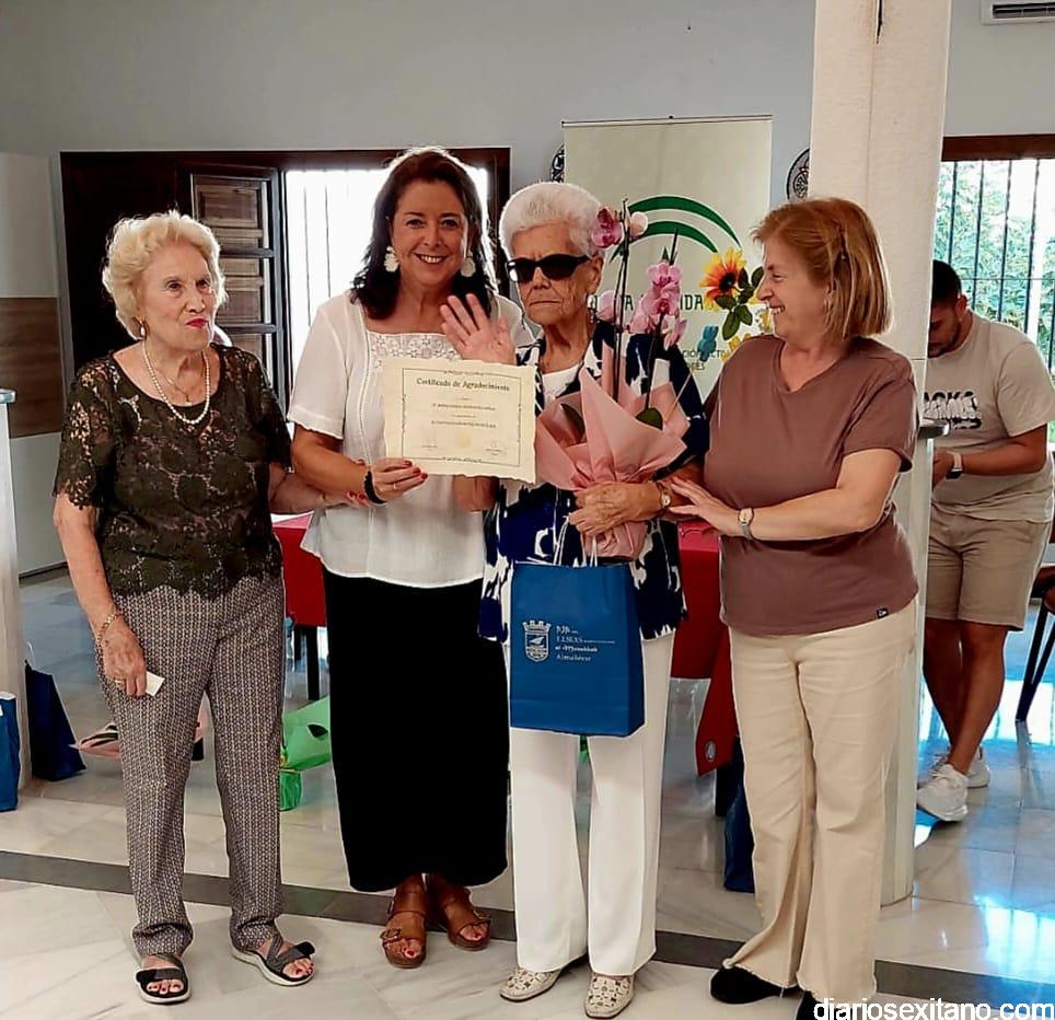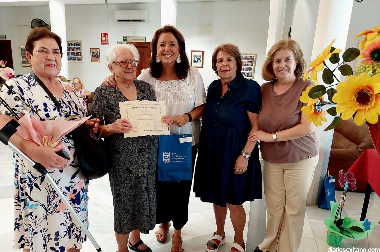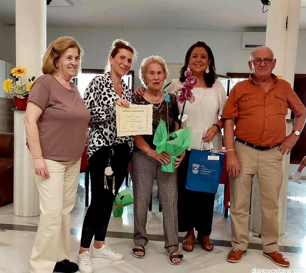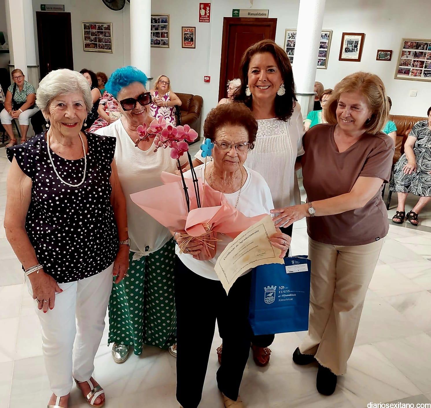 María Teresa García González, Emilia Fernández Jerónimo, María Teresa Rodríguez García, María Sánchez García, Dolores Montoro Maturana, recibieron su diploma, ramos de flores y regalo con motivo del homenaje “y, lo que es más importante, el reconocimiento de toda la comunidad”, dijo la edil sexitana de Mayores.