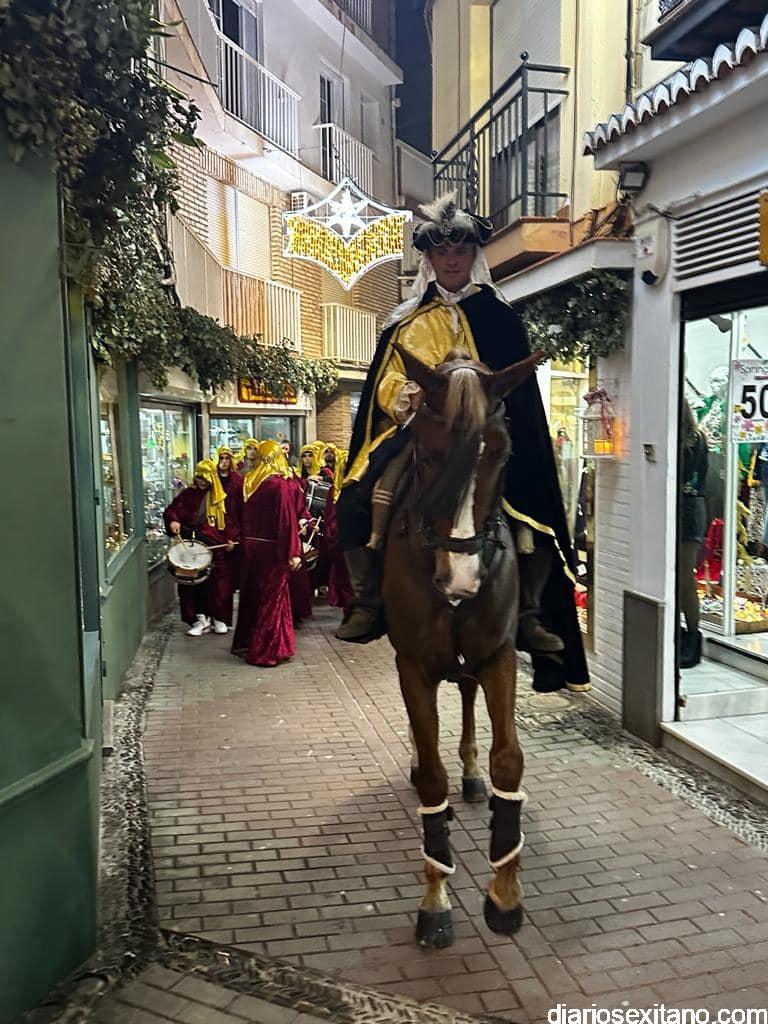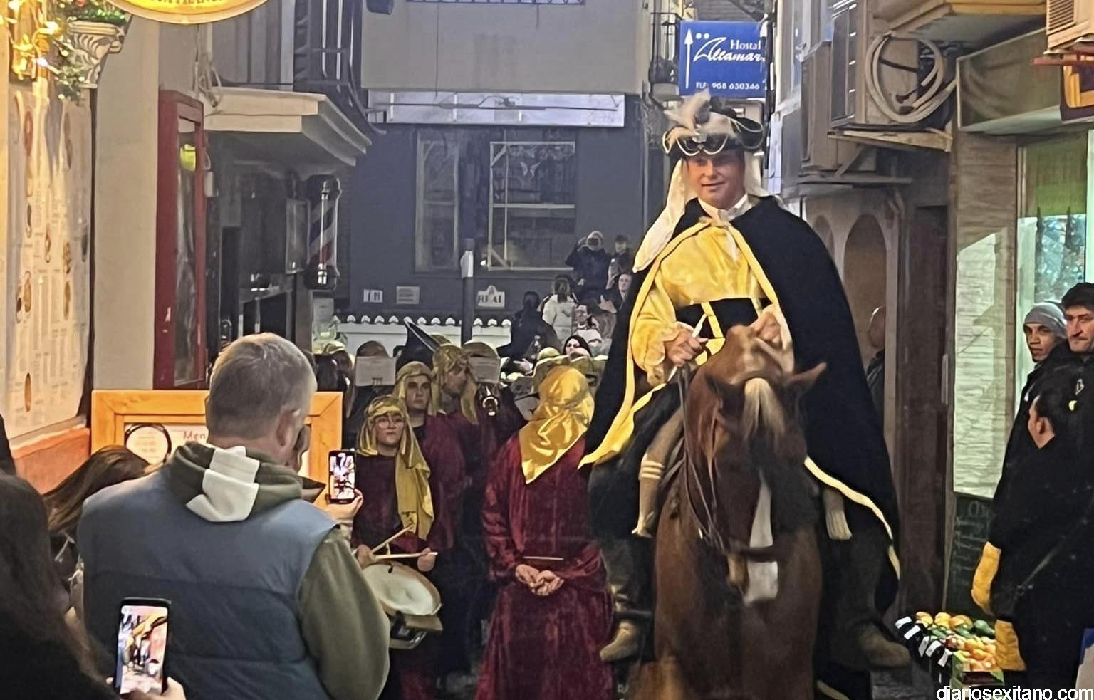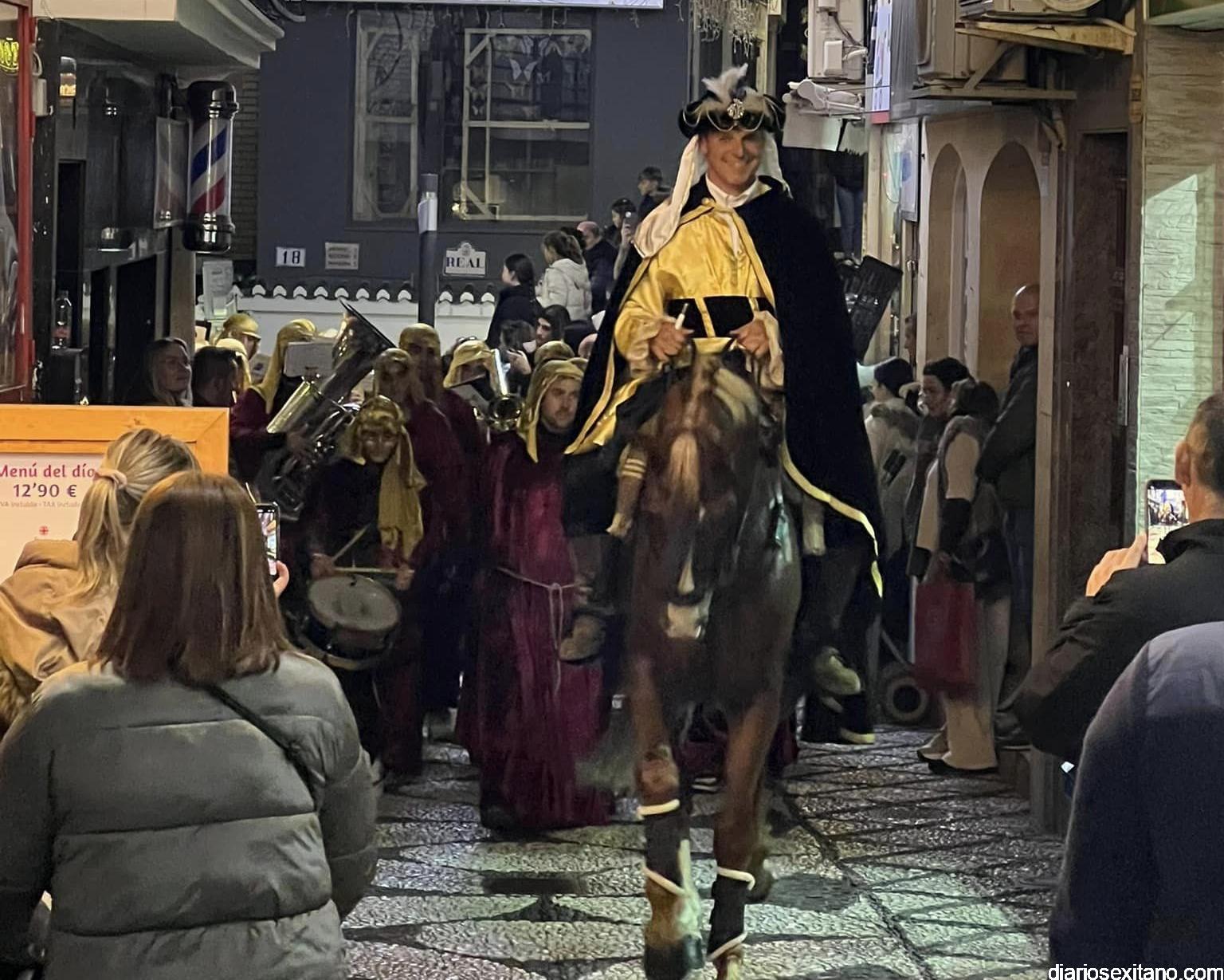El Heraldo Real llegó al corazón de la ciudad, la plaza de la Constitución, donde, a las puertas del Consistorio sexitano, le esperaba el edil de Cultura. Llegó sobre un caballo y acompañado de la Banda Municipal de Música de Almuñécar tras recorrer el centro urbano.