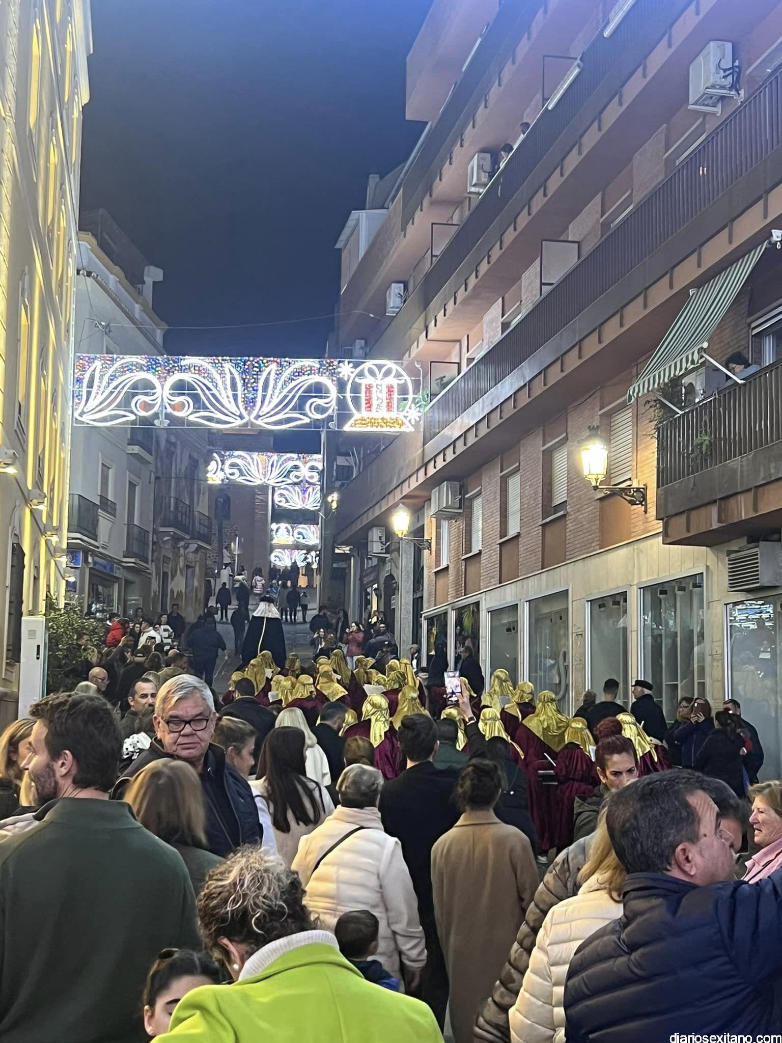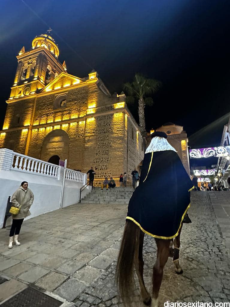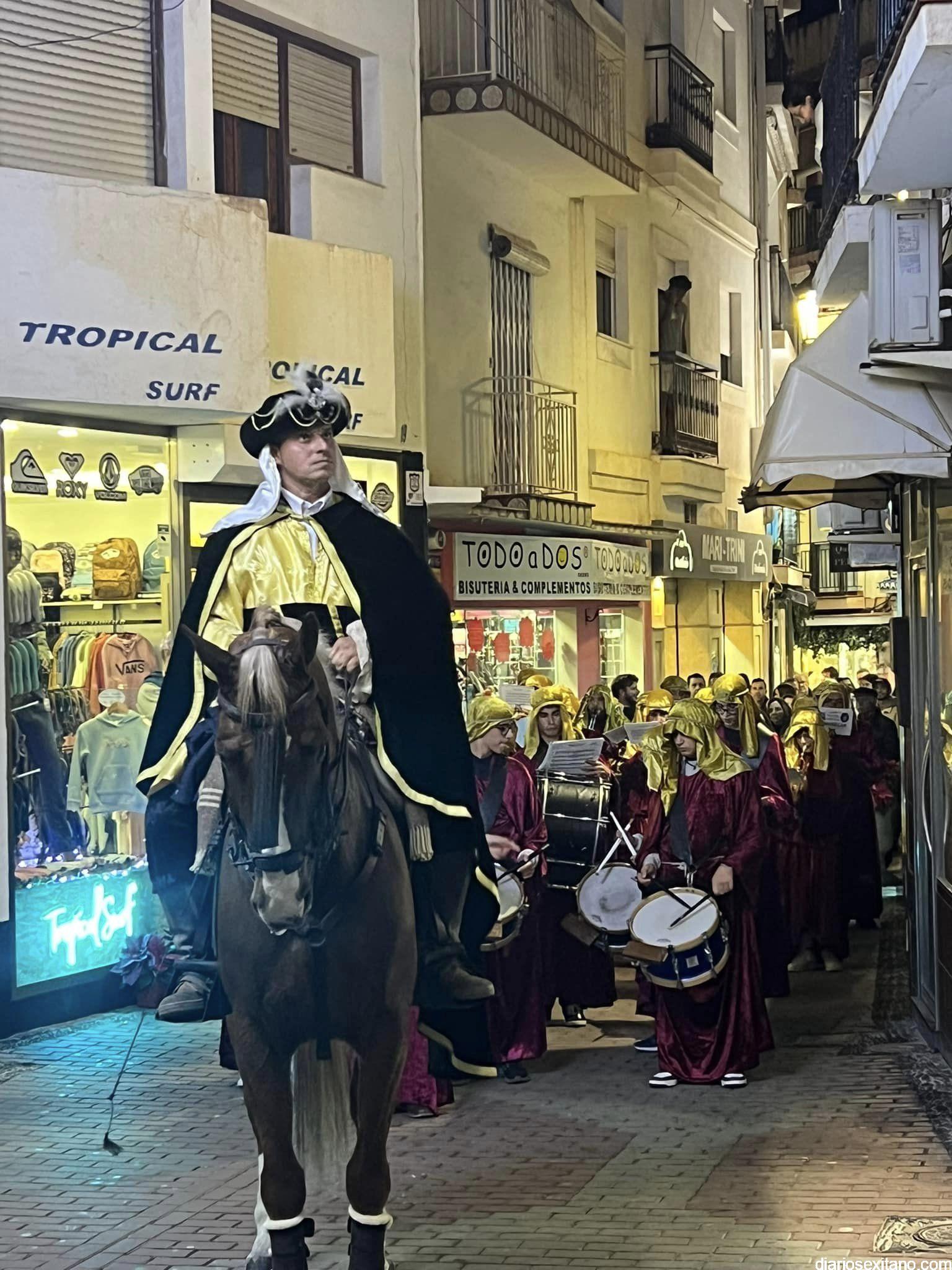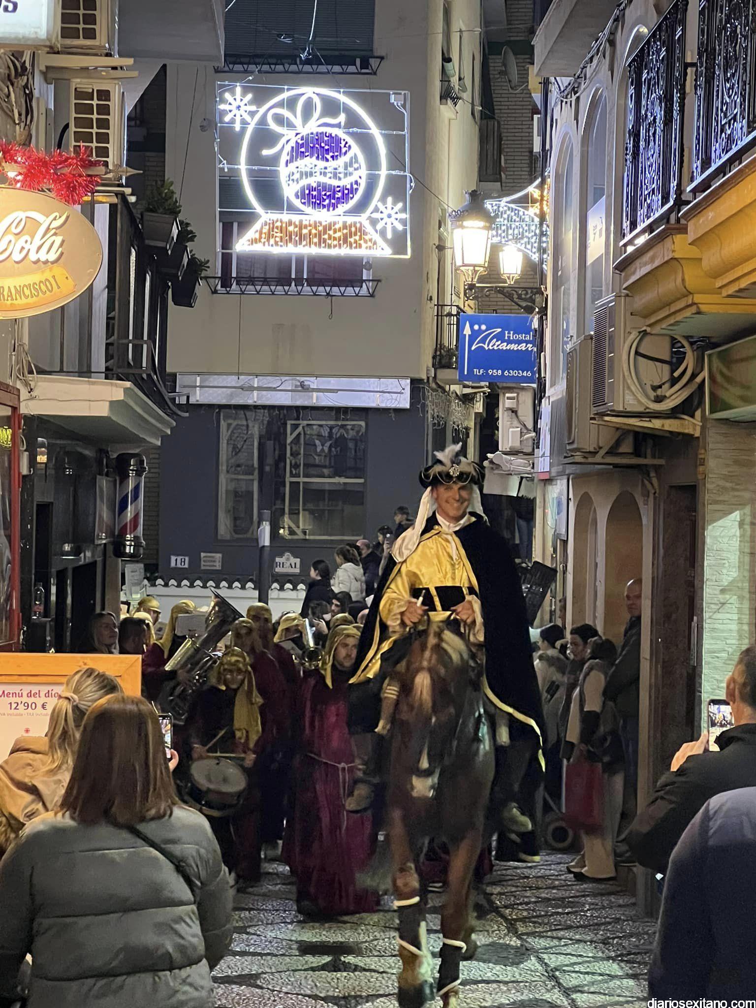 El Heraldo Real llegó al corazón de la ciudad, la plaza de la Constitución, donde, a las puertas del Consistorio sexitano, le esperaba el edil de Cultura. Llegó sobre un caballo y acompañado de la Banda Municipal de Música de Almuñécar tras recorrer el centro urbano.