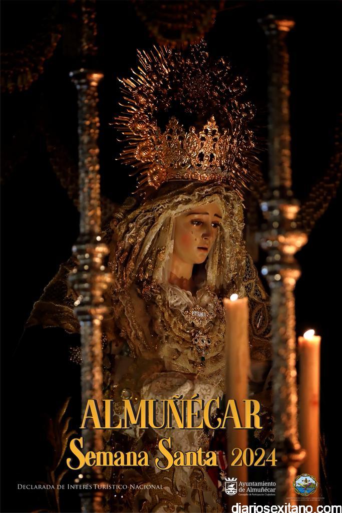 Una instantánea de la Virgen de la Esperanza bajo palio procesionada la tarde noche del Jueves Santa sexitano, protagonista del cartel oficial de la Semana Santa de Almuñécar 2024. La obra, realizada por el fotógrafo local Leonardo Cervilla Rivero autor de otros carteles oficiales de la localidad sexitana, se presentaba en el colofón de clausura de la XII Jornadas Cofradías “Ciudad de Almuñécar”, que ha venido celebrando la Agrupación de Cofradías y Hermandades de Semana Santa sexitana durante tres días en la Casa de la Cultura.