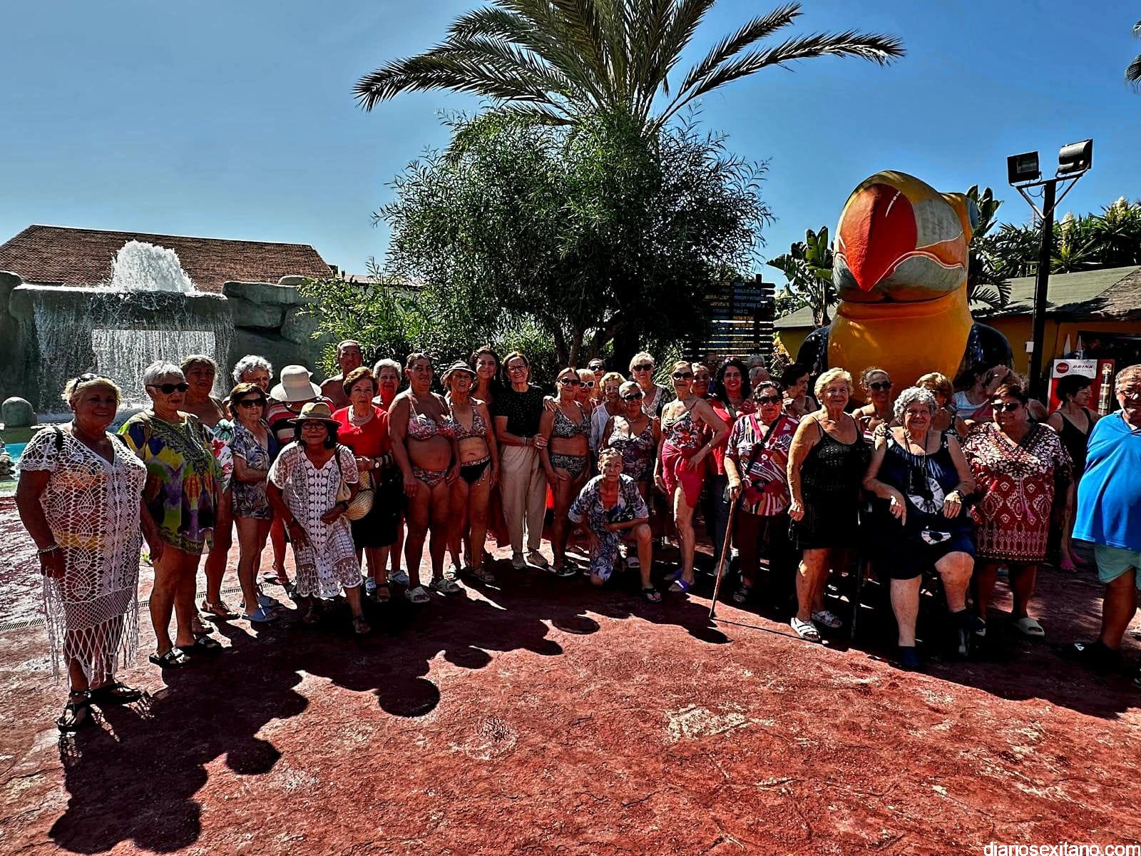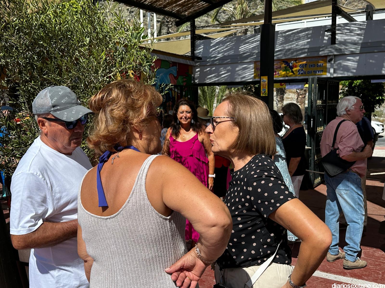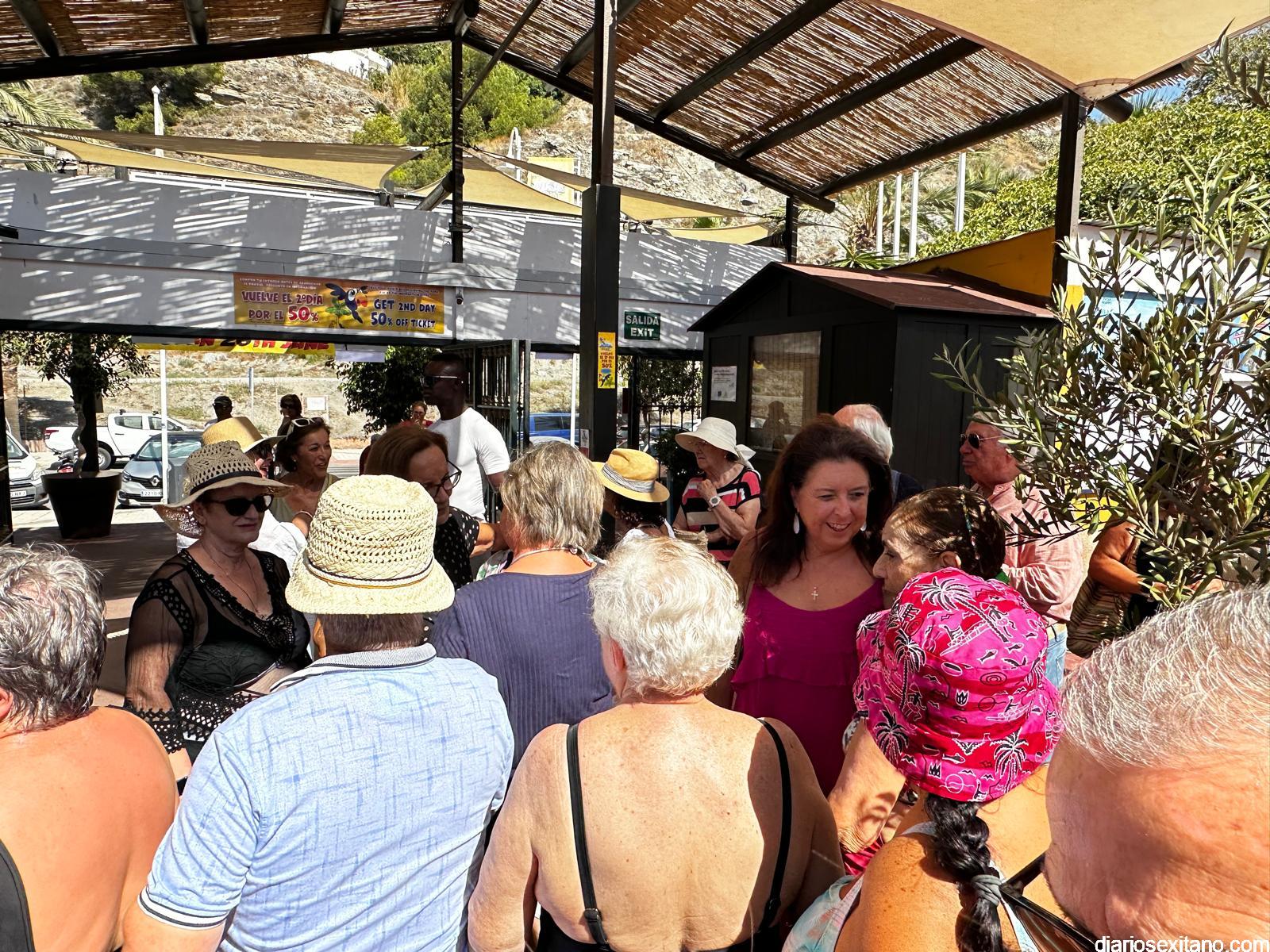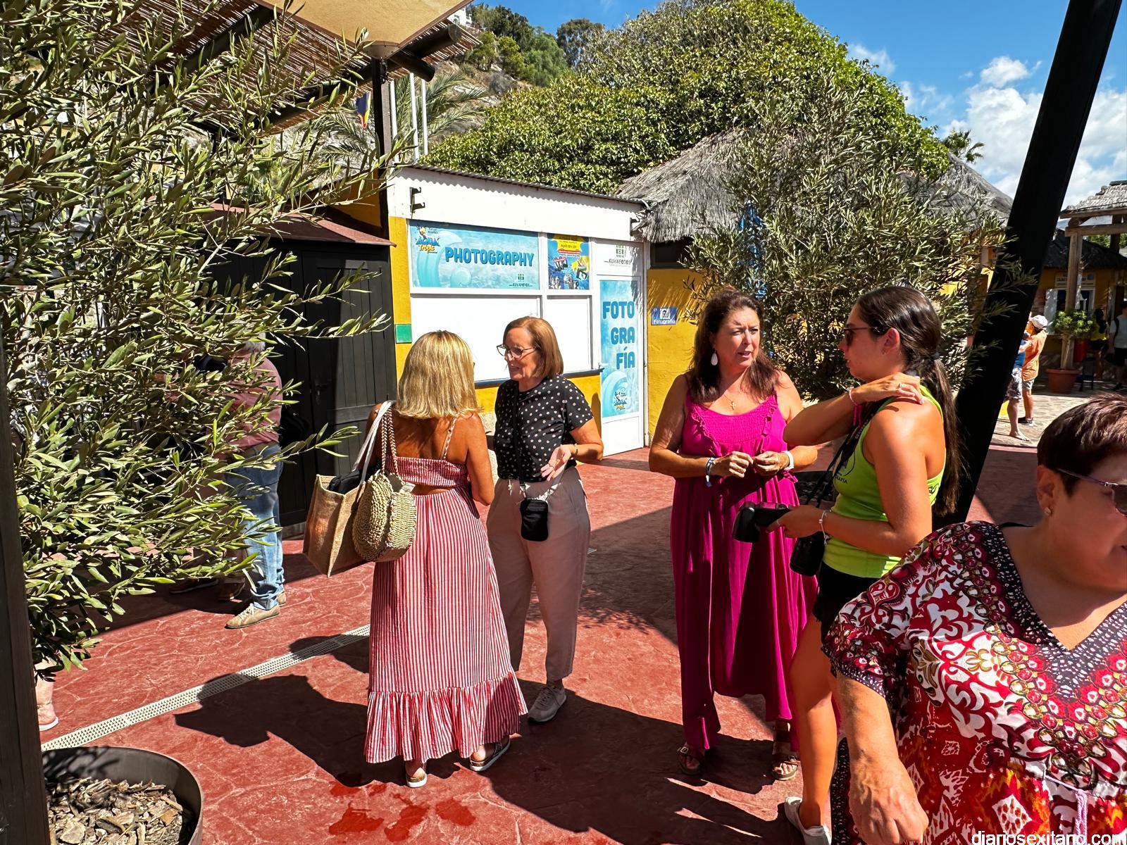 La concejal de Servicios Sociales del Ayuntamiento de Almuñécar, María del Carmen Reinoso, y la delegada provincial de Inclusión Social de la Junta de Andalucía en Granada, Matilde Ortiz, han recibido a más de 800 personas mayores de 23 Centros de Participación Activa de diferentes municipios de la provincia de Granada que han llegado a Almuñécar para pasar el día en el parque acuático Aquatropic.