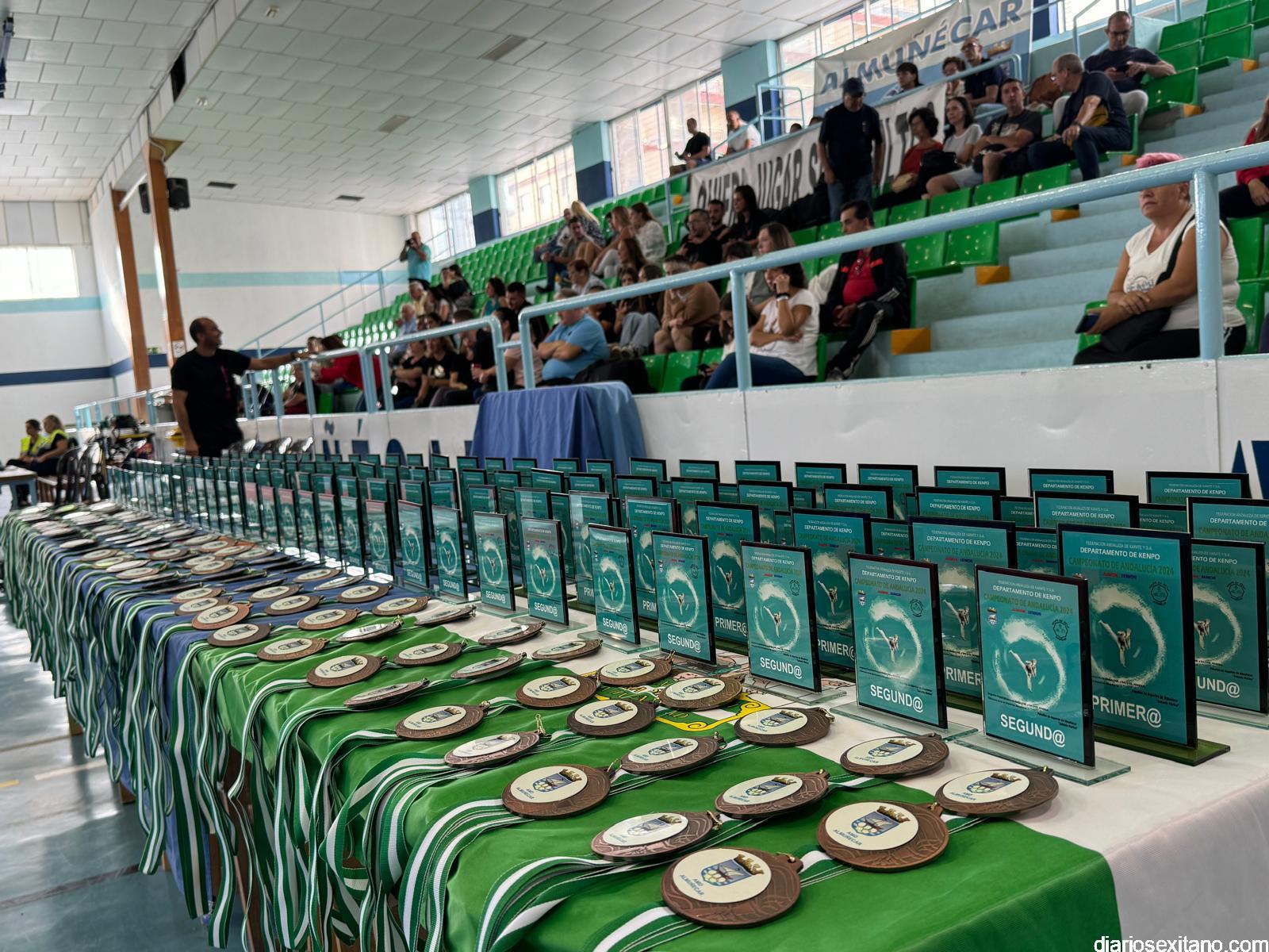 Lluvia de medallas para Almuñécar en el Campeonato de Andalucía de Kenpo 2024. Una veintena de sexitanos conquistaron 50 metales en este evento que reunió a 150 participantes procedentes de una veintena de clubes de diferentes provincias andaluzas de las categorías junior y senior en el pabellón municipal de deportes sexitano “Antonio Marina”.