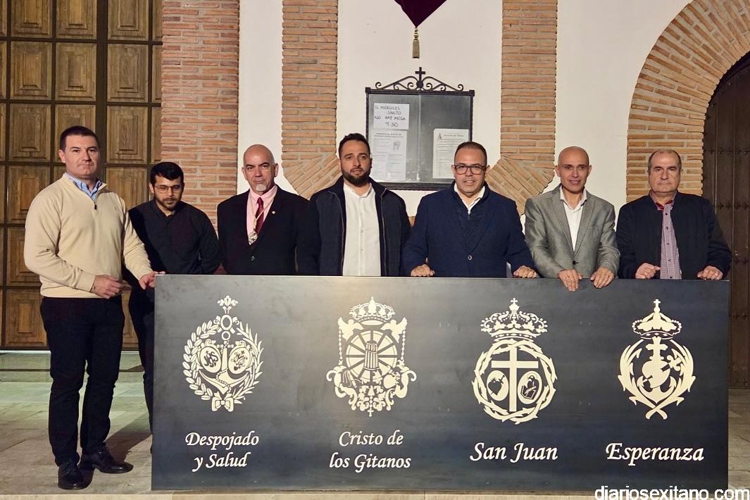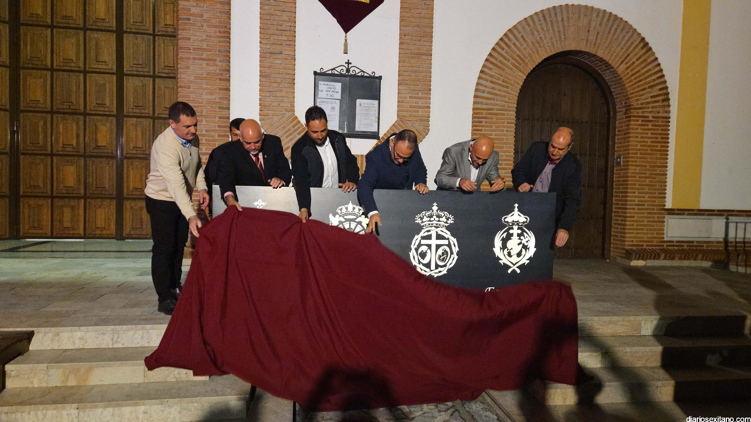 También se homenajeó a las cuatro cofradías de Semana Santa que tienen su sede en este templo:. San Juan, Esperanza, Despojado y Salud y Cristo de los Gitanos descubriendo los escudos de éstas.