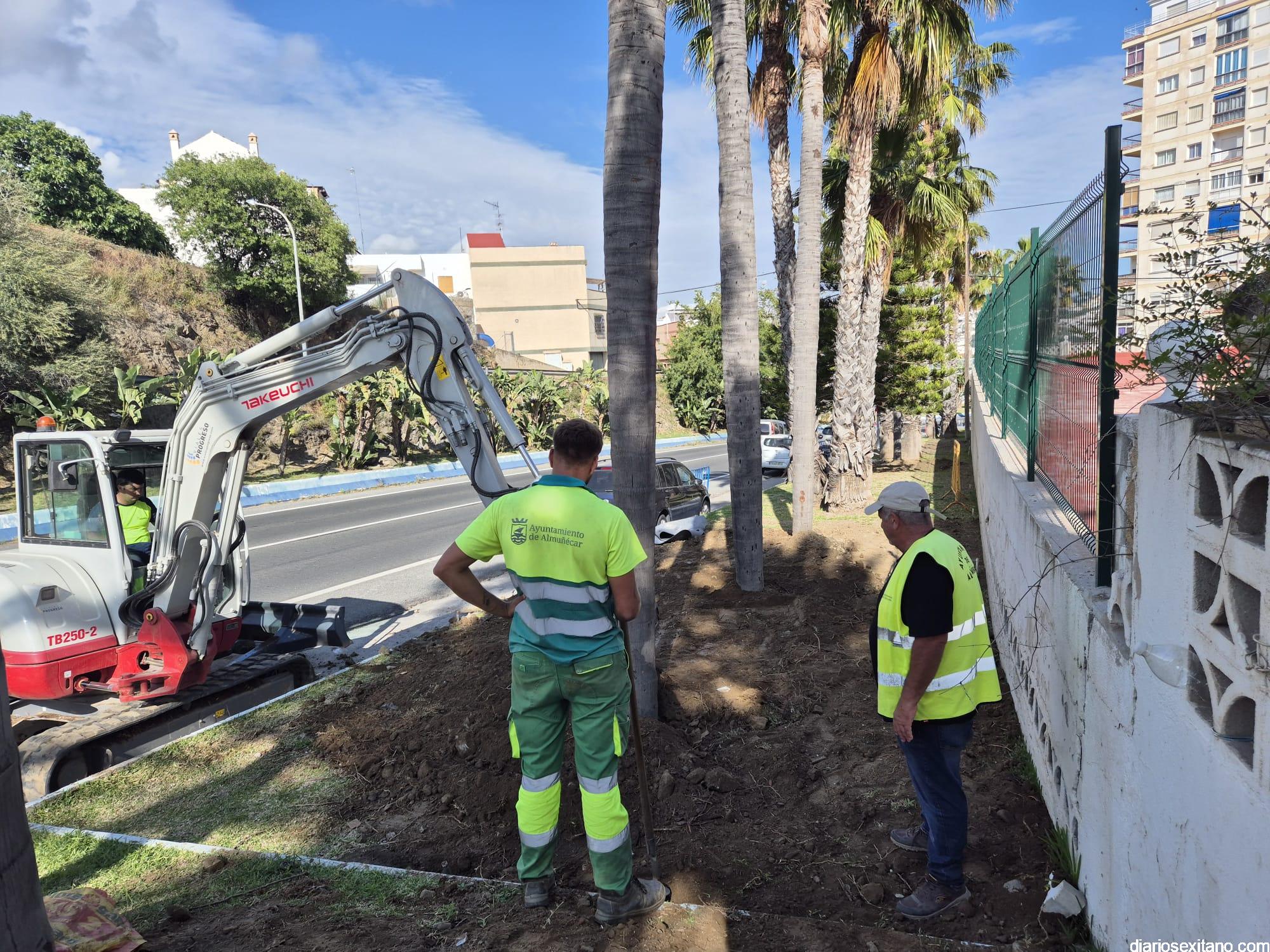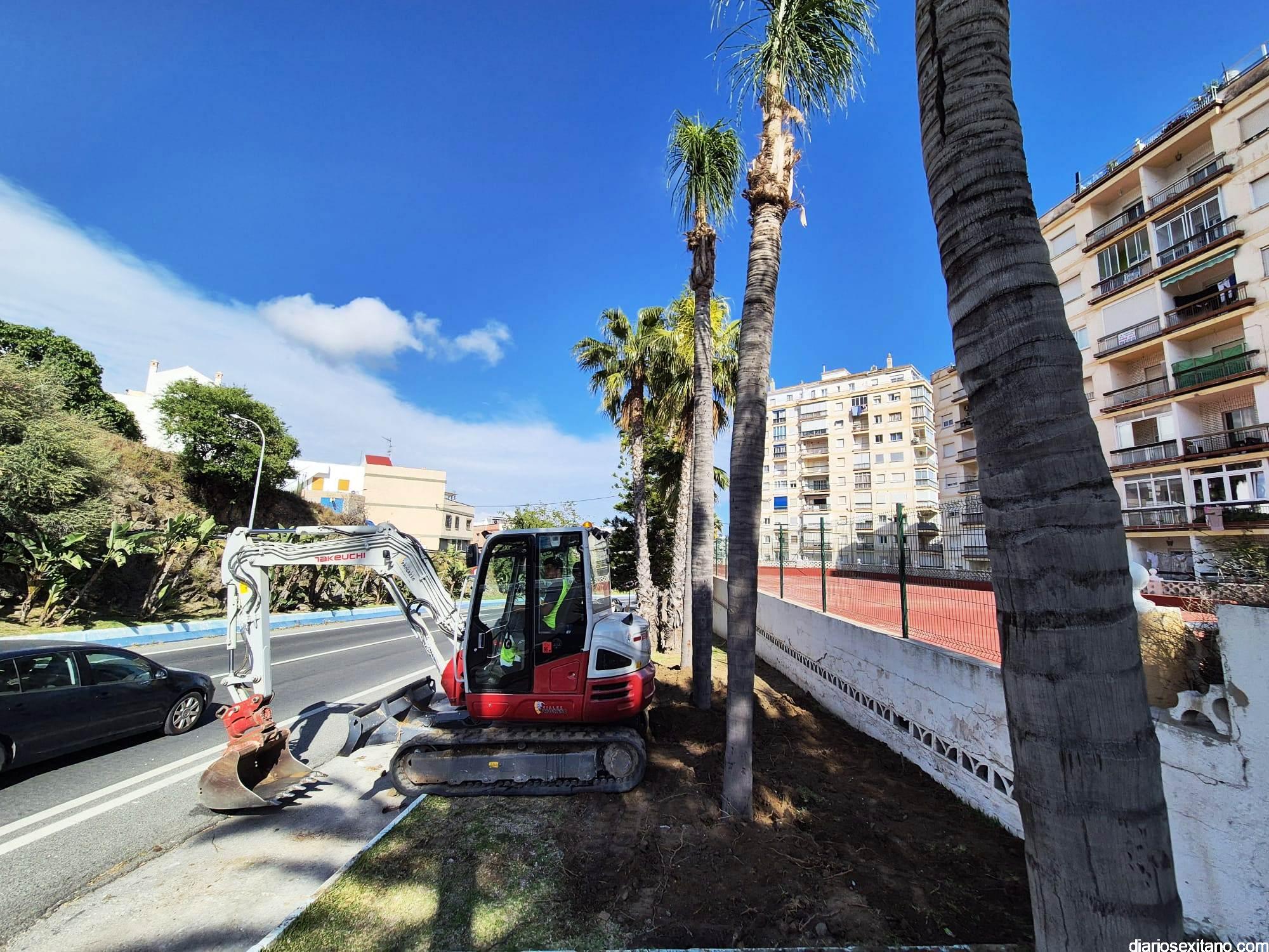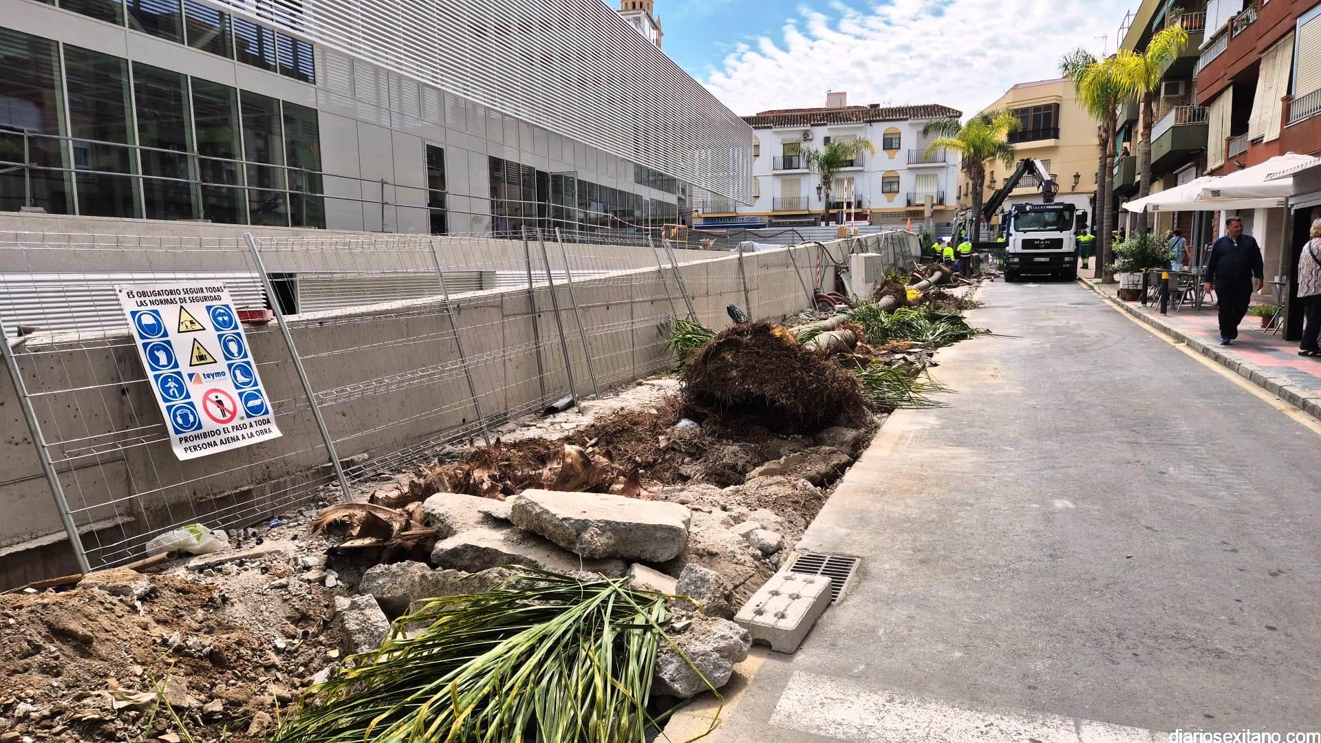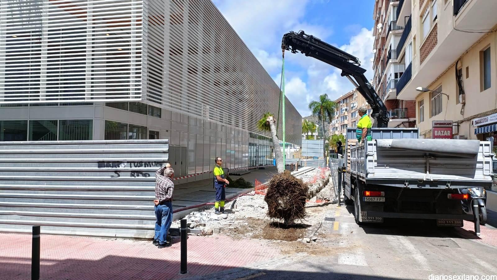 Ante las obras de urbanización exterior del nuevo edificio del Mercado Municipal de Almuñécar, este viernes concluyen los trabajos de retirada y trasplante de las palmeras que rodeaban el Mercado, por las calles Sánchez Chaves y callejón del Virgo.