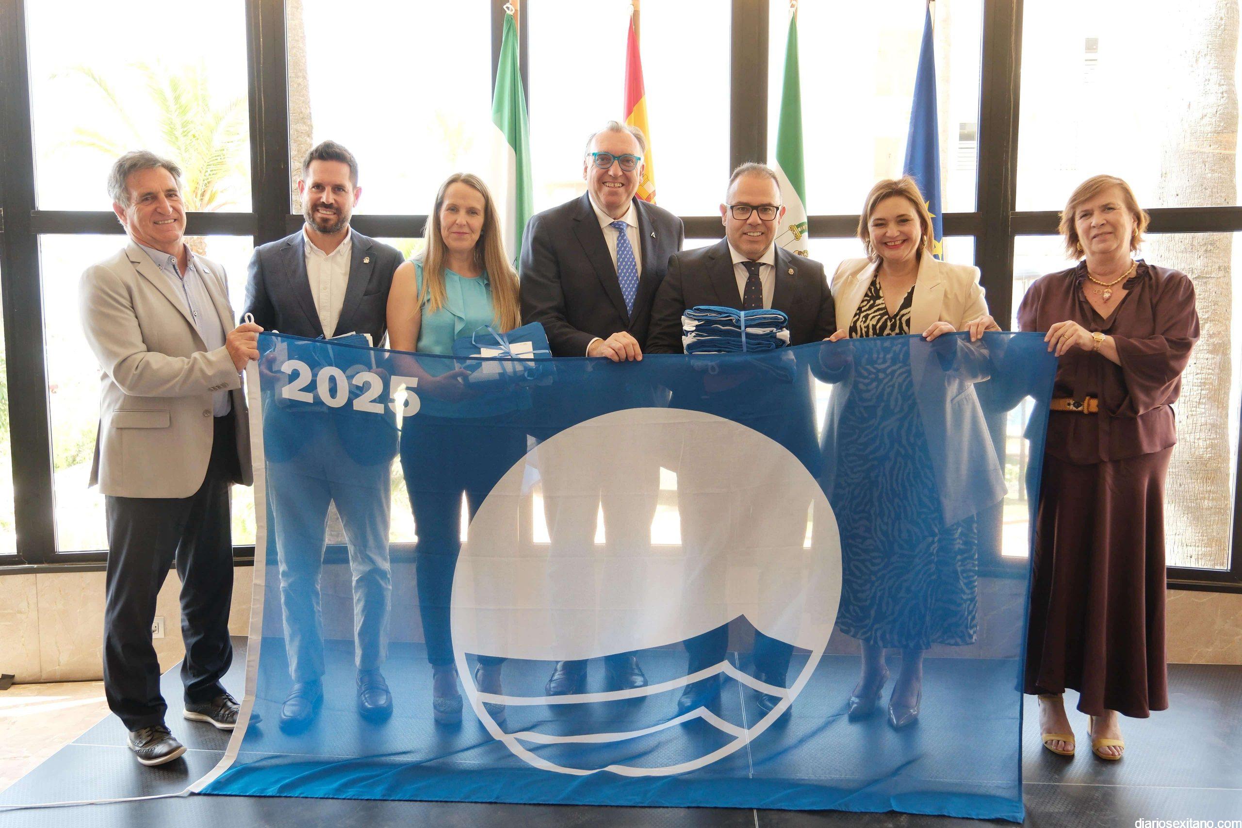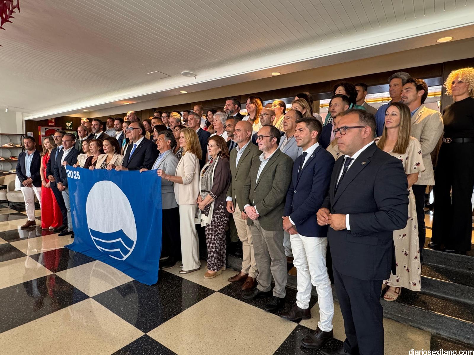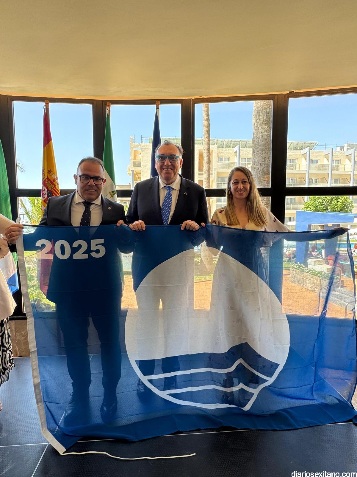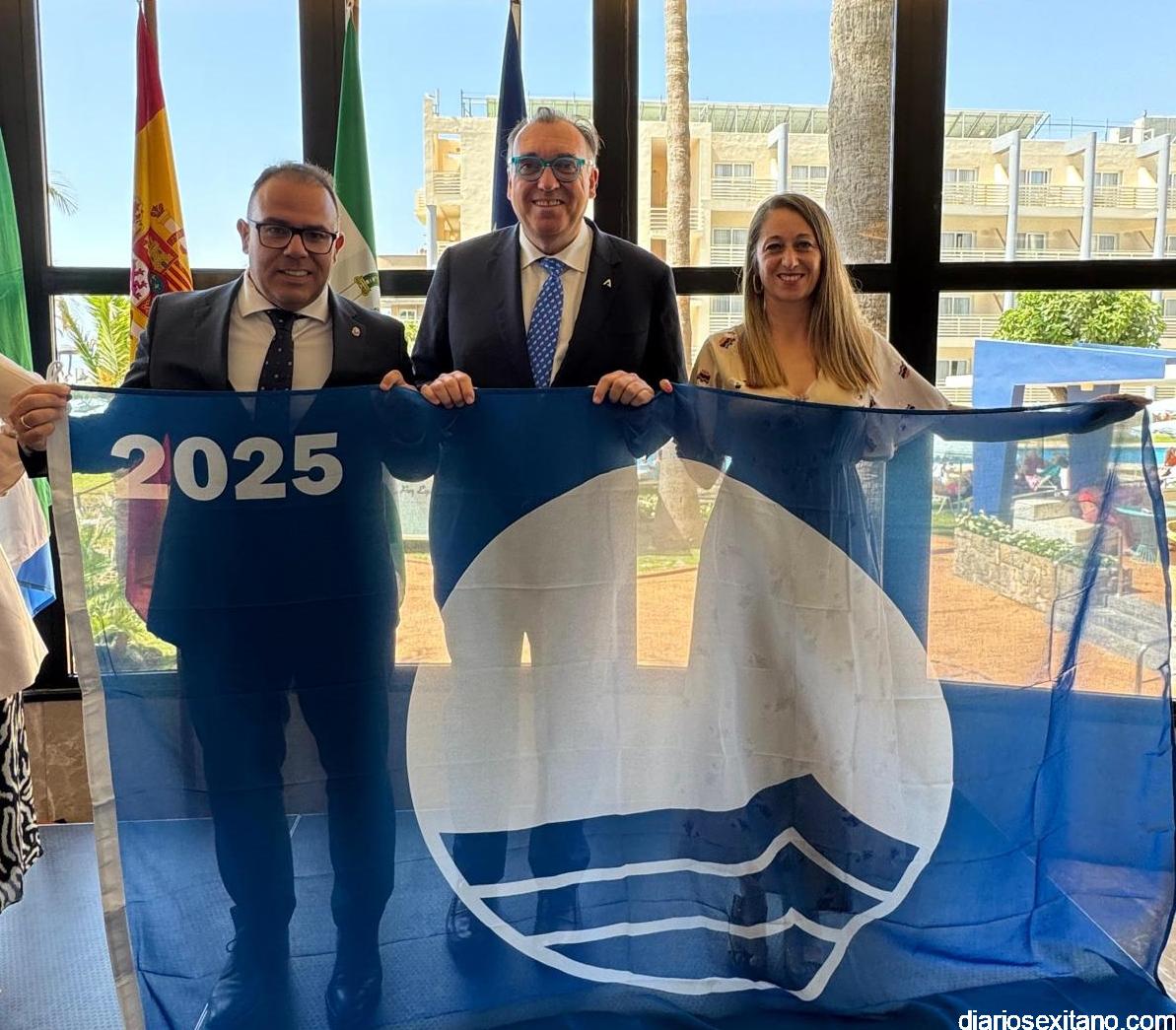 El alcalde de Almuñécar, Juan José Ruiz Joya, acompañado por la concejal de Playas, Lucía González, ha recibido este viernes en Torremolinos de manos del consejero de Turismo de la Junta de Andalucía, Arturo Bernal, las cinco banderas azules que lucirán este verano las playas de La Herradura, Marina del Este, San Cristóbal, Puerta del Mar y Velilla este verano 2025 y que acreditan la excelencia de las mismas. A estos galardones, se suma otra Bandera Azul para el puerto deportivo Marina del Este por la calidad en la gestión. .