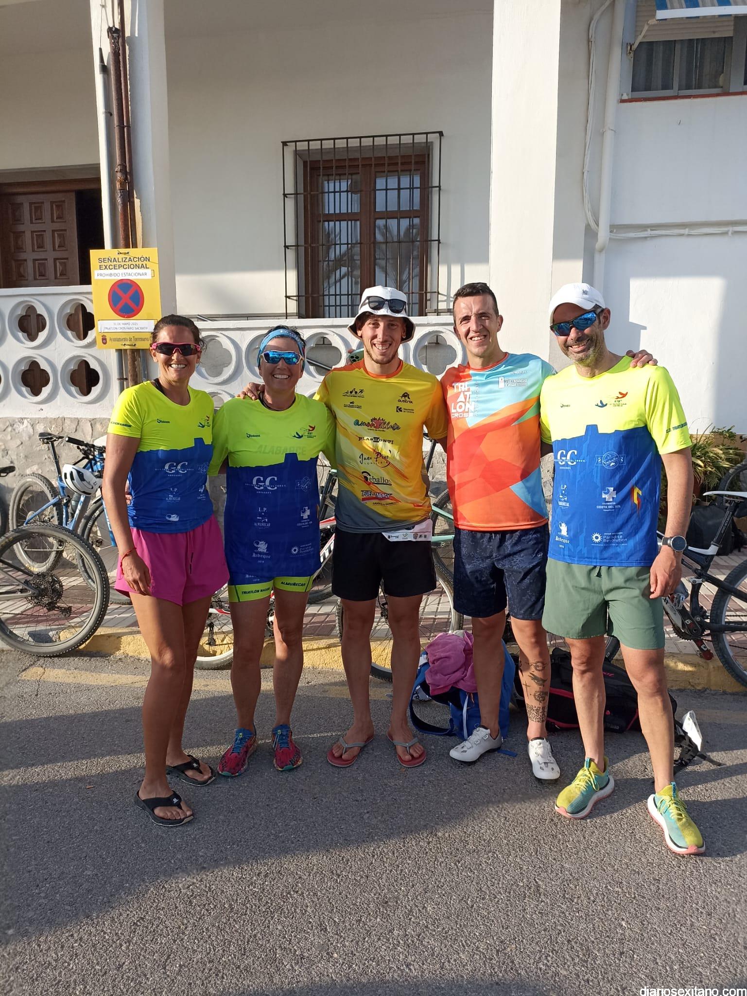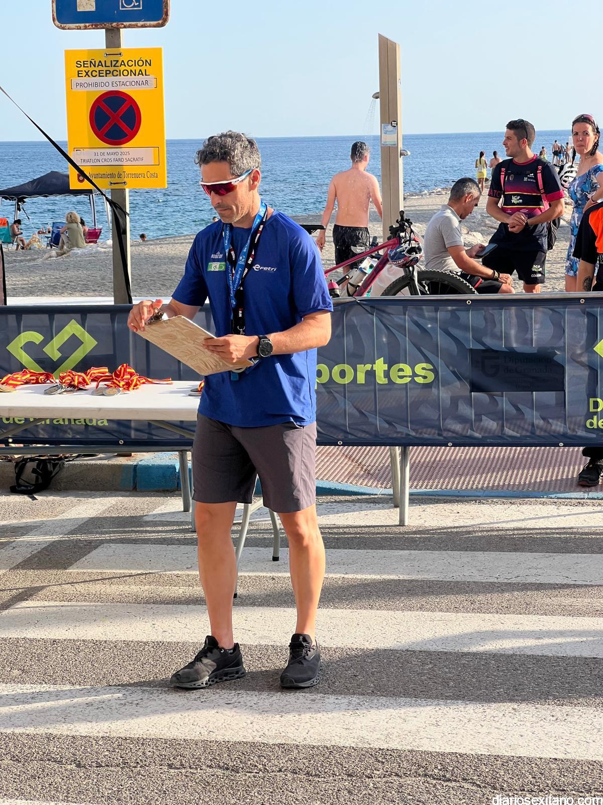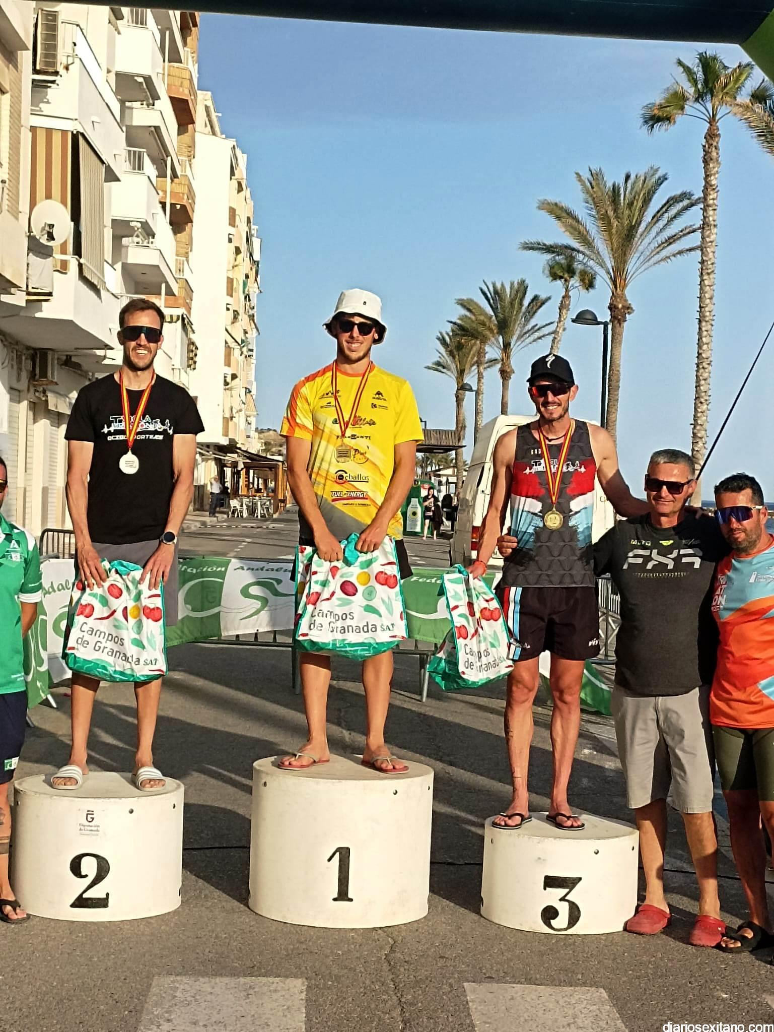 Bajo un escenario espectacular y una prueba relativamente exigente por el calor, la delegación almuñequera brilló con luz propia en el estreno del Triatlón Cross de Torrenueva Costa, que combinó 1000 m de natación, 20 km de MTB y 6 km de carrera a pie atravesando la icónica pasarela local.