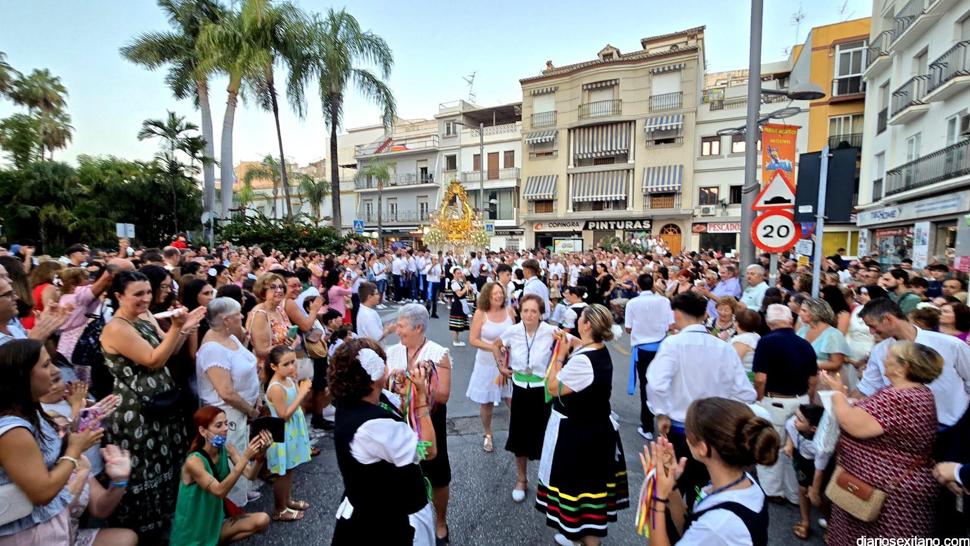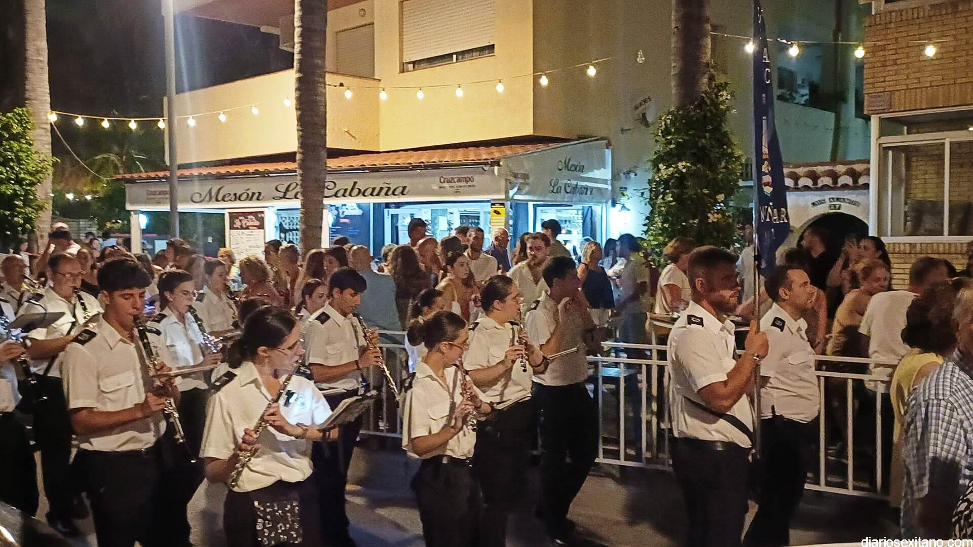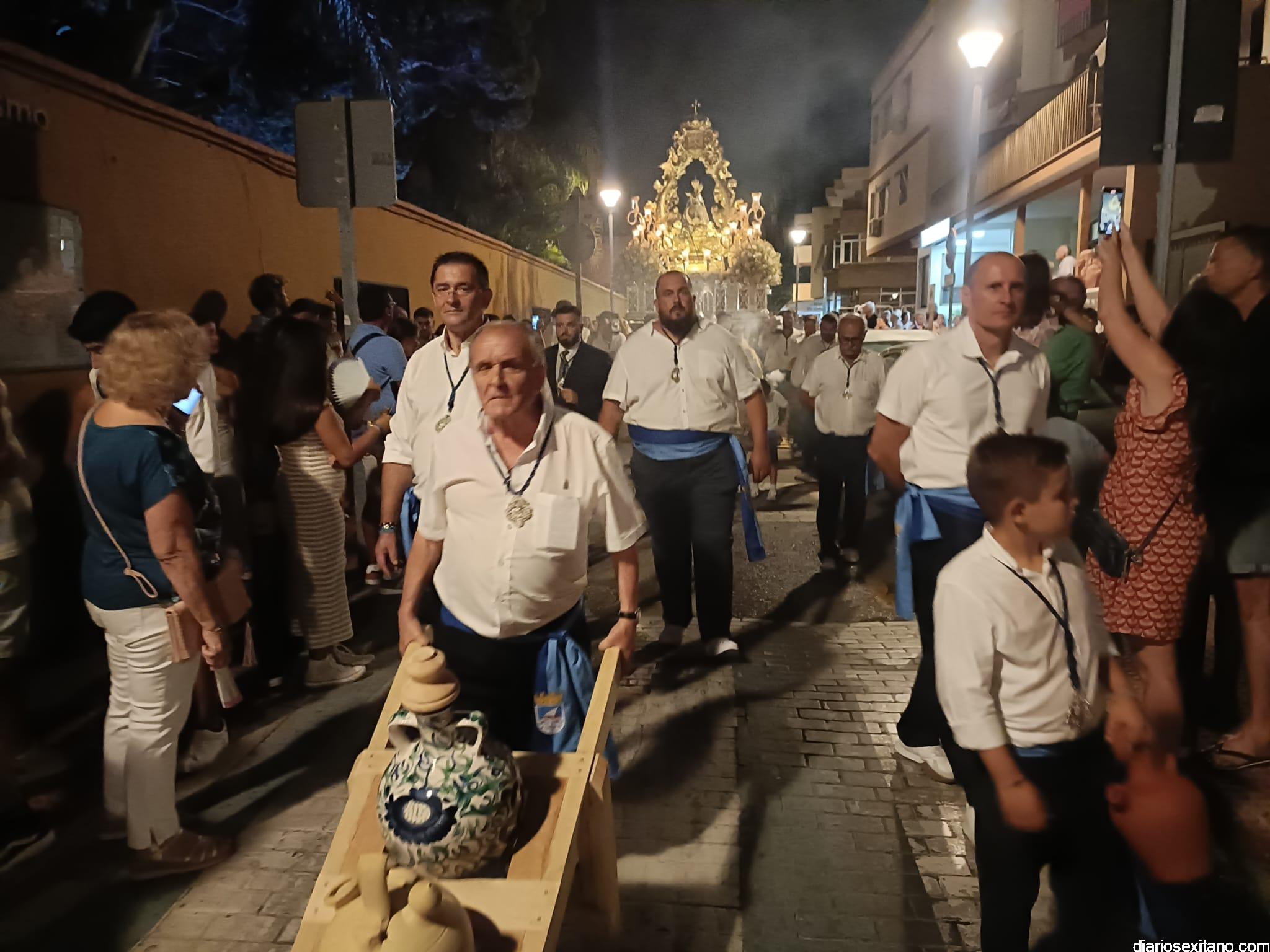 La procesión partió al caer la tarde desde el templo parroquial de la Encarnación rumbo a la playa de San Cristóbal, con todo el cortejo oficial organizado por la Hermandad encabezado por el párroco, Juan Antonio Arcos, y la representación municipal con el alcalde, Juan José Ruz Joya, al frente.
