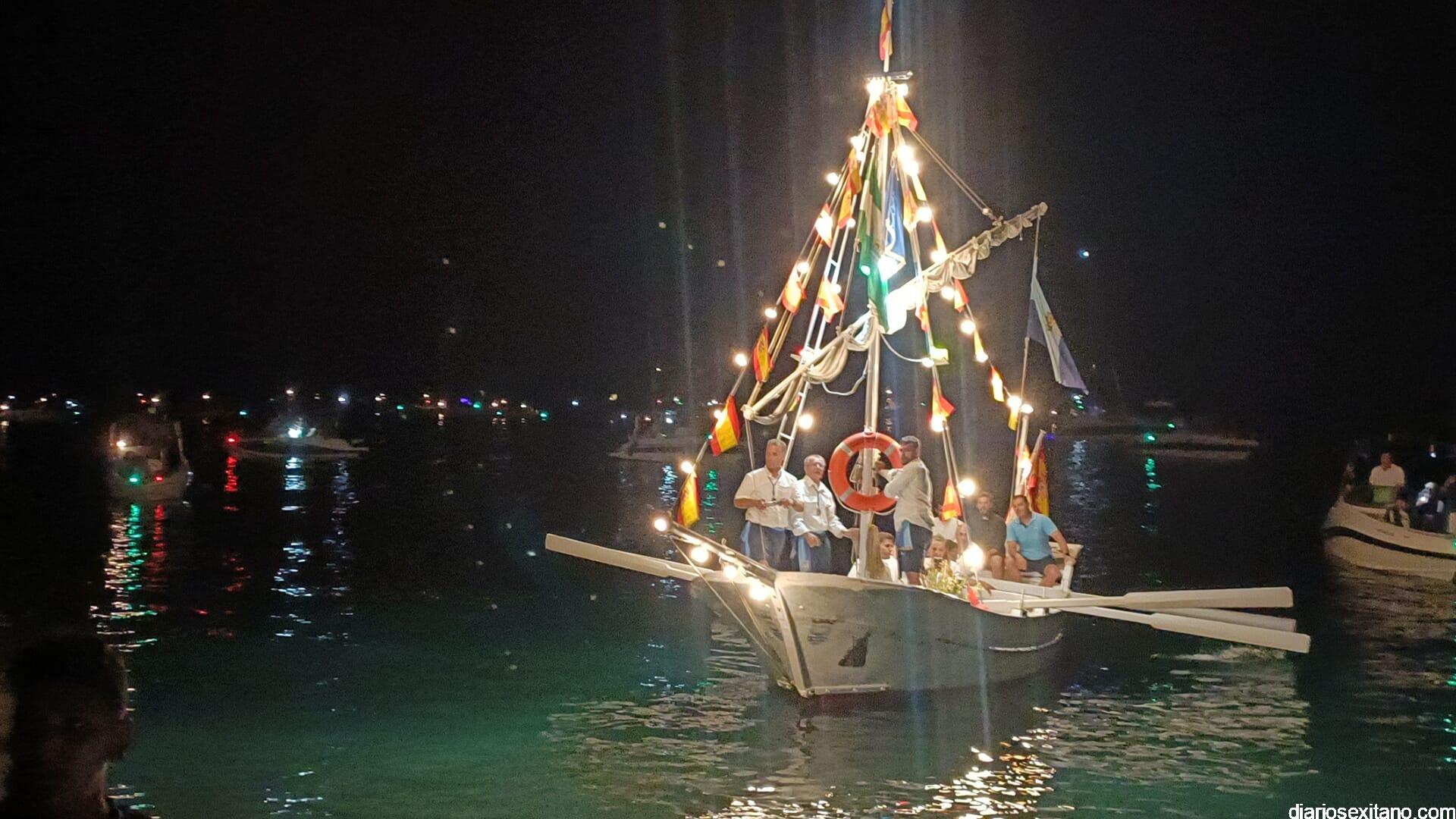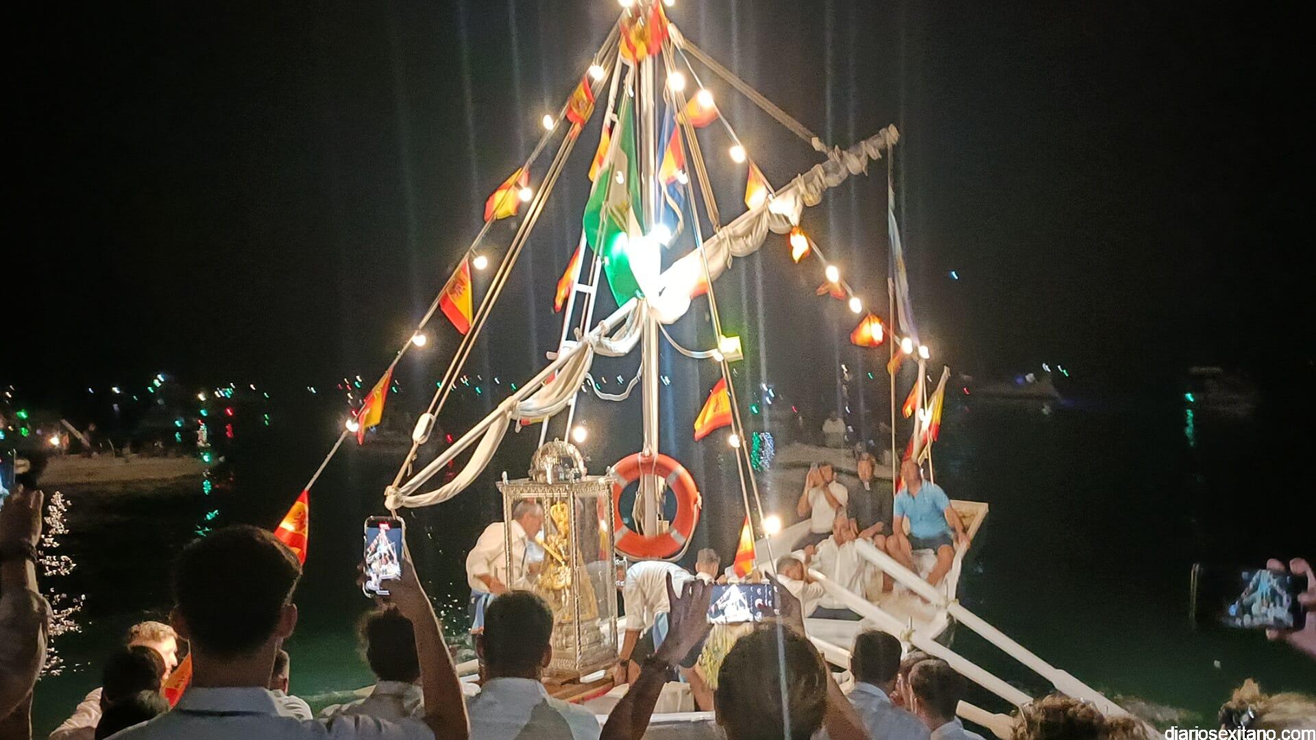 En el mar, decenas de embarcaciones aguardaban la llegada de la Virgen, para acompañarla por el recorrido hasta la playa Puerta del Mar. El patrón del barco era Javier Cabrera López y los remeros: Alberto Bueno Mochón, Javi Cabrera Jiménez, José María Pendón Jiménez y Damián Cabrera Jiménez.