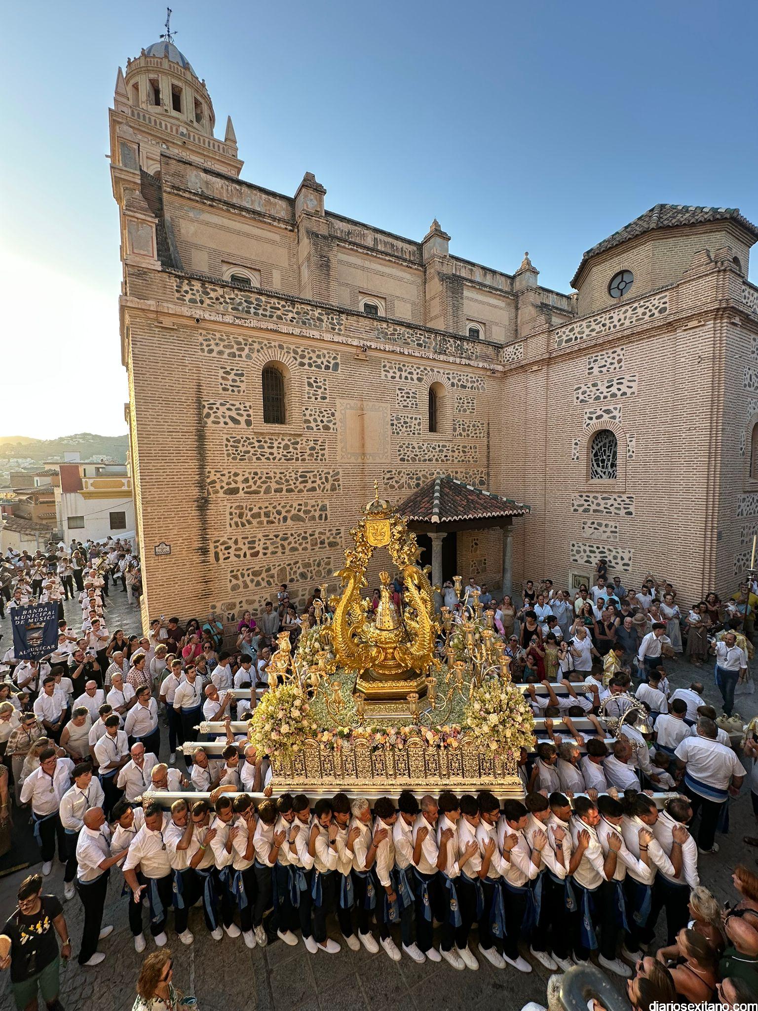 Nada más salir a la calle, en la Puerta de Granada, la Patrona recibió, además de la bienvenida con los sones de la Banda Municipal de Música de Almuñécar con la dirección de David Pino, la primera de otras muchas petaladas de flores por parte de los vecinos. Era también una procesión histórica al conmemorarse el 425 aniversario del templo parroquial de la Encarnación.