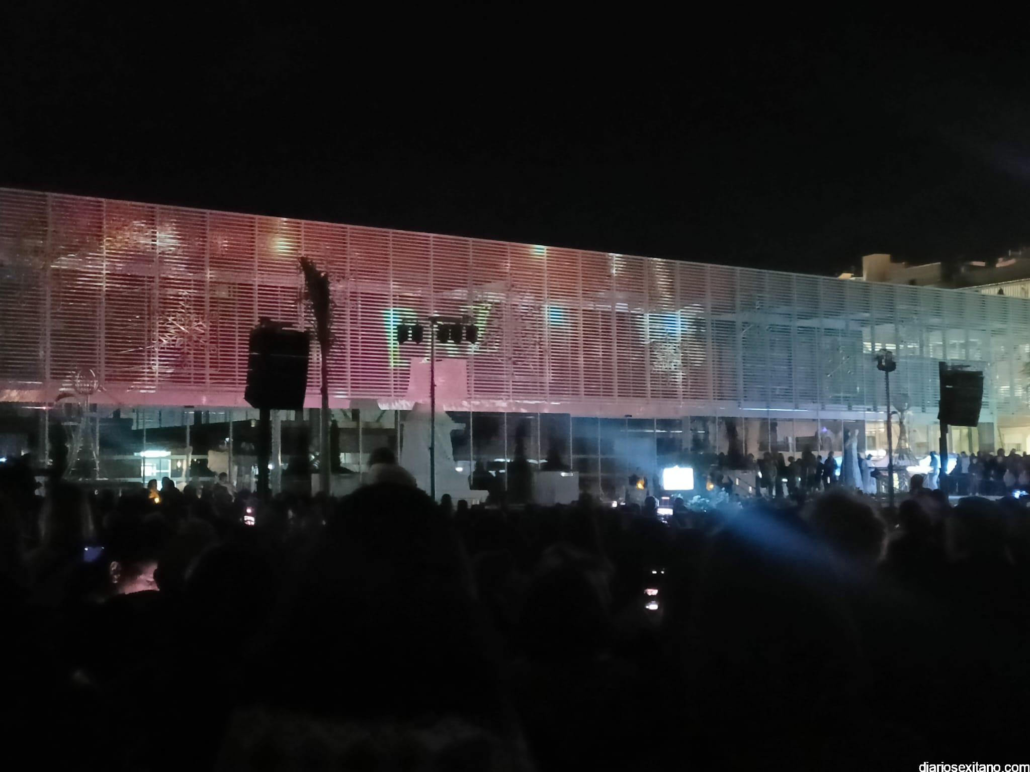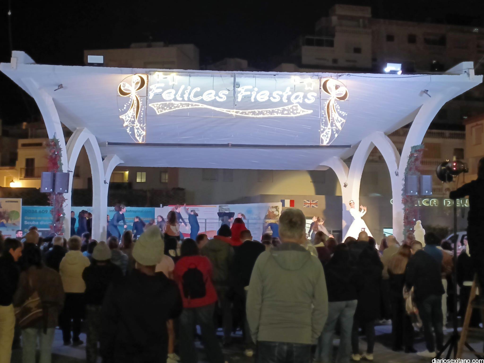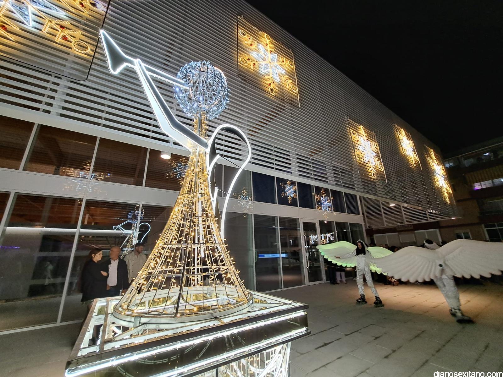 El cortejo lo abrió la “Estrella de la Ilusión”, este año representado por la profesora sexitana de danza y reconocida creadora de contenido, Judith Contreras, acompañada por un pasacalles organizado por el Conservatorio Profesional de Danza “Solange Janssen”, que llegó al Mercado donde se proyectó un video mapping que mostraba diferentes estampas y escenarios musicales, alegóricos a la Navidad.