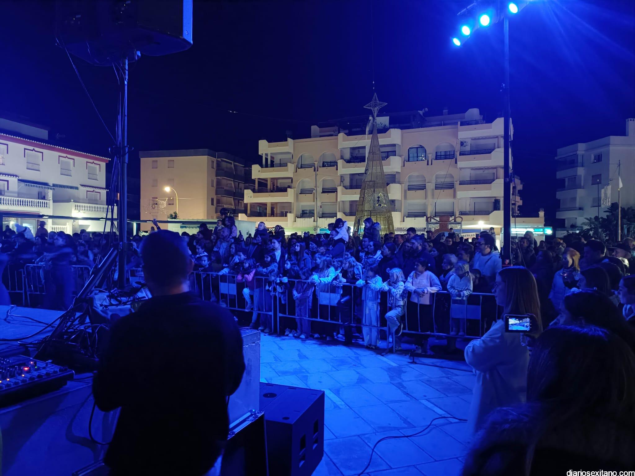 La Estrella de la Ilusión abrió el espectacular cortejo que dio paso al multitudinario acto del encendido navideño en las puertas del nuevo Mercado de Almuñécar y en la plaza de la Independencia de La Herradura