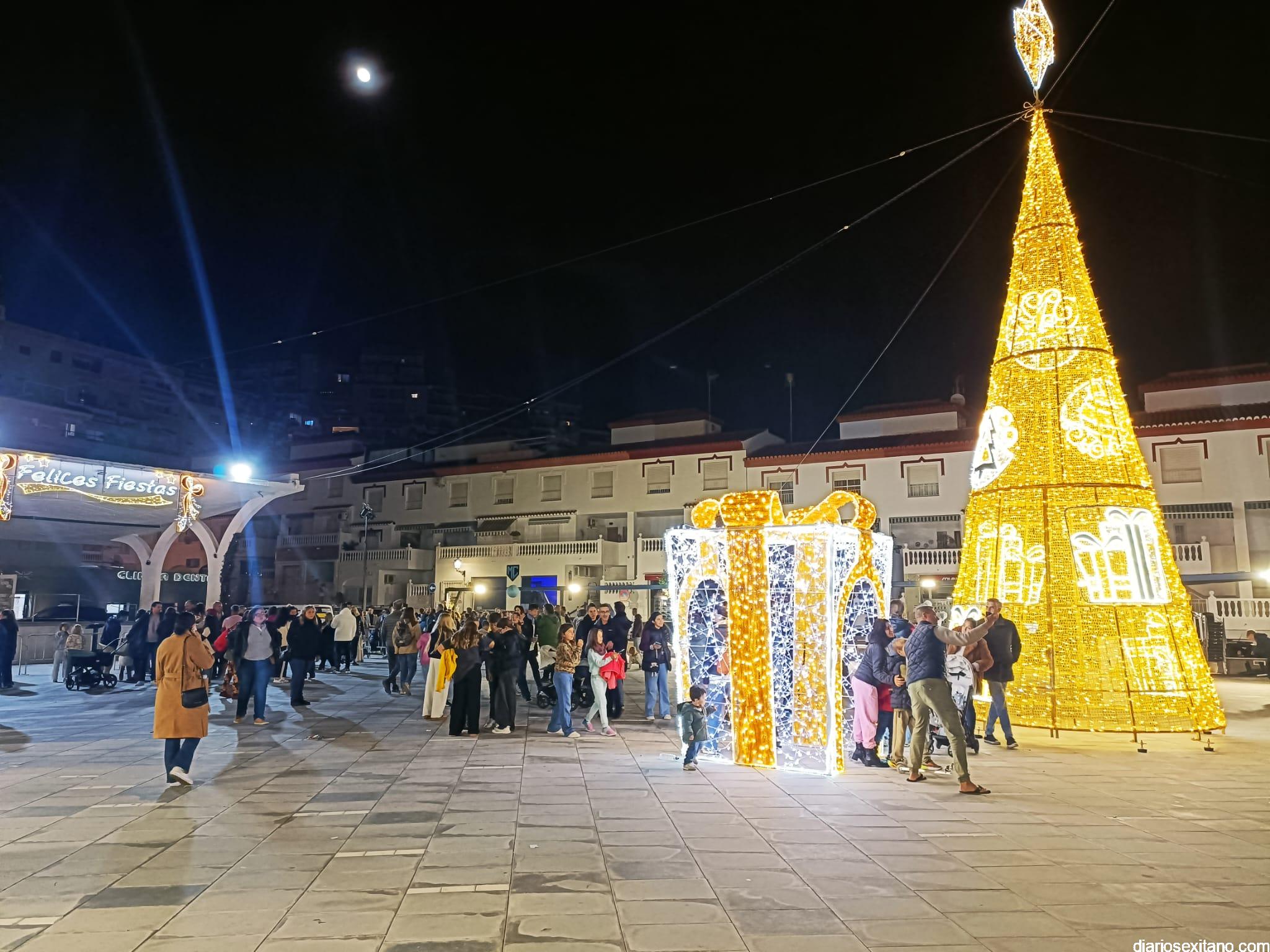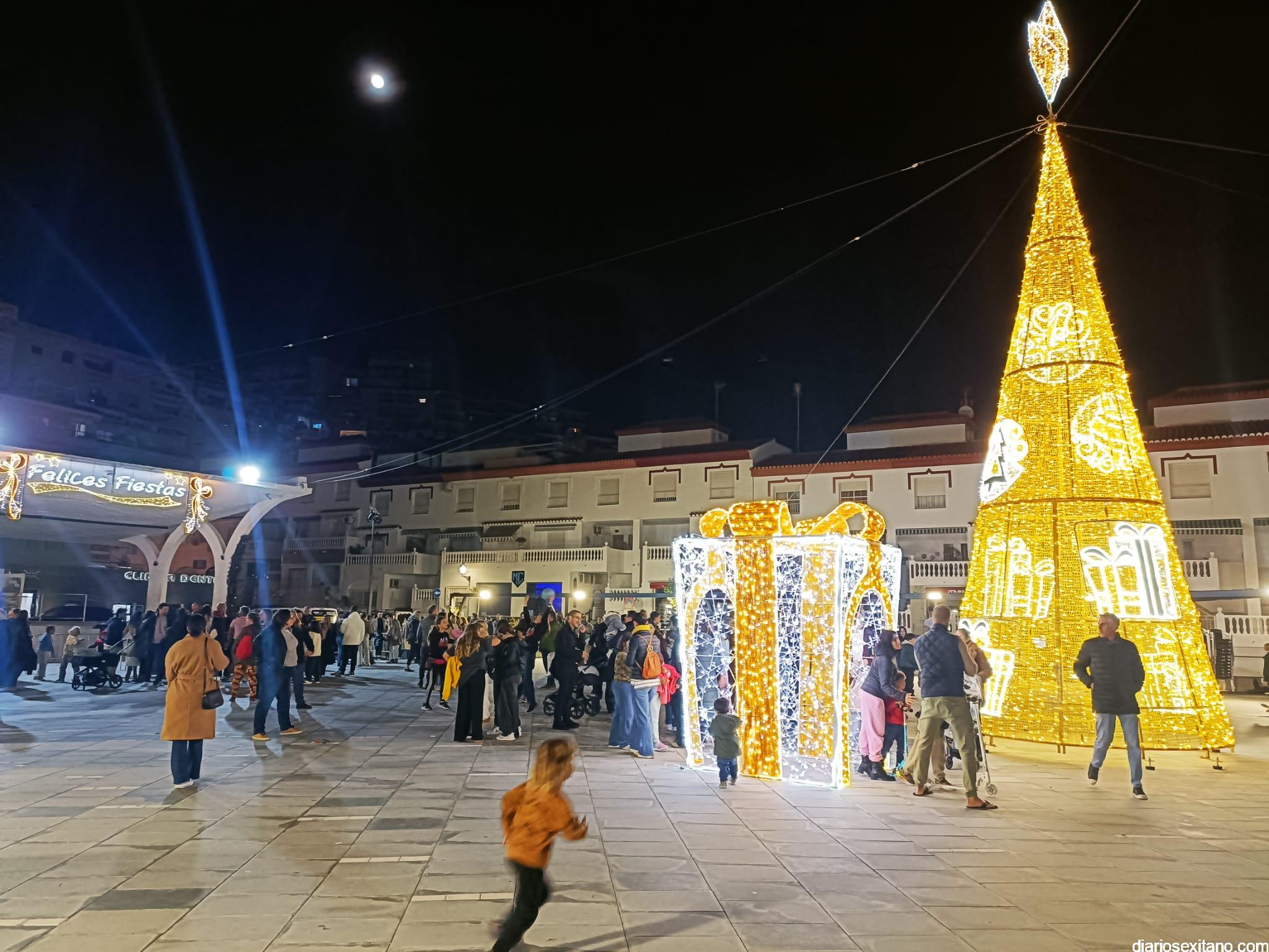 Gracias a la Cofradía de la Piedad, en el entorno olía a chocolate caliente, buñuelos, pestiños y otros dulces típicos de esta época, dando mayor ambiente a los momentos previos a la iluminación del gran árbol de luz y color que se encendió una vez que dieron al pulsador el alcalde de Almuñécar, Juan José Ruiz Joya, acompañando a la Estrella de la Ilusión.