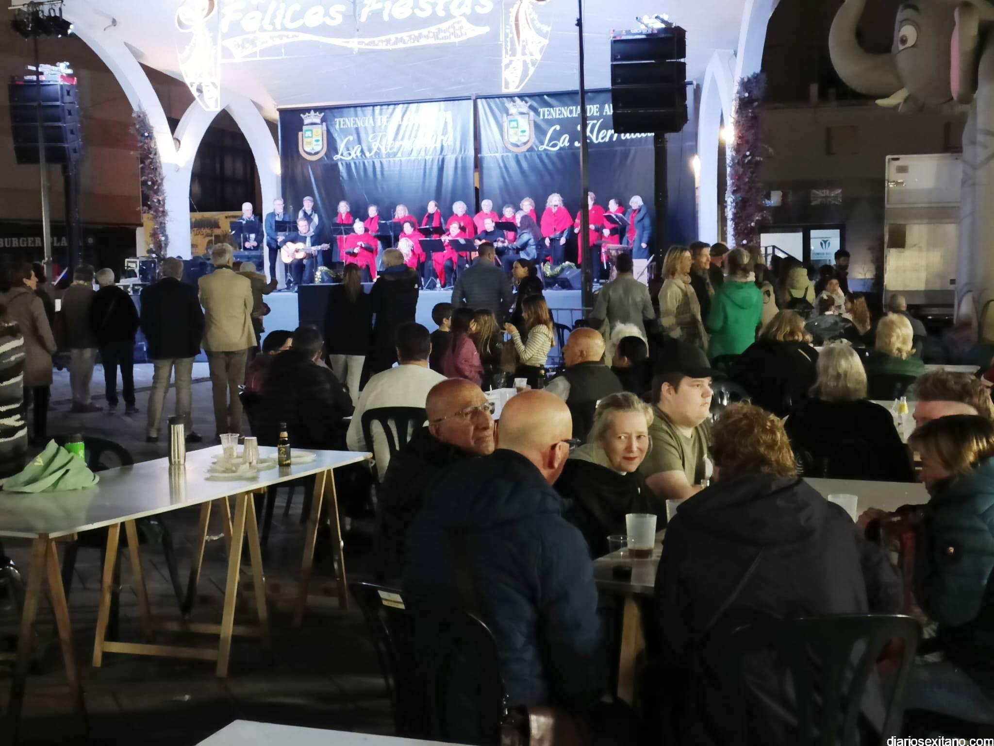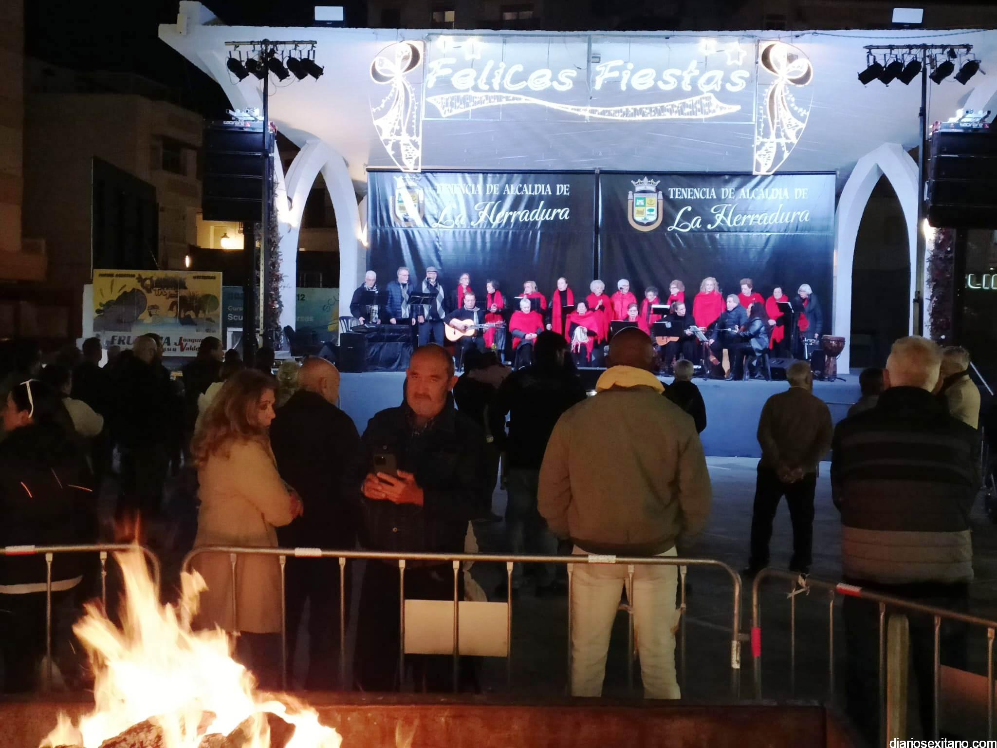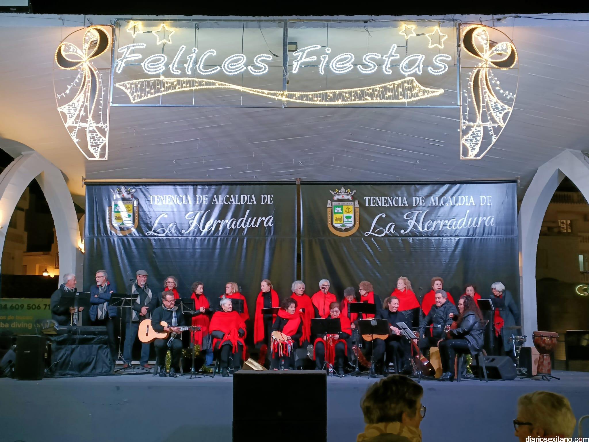 Precisamente, el atardecer coincidió con los cánticos de villancicos que interpretó el Coro “Cosas Nuestras” desde el escenario de la plaza herradureña.