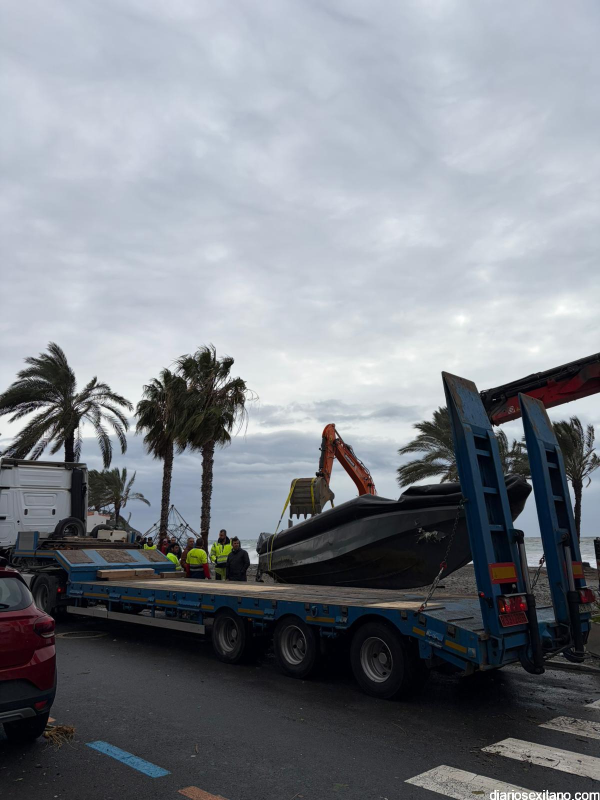 Sin embargo, buena parte de la mañana las fuerzas de seguridad, Policía Local y Guardia Civil de Almuñécar estuvieron ocupados con la “visita” a la bahía de La Herradura de varias narcolanchas que intentaban protegerse del fuerte temporal de vendaval como hacía décadas no se recordaba. Una de las citadas embarcaciones, dotada con cuatro motores fueraborda de gran potencia, por causas que se investigan, quedó varada en la playa, cerca del chiringuito “Bambú”, cargada de decenas de bidones de gasolina. Recuperado los bidones de gasolina, algunos de ellos esparcidos por la orilla, se solicitó una potente máquina retro y un camión remolque para retirar y transportar la narcolancha fuera de la playa.