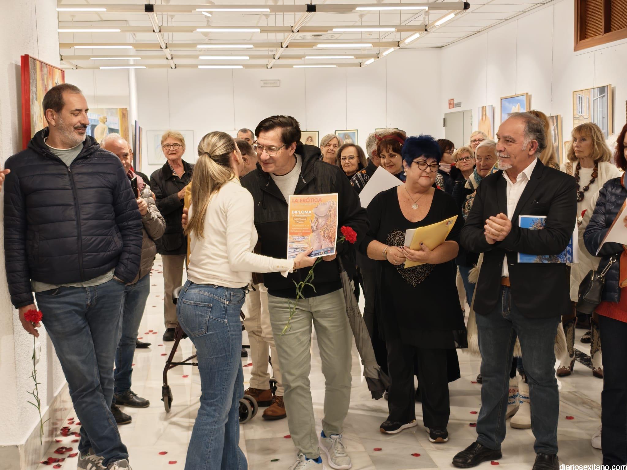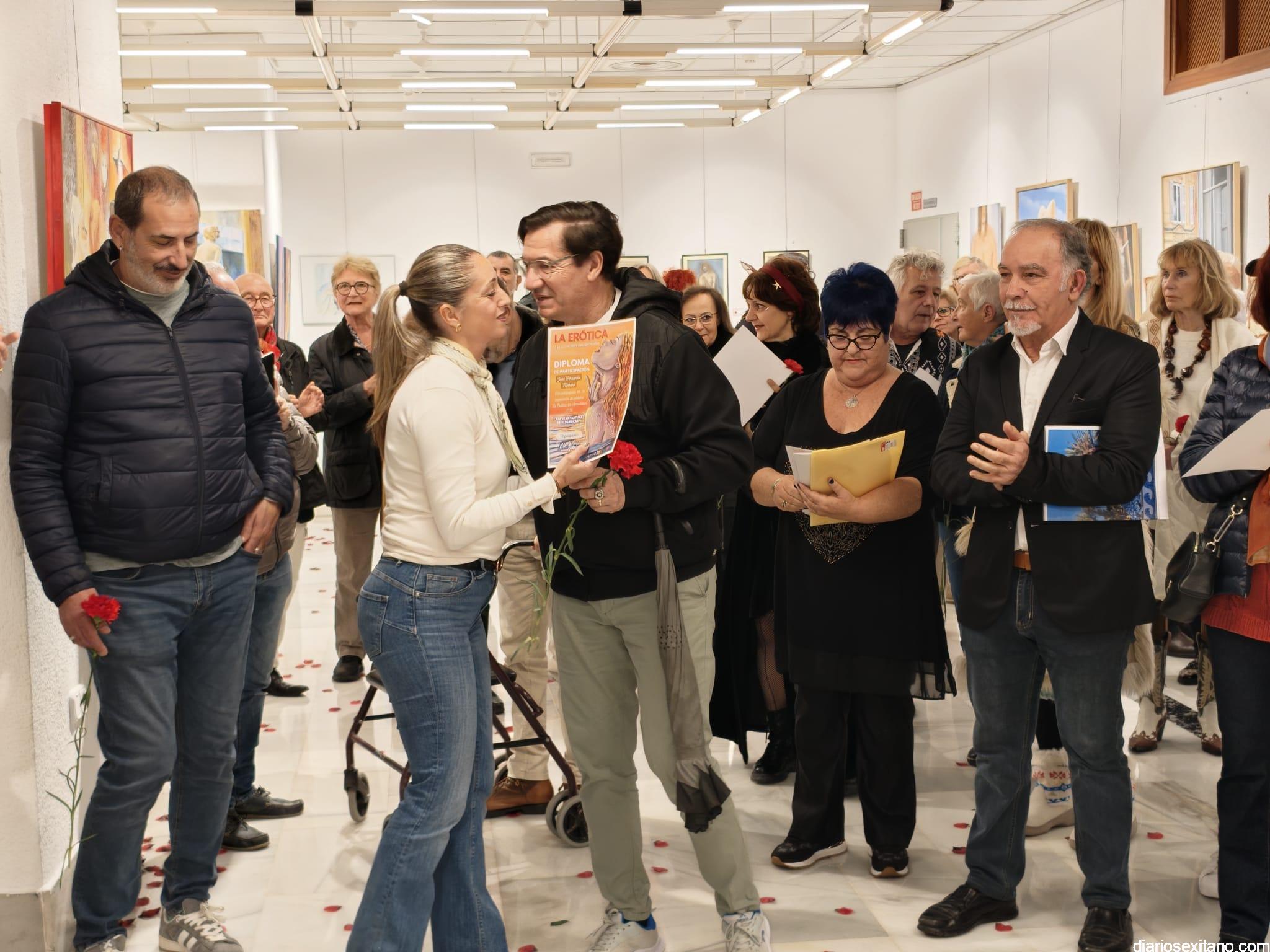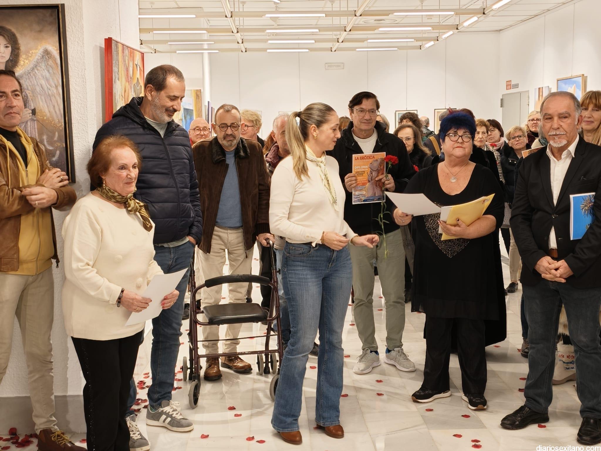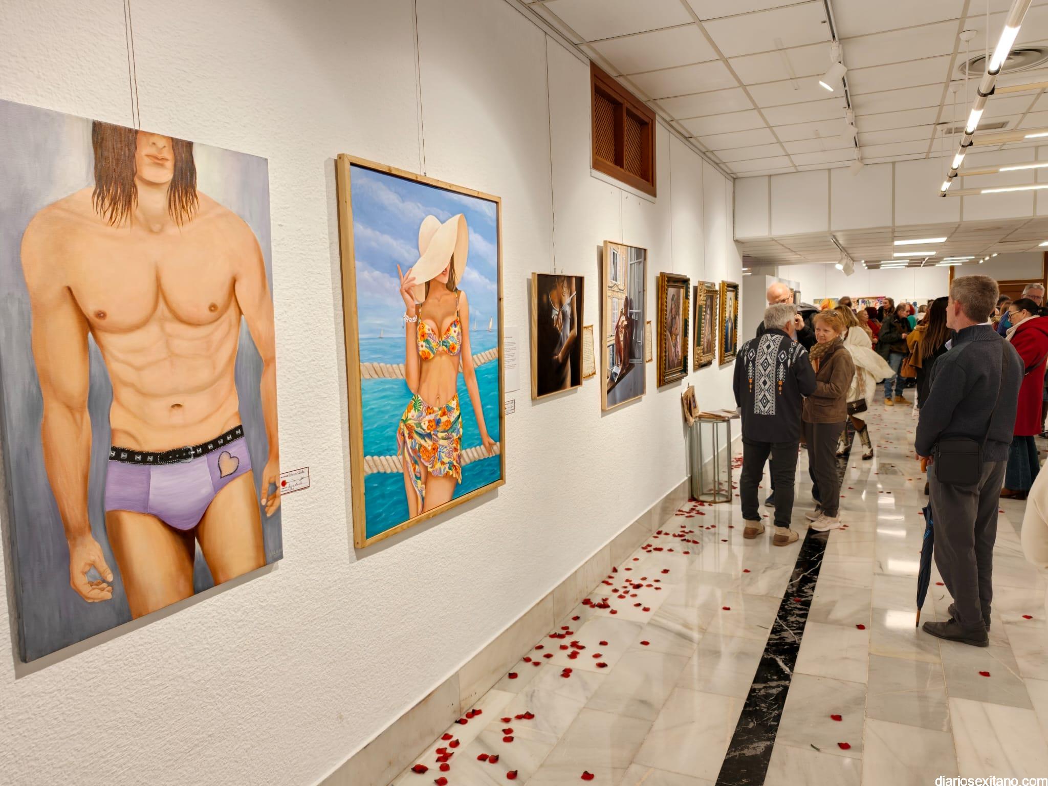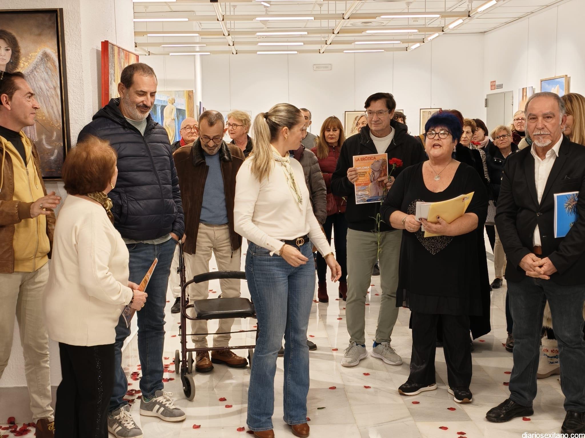 La sala de exposiciones de la Casa de la Cultura de Almuñécar se llenó de público con motivo de la inauguración de la muestra colectiva artística “La Erótica”, que reúne trabajos de una veintena de artistas.